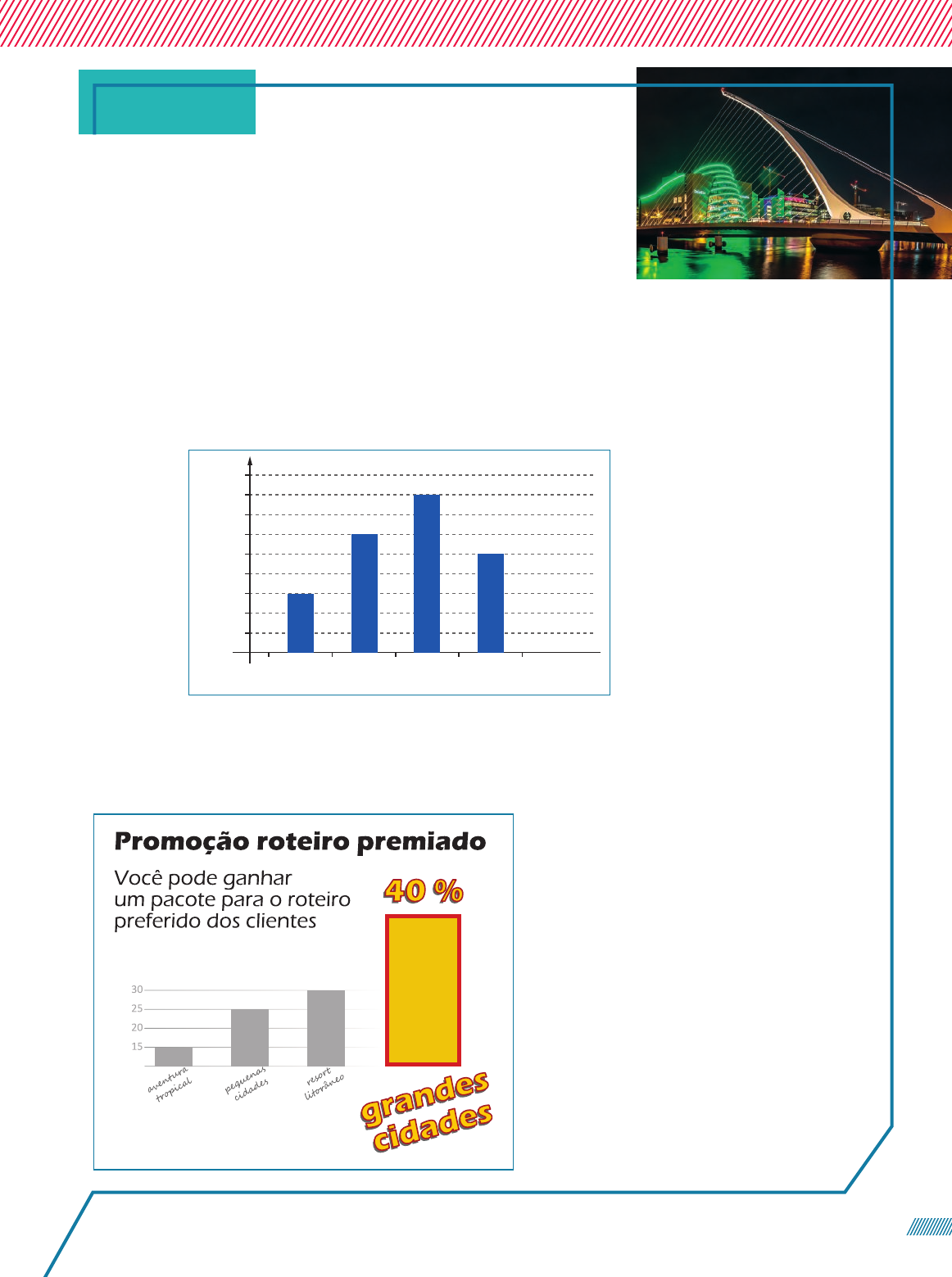 Situação 2 A ponte Samuel Beckett, retratada na imagem e apelidada de harpa, é uma ponte estaiada situada em Dublin, capital da Irlanda. Seu nome remete ao dramaturgo irlandês Samuel B. Beckett (1906-1989), autor de dezenas de peças, livros e roteiros de filmes. Foto de 2020. Pacotes de viagem Uma agência de turismo pretende sortear um pacote de viagem entre seus clientes. Para isso, decide fazer uma pesquisa a fim de descobrir qual é o estilo de viagem favorito da clientela. As opções de pacotes que serão sorteados são as seguintes: • Roteiro aventura tropical, incluindo Joanesburgo, na África do Sul. • Roteiro resort litorâneo, incluindo Maragogi, em Alagoas. • Roteiro grandes cidades, incluindo Dublin, na Irlanda. • Roteiro pequenas cidades, incluindo Kursk, na Rússia. A pessoa responsável por coletar os dados entrou em contato com todos os clientes do banco de dados da agência e, com os dados obtidos, elaborou o gráfico apresen- tado abaixo. Roteiro preferido dos clientes aventura tropical resort litorâneo 10 15 5 0 Q u a n t id a d e d e c li e n t e s Roteiro 20 25 30 35 40 45 grandes cidades pequenas cidades Gráfico elaborado para fins didáticos. O dono da agência, no entanto, achou o gráfico pouco representativo e, em parce- ria com um publicitário, fez algumas modificações que resultaram na seguinte imagem para a campanha da agência de viagens: Não escreva no livro. b) Exemplo de resposta: É uma maneira de representar visualmente um conjunto de dados, que permite comparar rapidamente as diferentes categorias, identificando, por exemplo, a que obteve mais votos e a que obteve menos votos. B a n c o d e i m a g e n s /A rq u iv o d a e d it o ra W Y M D e s ig n /A rq u iv o d a e d it o ra mikemike10/Shutterstock a) De acordo com os dados apresentados, qual é o roteiro preferido dos clientes? b) Qual é a vantagem de utilizar um gráfico para representar os dados? c) O que você achou do gráfico após as mo- dificações feitas pelo dono da agência? Há alguma indicação ou informação errada? d) Você já viu gráficos com imprecisões ou informações erradas na mídia? Como você pode averiguar a integridade dessas informações? O roteiro grandes cidades. Resposta pessoal. Resposta pessoal. 13 008a031_V6_MATEMATICA_Dante_g21At_Cap1_LA.indd 13008a031_V6_MATEMATICA_Dante_g21At_Cap1_LA.indd 13 18/09/2020 10:3718/09/2020 10:37 População e amostra Como vimos nas situações anteriores, o uso da pesquisa estatística é bastante comum nas várias ativida- des humanas. As pesquisas fornecem as informações necessárias para embasar as tomadas de decisão. Por exemplo, a partir de uma pesquisa os governantes podem identificar áreas prioritárias de investimento em educação, transporte, saúde, segurança pública, habitação, assistência social, acessibilidade, entre outros importantes setores. Desse modo, o objetivo de uma pesquisa é extrair informações de dados coletados para obter uma melhor compreensão das situações que eles retratam. Mas não são apenas os governantes e o setor público que realizam pesquisas. Para identificar, por exem- plo, qual é o melhor produto a ser lançado no mercado e qual é o preço ideal a ser cobrado, uma empresa pode – e deve – realizar previamente uma pesquisa envolvendo seus clientes ou possíveis compradores. A realização de uma pesquisa envolve algumas etapas, como a escolha da amostra, a coleta e a organi- zação dos dados, a apresentação desses dados (em tabelas, gráficos, etc.) e a interpretação dos resultados. O ramo da Matemática que trata desses assuntos é a Estatística. Neste capítulo, vamos estudar noções de Estatística. Em uma pesquisa estatística, o conjunto de elementos que apresenta a caracte- rística que temos interesse, chamamos de população ou universo estatístico. Mas nem sempre, quando realizamos um estudo estatístico, é possível consultar toda a população com que pretendemos realizar o estudo. Quando isso ocorre, utilizamos uma amostra da população para obter os dados a serem investigados, ou seja, um Situação 3 Não escreva no livro. GO DESIGN/Shutterstock Todo elemento da população é chamado de indivíduo. Fique atento Totem utilizado para realizar pesquisa de satisfação do atendimento. Pesquisa de satisfação Na entrada ou próximo ao caixa de alguns estabelecimentos, há um totem ou um tablet que é usado para realizar uma pesquisa de satisfação com os clientes. O objetivo pode ser avaliar o atendimento do estabelecimento, a qualidade dos produtos, se o consumidor en- controu o que queria, entre outros. Essa pesquisa de satisfação enquadra-se nos estudos da Estatística, e existem diversas formas de analisar os resultados obtidos. Suponha que uma pesquisa de satisfação foi realizada com 50 clientes de uma loja, que avaliaram o atendimento atribuindo-lhe notas de 1 a 10. A tabela abaixo apresenta o resultado dessa pesquisa. Avaliação do atendimento de uma loja Notas 1 2 3 4 5 6 7 8 9 10 Quantidade de votos 2 1 3 3 5 5 7 7 8 9 Tabela elaborada para fins didáticos. Para transformar essas notas em um conceito para a loja, optou-se por dividi-las em intervalos. As notas 1 e 2 foram classificadas com o conceito “insatisfatório”; 3 a 5, com o conceito “regular”; 6 a 8, com o conceito “bom”; e 9 e 10, com o conceito “excelente”. a) De acordo com os dados apresentados, quantos votos recebeu cada conceito? b) Faça uma tabela no caderno para representar a quantidade de votos recebida por cada conceito. A tabela encontra-se nas Orientações específicas deste Manual. c) Utilizando a tabela construída no item anterior, responda: Qual foi o conceito mais atribuído ao atendimento dessa loja? Bom. Insatisfatório: 3 votos; regular: 11 votos; bom: 19 votos; excelente: 17 votos. 14 008a031_V6_MATEMATICA_Dante_g21At_Cap1_LA.indd 14008a031_V6_MATEMATICA_Dante_g21At_Cap1_LA.indd 14 18/09/2020 10:3718/09/2020 10:37