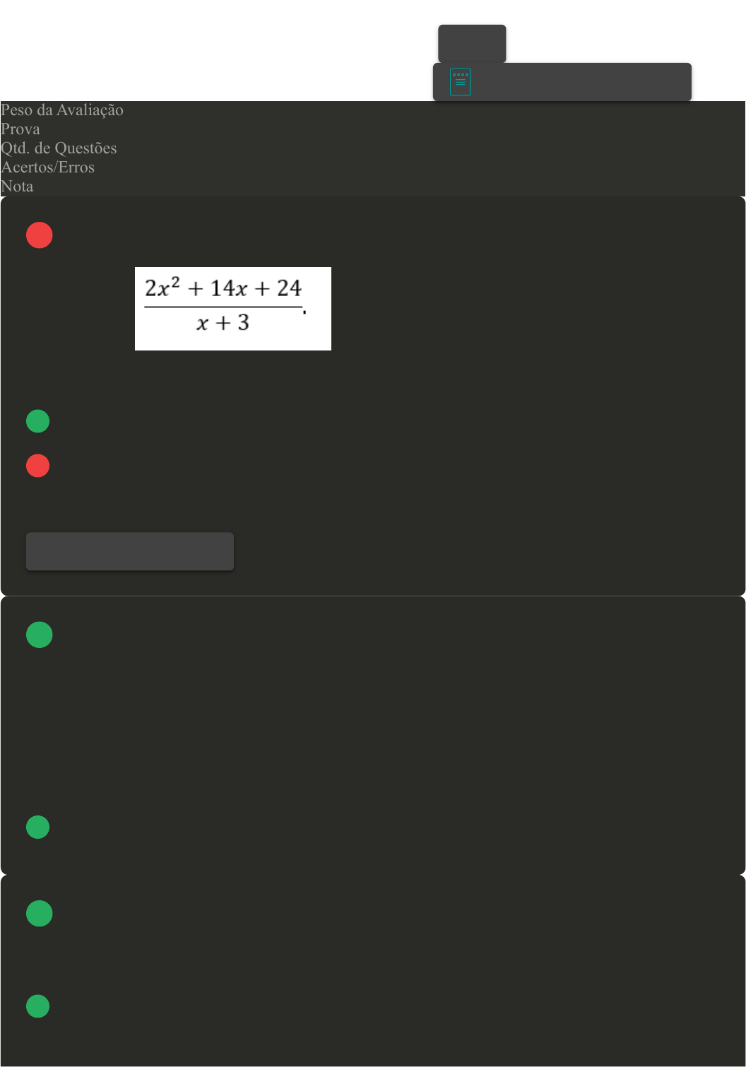 Prova Impressa GABARITO | Avaliação Final (Objetiva) - Individual (Cod.:955140) Peso da Avaliação 4,00 Prova 84464703 Qtd. de Questões 10 Acertos/Erros 7/3 Nota 7,00 Na teoria de Cálculo, estudamos limites e para calcularmos, muitas vezes, precisamos utilizar recursos como divisão de polinômios ou produtos notáveis. Utilizando estes recursos, simplifique a fração algébrica A 2x + 14. B 2x + 8. C 16x + 8. D x + 8. Calcule a multiplicação a seguir: 4 acz2 . 8 bdz3Assinale a alternativa CORRETA: A - 32 abcdz5. B 32 abcdz. C 32 dz5. D 32 abcdz5. Podemos representar os números racionais na forma de fração ou na forma de número decimal (os números com vírgula). Com relação à fração 9/2, assinale a alternativa CORRETA: A Pode ser representada na forma decimal finita igual a 4,5. B Pode ser representada na forma decimal periódica igual a 4,5. VOLTAR A+ Alterar modo de visualização 1 Revisar Conteúdo do Livro 2 3 05/07/2024, 20:05 Avaliação Final (Objetiva) - Individual about:blank 1/4 C Pode ser representada na forma decimal periódica igual a 4,555... D Pode ser representada na forma decimal finita igual a 4,555... Uma equação modular é toda equação onde pelo menos uma variável se apresenta em módulo, sendo assim, sua resolução baseia-se na definição de módulo. Calcule a equação |- 2x + 4| = 10. Assinale a alternativa CORRETA: A As soluções da equação modular são x = 3 e x = - 7. B As soluções da equação modular são x = 3 e x = 7. C As soluções da equação modular são x = - 3 e x = 7. D As soluções da equação modular são x = - 3 e x = - 7. Uma bola de gude foi lançada para cima percorrendo uma trajetória representada pela função y = -x² + 2x + 1. Qual foi a altura máxima, em metros, atingida pela bola de gude? A 1 metro. B 6 metros. C 8 metros. D 2 metros. Uma função do 2º grau y = ax² + bx + c pode admitir valor máximo e valor mínimo, de acordo com o coeficiente a. Das funções a seguir, em qual delas a função admite valor máximo? A f(x) = x² + 18x B f(x) = 2x² + 6x + 5 C f(x) = (8x - 7) . (-9x + 3) D f(x) = (x - 30).(x + 3) Dizemos que os polinômios p(x) e q (x) são iguais se, e somente se, os seus coeficientes são ordenadamente iguais. Para que os polinômios p e q abaixo sejam iguais, qual deve ser o valor de a e 4 5 6 7 05/07/2024, 20:05 Avaliação Final (Objetiva) - Individual about:blank 2/4 b? A a = 1 e b = 1. B a = 1 e b = 2. C a = 2 e b = 2. D a = 2 e b = 1. Dizemos que uma função é par quando satisfaz a igualdade f(x) = f(-x) para todo x do domínio. Já uma função é ímpar quando satisfaz a igualdade f(x) = - f(-x) para todo x do seu domínio. Utilizando essas definições, podemos afirmar que a função A Não é par nem ímpar. B É ímpar. C É par e ímpar ao mesmo tempo. D É par. Uma pesquisa realizada em certa região do país mostrou que a população vem decrescendo conforme o passar dos anos. Diante disso, calcule quantos anos a população daquela região leva para chegar a uma população igual a quarta parte da população inicial, sabendo que a população inicial era 10.000 e, o decaimento é dado pela equação: P = 10000 . 2-0,25t. Assinale a alternativa CORRETA: A 12 anos. B 8 anos. C 10 anos. D 6 anos. Revisar Conteúdo do Livro 8 Revisar Conteúdo do Livro 9 05/07/2024, 20:05 Avaliação Final (Objetiva) - Individual about:blank 3/4 Os acadêmicos do curso de Licenciatura organizaram uma ação solidária de final de ano, devendo cada um contribuir com R$135,00. Como 7 acadêmicos não puderam contribuir e a ação terá as mesmas despesas, cada um dos estudantes restantes teria de pagar R$27,00 a mais. No entanto, um colaborador anônimo, para ajudar, colaborou com R$630,00. Quanto pagou cada aluno participante da festa? Assinale a alternativa CORRETA: A R$ 136,00. B R$ 138,00. C R$ 144,00. D R$ 140,00. 10 Imprimir 05/07/2024, 20:05 Avaliação Final (Objetiva) - Individual about:blank 4/4