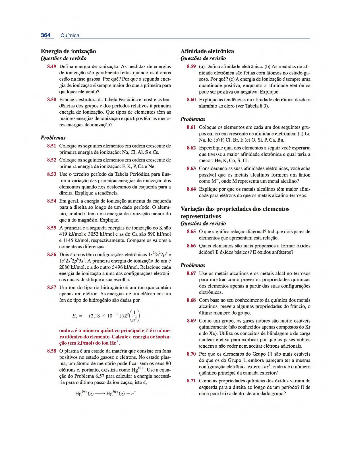 364 Química Energia de íonízação Questões de revisão 8.49 Defina energia de ionização. As medidas de energias de ionização são geralmente feitas quando os átomos estão na fase gasosa. Por quê? Por que a segunda ener gia de ionização é sempre maior do que a primeira para qualquer elemento? 8.50 Esboce a estrutura da Tabela Periódica e mostre as ten dências dos grupos e dos períodos relativos à primeira energia de ionização. Que tipos de elementos têm as maiores energias de ionização e que tipos têm as meno res energias de ionização? Problemas 8.51 Coloque os seguintes elementos em ordem crescente de primeira energia de ionização: Na, Cl, Al, S e Cs. 8.52 Coloque os seguintes elementos em ordem crescente de primeira energia de ionização: F, K, P, Ca e Ne. 8.53 Use o terceiro período da Tabela Periódica para ilus trar a variação das primeiras energias de ionização dos elementos quando nos deslocamos da esquerda para a direita. Explique a tendência. 8.54 Em geral, a energia de ionização aumenta da esquerda para a direita ao longo de um dado período. O alumí nio, contudo, tem uma energia de ionização menor do que a do magnésio. Explique. 8.55 A primeira e a segunda energias de ionização do K são 419 kJ/mol e 3052 kJ/mol e as do Ca são 590 kJ/mol e 1145 kJ/mol, respectivamente. Compare os valores e comente as diferenças. 8.56 Dois átomos têm configurações eletrônicas \s^2s^2p^ e \s^2s^2p^2s^. A primeira energia de ionização de um é 2080 kJ/mol, e a do outro é 496 kJ/mol. Relacione cada energia de ionização a uma das configurações eletrôni cas dadas. Justifique a sua escolha. 8.57 Um íon do tipo do hidrogênio é um íon que contém apenas um elétron. As energias de um elétron em um íon do tipo do hidrogênio são dadas por E„ = -(2 ,18 X 10“'̂ onde n é o número quântico principal e Z é o núme ro atômico do elemento. Calcule a energia de ioniza ção (em kJ/mol) do íon He .̂ 8.58 O plasma é um estado da matéria que consiste em íons positivos no estado gasoso e elétrons. No estado plas ma, um átomo de mercúrio pode ficar sem os seus 80 elétrons e, portanto, existiría como Use a equa ção do Problema 8.57 para calcular a energia necessá ria para o último passo da ionização, isto é. Afinidade eletrônica Questões de revisão 8.59 (a) Defina afinidade eletrônica, (b) As medidas de afi nidade eletrônica são feitas com átomos no estado ga soso. Por quê? (c) A energia de ionização é sempre uma quantidade positiva, enquanto a afinidade eletrônica pode ser positiva ou negativa. Explique. 8.60 Explique as tendências da afinidade eletrônica desde o alumínio ao cloro (ver Tabela 8.3). Problemas 8.61 Coloque os elementos em cada um dos seguintes gru pos em ordem crescente de afinidade eletrônica: (a) Li, Na, K; (b) F, Cl, Br, I; (c) O, Si, P, Ca, Ba. 8.62 Especifique qual dos elementos a seguir você esperaria que tivesse a maior afinidade eletrônica e qual teria a menor: He, K, Co, S, Cl. 8.63 Considerando as suas afinidades eletrônicas, você acha possível que os metais alcalinos formem um ânion como M “ , onde M representa um metal alcalino? 8.64 Explique por que os metais alcalinos têm maior afini dade para elétrons do que os metais alcaUno-terrosos. Variação das propriedades dos elementos representativos Questões de revisão 8.65 O que significa relação diagonal? Indique dois pares de elementos que apresentam esta relação. 8.66 Quais elementos são mais propensos a formar óxidos ácidos? E óxidos básicos? E óxidos anfóteros? Problemas 8.67 Use os metais alcalinos e os metais alcalino-terrosos para mostrar como prever as propriedades químicas dos elementos apenas a partir das suas configurações eletrônicas. 8.68 Com base no seu conhecimento da química dos metais alcalinos, preveja algumas propriedades do frâncio, o último membro do grupo. 8.69 Como um grupo, os gases nobres são muito estáveis quimicamente (são conhecidos apenas compostos do Kr e do Xe). Utilize os conceitos de blindagem e de carga nuclear efetiva para explicar por que os gases nobres tendem a não ceder nem aceitar elétrons adicionais. 8.70 Por que os elementos do Grupo 11 são mais estáveis do que os do Grupo 1, embora pareçam ter a mesma configuração eletrônica externa ns ,̂ onde n é o número quântico principal da camada exterior? 8.71 Como as propriedades químicas dos óxidos variam da esquerda para a direita ao longo de um período? E de cima para baixo dentro de um dado grupo?Hg''^(g)---- >ng^^^{g) + e- Capítulo 8 ♦ Relações periódicas entre os elementos 365 8.72 Escreva as equações balanceadas para as reações en tre cada um dos óxidos a seguir e a água: (a) LÍ2O, (b) CaO, (c) SO3. 8.73 Escreva as fórmulas e o nome dos compostos binários de hidrogênio dos elementos do segundo período (Li a F). Descreva como as propriedades físicas e químicas destes compostos variam da esquerda para a direita ao longo do período. 8.74 Qual é o óxido mais básico, MgO ou BaO? Por quê? Problemas adicionais 8.75 Diga se cada uma das propriedades dos elementos re presentativos aumenta ou diminui geralmente (a) da esquerda para a direita ao longo do período e (b) de cima para baixo dentro de um dado grupo: caráter me tálico, tamanho atômico, energia de ionização, acidez dos óxidos. 8.76 Recorrendo à Tabela Periódica, dê o nome de (a) um elemento halogênio do quarto período, (b) um elemen to semelhante ao fósforo em propriedades químicas, (c) o metal mais reativo do quinto período, (d) um ele mento que tem o número atômico menor do que 2 0 e é semelhante ao estrôncio. 8.77 Escreva as equações que representam os seguintes pro cessos: (a) A afinidade eletrônica do S“ . (b) A terceira energia de ionização do titânio. (c) A afinidade eletrônica do Mĝ "̂ . (d) A energia de ionização do 0 “̂ . 8.78 Liste todos os íons comuns dos elementos representa tiv