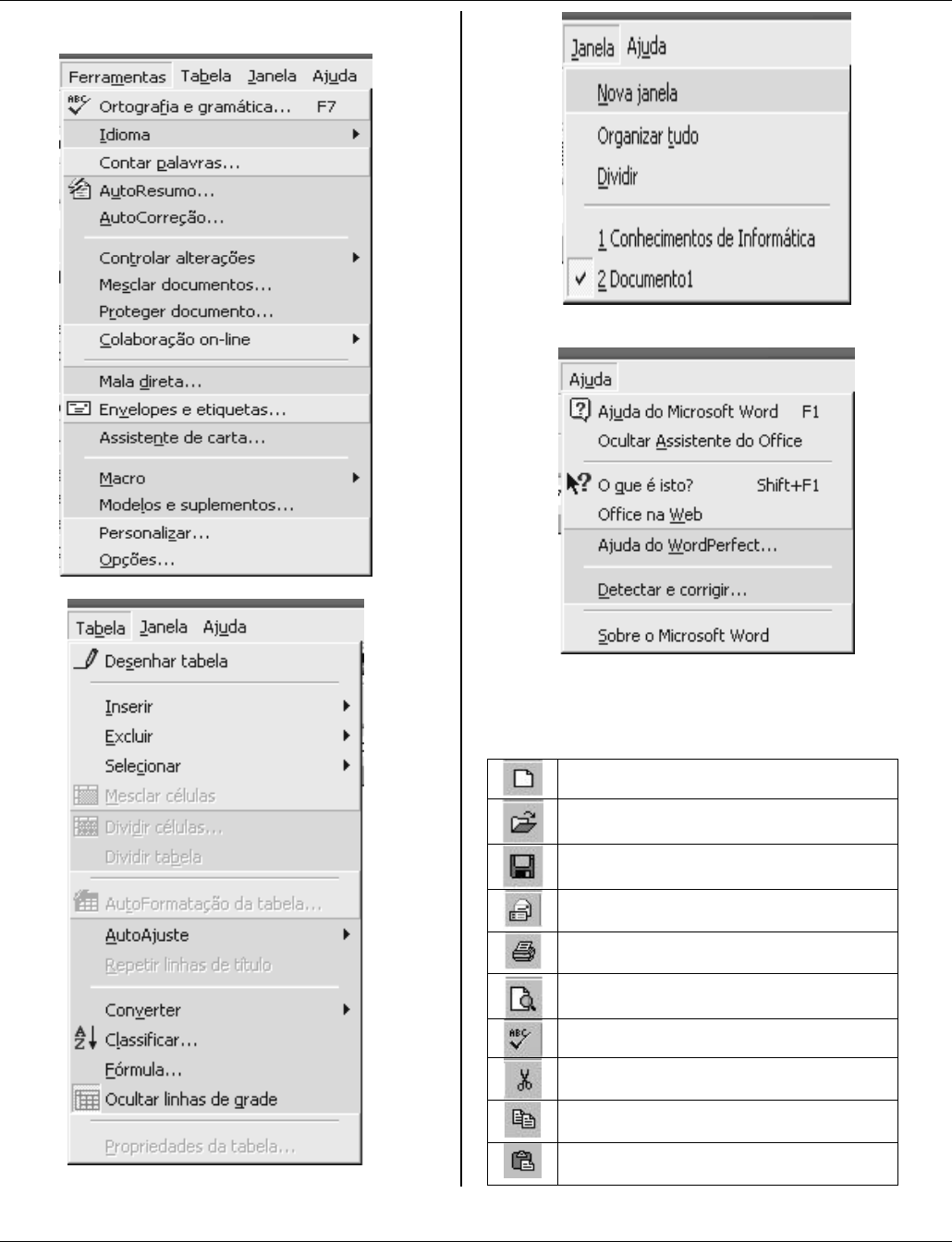 APOSTILA DE INFORMÁTICA Figura 20 – Menu Formatar Figura 21 – Menu Ferramentas Figura 22 – Menu Tabela Figura 23 – Menu Janela Figura 24 – Menu Ajuda A tabela a seguir mostra um esboço dos botões presentes nas barras de ferramentas padrão e formatação. Barra de ferramentas padrão: Novo documento em branco Abrir (Abre uma janela para procurar os arquivos nos diretórios do micro). Salvar (Salva as últimas alterações feitas). Correio Eletrônico( permite enviar o documento em edição por e-mail). Imprimir (manda todo o documento em edição para a impressão). Visualizar impressão. Correção ortográfica e gramatical. Recortar (Recorta parte de um texto ou uma figura selecionada). Copiar (Copia na área de transferência um objeto selecionado). Colar (Busca objeto na área de transferência para colar). 24