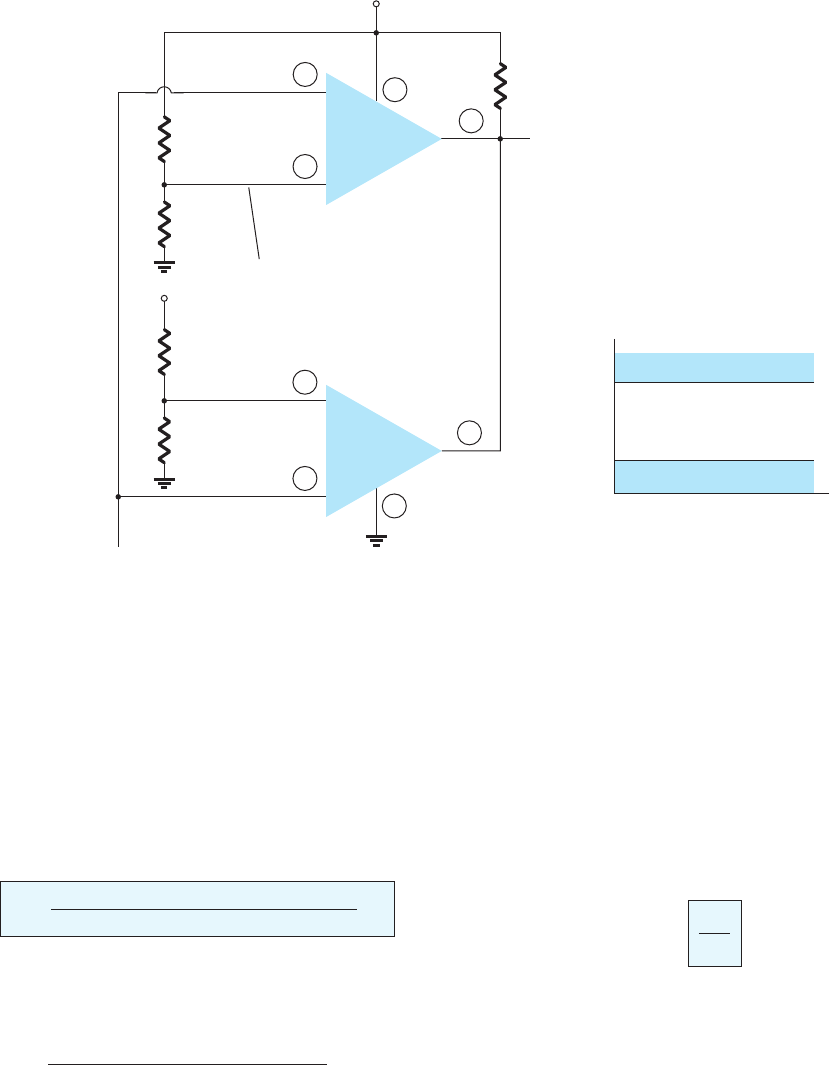 aceita a entrada de valores binários em, geralmente, 0 V ou Vref e fornece uma tensão de saída proporcional ao valor binário de entrada. A Figura 13.12(a) mostra um circuito em escada com quatro tensões de entrada representando 4 bits de dados digitais e uma tensão de saída CC. A tensão de saída é proporcional ao valor de entrada digital dada pela relação: Vo = D0 × 20 + D1 × 21 × D2 × 22 + D3 × 23 24 Vref (13.1) No exemplo mostrado na Figura 13.12(b), a tensão de saída resultante é: Vo = 0 × 1 + 1 × 2 + 1 × 4 + 0 × 8 16 (16 V) = 6 V Portanto, o valor digital 01102 é convertido em 6 V analógico. A função do circuito em escada é converter os 16 valores binários possíveis de 0000 a 1111 para um dos 16 valores de tensão múltiplos de Vref/16. A utilização de mais seções no circuito em escada possibilita que tenhamos mais entradas binárias e maior quantização de cada estágio. Por exemplo, um circuito em escada de 10 estágios poderia estender o número de degraus de tensão, ou resolução de tensão, para Vref/210, ou Vref/1024. A tensão de referência de Vref = 10 V apresentaria, então, degraus de tensão com valor de 10 V/1024 ou aproximadamente 10 mV. Um número maior de estágios permite maior re- solução de tensão. De modo geral, a resolução de tensão para n estágios em escada é: Vref 2n (13.2) A Figura 13.13 mostra um diagrama em bloco de um DAC típico que utiliza um circuito em escada. Esse circuito, chamado no diagrama de escada R-2R, encontra- -se entre a fonte de corrente de referência e as chaves de corrente conectadas a cada entrada binária. A corrente de saída resultante é proporcional ao valor binário de entrada. A entrada binária seleciona alguns ramos do circuito em escada, o que produz uma corrente de saída, que é o resultado de uma soma ponderada da corrente de referência. Conectar a corrente de saída através de um resistor resultará em uma tensão analógica, se assim for desejado. Saída +9 V 5,1 kΩ 1 kΩ 8,2 kΩ +9 V 9,1 kΩ 7,5 kΩ 1 2 +5 V +1 V Saída alta Vref1 ≅+ 5 V Vref2 ≅ +1 V + – 1 2 3 4 7 5 6 12+ – Entrada Saída baixa Saída baixa Figura 13.11 Operação de dois circuitos comparadores 339 como detector de janela. 606 Dispositivos eletrônicos e teoria de circuitos Boylestad_2012_cap13.indd 606 3/11/13 6:28 PM Conversão analógico-digital Conversão de dupla rampa Um método bastante utilizado para converter uma tensão analógica em uma tensão digital é o de dupla rampa. A Figura 13.14(a) mos- tra um diagrama em bloco do conversor básico de dupla rampa. A tensão analógica a ser convertida é aplicada atra- vés de uma chave eletrônica a um circuito integrador ou gerador de rampa (essencialmente uma corrente constante que carrega um capacitor para produzir uma tensão linear em rampa). A saída digital é obtida a partir de um contador que funciona durante ambos os intervalos de inclinação positiva e negativa do integrador. O método de conversão ocorre como segue. Para um intervalo de tempo fixo (geralmente a faixa de contagem completa do contador), a tensão analógica conectada ao integrador aumenta a tensão na entrada do comparador até um determinado valor positivo. A Figura 13.14(b) mostra que, no fim do intervalo fixo de tempo, a tensão do integrador é tanto maior quanto maior for a tensão de entrada. No fim do intervalo fixo de contagem, a conta- gem é ajustada para zero, e a chave eletrônica conecta o integrador a uma tensão de entrada fixa ou de referência. A saída do integrador (ou entrada do capacitor) decresce então a uma taxa fixa. O contador avança durante esse tempo, enquanto a saída do integrador diminui a uma taxa fixa até ficar abaixo da tensão de referência do compara- dor, ao mesmo tempo em que a lógica de controle recebe um sinal (a saída do comparador) para parar a contagem. O valor digital armazenado no contador é então a saída digital do conversor. O uso do mesmo clock e do mesmo integrador para realizar a conversão durante os intervalos de inclinação positiva e negativa tende a compensar os desvios da fre- quência de clock e as limitações de precisão do integrador. Selecionando o valor de entrada de referência e a taxa de clock, podemos graduar a saída do contador de acordo com o desejado. O contador pode ser binário, BCD ou outra forma de contador digital escolhida. Conversão com circuito em escada Outro mé- todo bastante conhecido de conversão analógico-digital utiliza um circuito em escada juntamente com circuitos Io Vref Chaves de corrente R-2R Escada Corrente de referência Entradas digitais Figura 13.13 CI conversor digital-analógico que utiliza circuito em escada R-2R. V (Saída analógica) Entrada digital o Figura 13.12 Circuito em escada de quatro estágios utilizado como conversor digital-analógico: (a) circuito básico; (b) exemplo de circuito com entrada 0110. Capítulo 13 CIs lineares/digitais 607 Boylestad_2012_cap13.indd 607 3/11/13 6:28 PM contadores e comparadores (veja a Figura 13.15). Um con- tador digital avança a partir de zero, enquanto um circuito em escada, acionado pelo contador, gera uma tensão em escada, como mostra a Figura 13.15(b), que aumenta em um incremento de tensão a cada passo de contagem. Um circuito comparador, recebendo a tensão em escada e a tensão de entrada analógica, fornece um sinal para parar a contagem quando a tensão da escada se eleva acima da tensão de entrada. O valor do contador nesse instante é a saída digital. O incremento de tensão do sinal em escada depende do número de bits de contagem utilizado. Um contador de 12 estágios operando um circuito em escada de 12 estágios, utilizando uma referência de 10 V, apresentaria um incremento de tensão igual a: Vref 212 = 10 V 4096 = 2,4 mV Isso resultaria em uma resolução de conversão de 2,4 mV. A taxa de clock do contador afetaria o tempo necessário para fazer uma conversão. Uma taxa de clock de 1 MHz ope