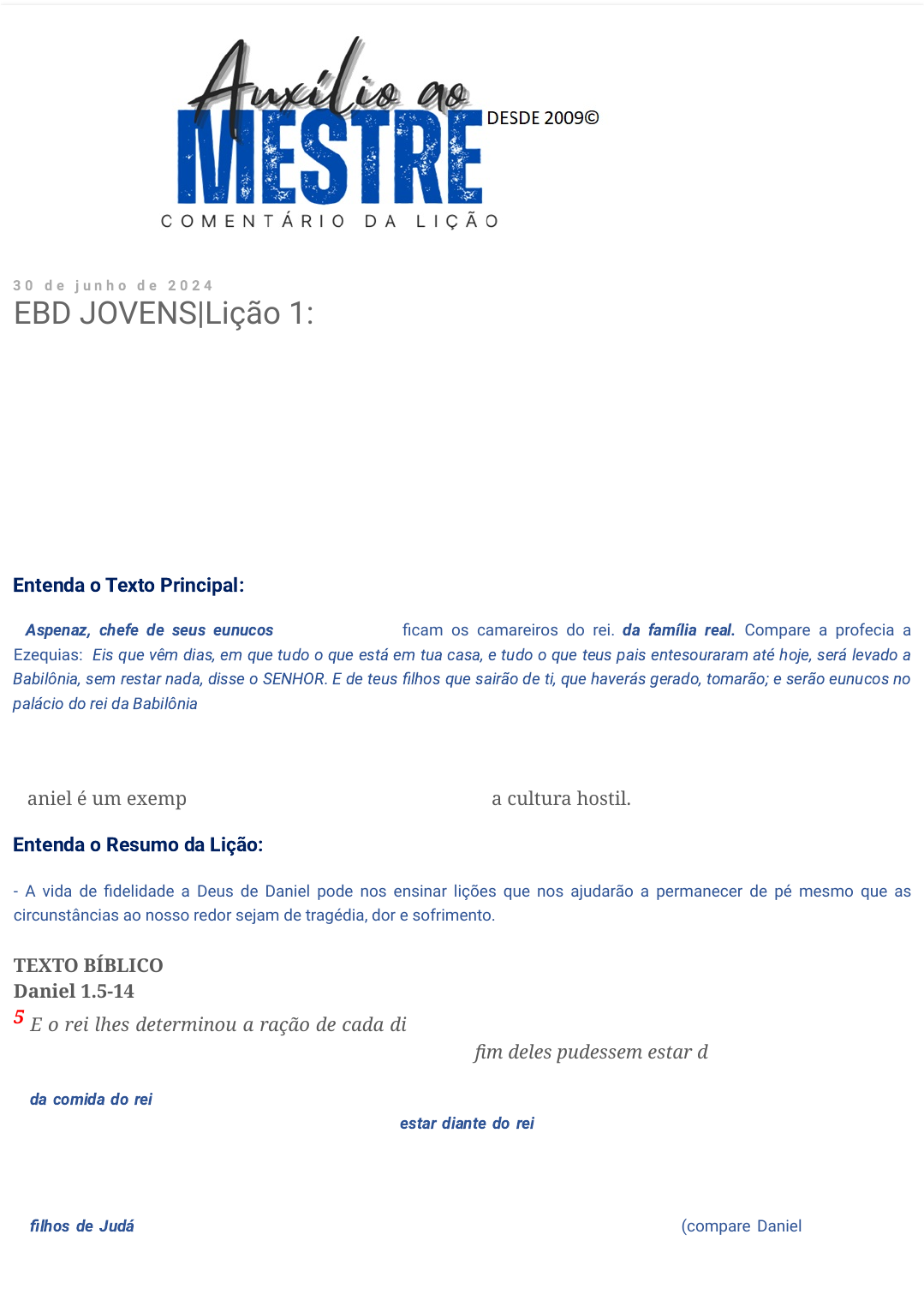 3 0 d e j u n h o d e 2 0 2 4 EBD JOVENS|Lição 1: Daniel: uma jornada de fidelidade|3° Trimestre de 2024 Pb Francisco Barbosa TEXTO PRINCIPAL “E disse o rei a Aspenaz, chefe dos seus eunucos, que trouxesse alguns dos filhos de Israel, e da linhagem real, e dos nobres.” (Dn 1.3) Entenda o Texto Principal: - Aspenaz, chefe de seus eunucos. “Eunucos” significam os camareiros do rei. da família real. Compare a profecia a Ezequias: “Eis que vêm dias, em que tudo o que está em tua casa, e tudo o que teus pais entesouraram até hoje, será levado a Babilônia, sem restar nada, disse o SENHOR. E de teus filhos que sairão de ti, que haverás gerado, tomarão; e serão eunucos no palácio do rei da Babilônia.” (2Reis 20:17-18). [JFU] RESUMO DA LIÇÃO Daniel é um exemplo inspirador de fidelidade em uma cultura hostil. Entenda o Resumo da Lição: - A vida de fidelidade a Deus de Daniel pode nos ensinar lições que nos ajudarão a permanecer de pé mesmo que as circunstâncias ao nosso redor sejam de tragédia, dor e sofrimento. TEXTO BÍBLICO Daniel 1.5-14 5 E o rei lhes determinou a ração de cada dia, da porção do manjar do rei e do vinho que ele bebia, e que assim fossem criados por três anos, para que no fim deles pudessem estar diante do rei. – da comida do rei – É comum um rei oriental entreter, da comida de sua mesa, muitos servos e cativos reais (Jeremias 52:33-34). O hebraico para “carne” implica iguarias. estar diante do rei – como cortesãos atendente; não como eunucos. [Fausset, aguardando revisão]. 6 E entre eles se achavam, dos filhos de Judá, Daniel, Hananias, Misael e Azarias. – filhos de Judá – a mais nobre tribo, sendo aquela a qual a “semente do rei” pertencia (compare Daniel 1:3). [Fausset, aguardando revisão]. https://auxilioebd.blogspot.com/?m=1 7 E o chefe dos eunucos lhes pôs outros nomes, a saber: a Daniel pôs o de Beltessazar, e a Hananias o de Sadraque, e a Misael, o de Mesaque, e a Azarias o de Abednego. – nomes. Um fator determinante no processo treinamento babilônio era a mudança de nome. Isso era feito para ligar os aprendizes aos deuses locais, em vez de apoiar a antiga lealdade religiosa deles. Daniel significa "Deus é o meu juiz", mas passou a ser chamado de Beltessazar, que significa "Bel protege o rei". Hananias significa "O Senhor é gracioso", mas teve o nome mudado para Sadraque, "Ordem de Aku", outro deus babilônio. Misael, que quer dizer "Quem é como o Senhor", recebeu o nome de Mesaque, "Quem é como Aku?". Finalmente, Azarias, "O Senhor é meu ajudador”, tornou-se Abede-Nego, ou seja, "Servo de Nego", também chamado de Nebo, deus da vegetação (cf. Is 46.1). 8 E Daniel assentou no seu coração não se contaminar com a porção do manjar do rei, nem com o vinho que ele bebia; portanto, pediu ao chefe dos eunucos que lhe concedesse não se contaminar. – As comidas e bebidas dos pagãos eram dedicadas aos ídolos. Regalar-se com elas seria entendido como honrar essas divindades. Daniel decidiu em seu coração (Pv 4.23) não fazer concessões para não ser infiel ao chamado de compromisso de Deus (cf. Êx 34.14-15). Além disso, alimentos que haviam sido proibidos pela lei (Lv 11) estavam entre os que os pagãos consumiam; partilhar deles implicava fazer concessões diretas (cf. Dn 1.12). Moisés também adotou essa postura (Hb 11.24-26), como também o fizeram o salmista (Sl 119.1151 e Jesus (Hb 7.26). Cf. 2Co 6.14-18; 2Tm 2.20. 9 Ora, deu Deus a Daniel graça e misericórdia diante do chefe dos eunucos. – Deus honrou a fidelidade e a lealdade de Daniel ao soberanamente agir de maneira favorável para com ele entre líderes pagãos. Nesse momento, isso evitou que ele fosse perseguido e fez com que fosse respeitado, embora, mais tarde, Deus tenha permitido que Daniel viesse a sofrer oposição, o que também o dignificou (Dn 3.6). De um modo ou de outro, Deus honra os que o honram (ISm 2.30; 2Cr 169). 10 E disse o chefe dos eunucos a Daniel: Tenho medo do meu senhor, o rei, que determinou a vossa comida e a vossa bebida; por que veria ele os vossos rostos mais tristes do que os jovens que são vosso iguais? Assim, arriscareis a minha cabeça para com o rei. – pior gosto – parecendo menos saudável. seu tipo – da sua idade ou classe; literalmente, “círculo”. poríeis minha cabeça em risco – Um déspota oriental arbitrário poderia, em um ataque de ira por suas ordens terem sido desobedecidas, ordenar que o ofensor fosse imediatamente decapitado. [Fausset, aguardando revisão] 11 Então, disse Daniel ao despenseiro a quem o chefe dos eunucos havia constituído sobre Daniel, Hananias, Misael e Azarias: – Melsar (“despenseiro” em algumas traduções). O mordomo, ou mordomo-chefe, encarregado por Aspenaz de fornecer a comida diária aos jovens (Gesenius). A palavra ainda está em uso na Pérsia. [JFU]. 12 Experimenta, peço-te, os teus servos dez dias, fazendo que se nos dê em legumes a comer e água a beber. – legumes. Essa palavra hebraica aparece na forma do plural no AT apenas aqui e no v. 16. EIa pode se referir a trigo ou cevada, ou a vegetais frescos. 13 Então, se examine diante de ti a nossa aparência e a aparência dos jovens que comem a porção do manjar do rei, e, conforme vires, te hajas com os teus servos. – Ilustrando Deuteronômio 8:3, “O homem não vive só de pão, mas de toda palavra que sai da boca do Senhor”. [Fausset, aguardando revisão] 14 E ele conveio nisso e os experimentou dez dias. – E ele consentiu-lhes nisto. O experimento foi tal, já que seria por tão pouco tempo, que ele correu pouco risco no assunto, como no final de dez dias ele supôs que seria fácil mudar seu modo de dieta se o experimento não fosse bem-sucedido. [JFU]. - OBS.: Todos os comentários, exceto os com citações, são da Bíblia de Estudo MacArthur, SBB, Edição de Janeiro de 2017) - Caso deseje, poderá baixar o MyBible: https://play.google.com/store/apps/det