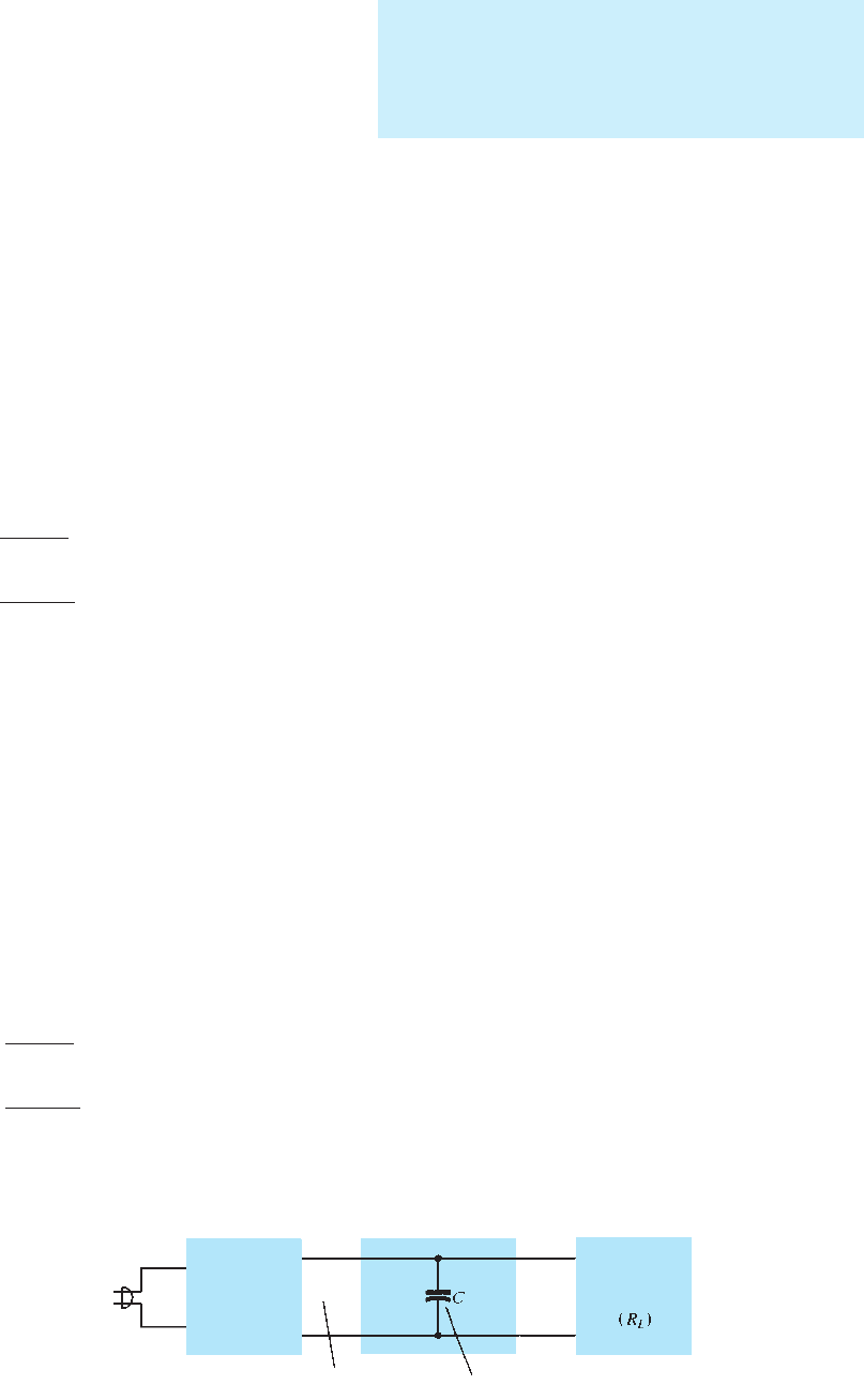 Fator de ondulação do sinal retificado Apesar de a tensão retificada não ser uma tensão filtrada, ela con- tém uma componente CC e uma componente de ondulação (ripple). Veremos adiante que o sinal retificado de onda completa tem uma componente CC maior e tem menos ondulação do que a tensão retificada de meia-onda. Meia-onda: Para um sinal retificado de meia-onda, a tensão CC de saída é: VCC = 0,318Vm (15.3) O valor rms da componente CA do sinal de saída pode ser calculado (veja o Apêndice C) como: Vr (rms) = 0,385Vm (15.4) A ondulação percentual de um sinal retificado de meia-onda pode, então, ser calculada como: r = Vr (rms) VCC × 100% = 0,385Vm 0,318Vm × 100% = %121 (15.5) Onda completa: Para uma tensão retificada de onda completa, o valor CC é: VCC = 0,636Vm (15.6) O valor rms da componente CA do sinal de saída pode ser calculado (veja o Apêndice C) como Vr (rms) = 0,308Vm (15.7) A ondulação percentual de um sinal retificado de onda completa pode, então, ser calculada como: r = Vr (rms) VCC × 100% = 0,308Vm 0,636Vm × 100% = %84 (15.8) Em suma, um sinal retificado de onda completa tem menos ondulação do que um sinal retificado de meia- -onda, e é, portanto, mais adequado para ser aplicado a um filtro. 15.3 filtro a CaPaCitor Um circuito de filtro muito comum é o que utiliza um simples capacitor, como mostra a Figura 15.3. Um capaci- tor é conectado na saída do retificador, e uma tensão CC é obtida em seus terminais. A Figura 15.4(a) mostra a tensão de saída de um retificador de onda completa antes de o sinal ser filtrado, e a Figura 15.4(b) mostra a forma de onda resultante após o capacitor ser conectado à saída do retifi- cador. Observe que a forma de onda filtrada é basicamente uma tensão CC com alguma ondulação (ou variação CA). A Figura 15.5(a) mostra um retificador de onda completa em ponte e a forma de onda na saída obtida do circuito para uma carga conectada (RL). Se não houvesse carga conectada aos terminais do capacitor, a forma de onda na saída seria idealmente um valor CC constante, com valor igual ao da tensão de pico (Vm) do circuito re- tificador. Entretanto, o propósito de se obter uma tensão CC é fornecer essa tensão para uso por vários circuitos eletrônicos, os quais se constituem em carga para a fonte de tensão. Uma vez que sempre haverá uma carga na saída do filtro, devemos considerar essa situação prática em nossa discussão. forma de onda na saída A Figura 15.5(b) mostra a forma de onda existente nos terminais de um filtro a capacitor. O tempo T1 é aquele durante o qual os diodos do retificador de onda completa conduzem, carregando o capacitor até a tensão de pico do retificador, Vm. O tempo T2 é o intervalo de tempo durante o qual a tensão do retificador cai abaixo da tensão de pico, e o capacitor descarrega através da carga. Como o ciclo de carga-descarga ocorre para cada meio ciclo em um retificador de onda completa, o período da forma de onda retificada é T/2. A tensão filtrada, como Entrada CA Carga CC Circuito retificador Saída do circuito retificador Filtro a capacitor Figura 15.3 Filtro básico a capacitor. 656 dispositivos eletrônicos e teoria de circuitos Boylestad_2012_cap15.indd 656 3/11/13 6:29 PM indica a Figura 15.6, mostra uma forma de onda na saí- da com um valor CC VCC e uma tensão de ondulação Vr (rms), resultado da carga e descarga do capacitor. Alguns detalhes sobre essas formas de onda e os elementos do circuito serão abordados mais adiante. Tensão de ondulação Vr (RMS) O Apêndice C mostra os detalhes na determinação do valor da tensão de ondulação em termos de outros parâmetros do circuito. A tensão de ondulação pode ser calculada a partir de Vr (rms) = ICC 4!3 fC = 2,4ICC C = 2,4VCC RLC (15.9) onde ICC está em miliampères, C está em microfarads e RL, em quilo-ohms. v CC Figura 15.5 Filtro a capacitor: (a) circuito do filtro a capacitor; (b) forma de onda da tensão de saída. v v Figura 15.4 Funcionamento do filtro a capacitor: (a) tensão na saída do retificador de onda completa; (b) tensão de saída filtrada. v CC Figura 15.6 Tensão de saída aproximada do circuito com filtro a capacitor. Capítulo 15 fontes de alimentação (reguladores de tensão) 657 Boylestad_2012_cap15.indd 657 3/11/13 6:29 PM eXeMPlo 15.3 Calcule a tensão de ondulação de um retificador de onda completa com um capacitor de filtro de 100 μF conectado a uma carga que drena 50 mA. solução: Equação 15.9: Vr (rms) = 2,4(50) 100 = 1,2 V Tensão CC VCC Do Apêndice C, podemos expressar o valor CC da forma de onda sobre os terminais do capacitor de filtro como VCC = Vm - ICC 4 fC = Vm - 4,17ICC C (15.10) onde Vm é a tensão de pico do retificador, ICC é a corrente de carga em miliampères e C é o capacitor de filtro em microfarads. eXeMPlo 15.4 Se o valor de pico da tensão retificada para o circuito de filtro no Exemplo 15.3 for igual a 30 V, calcule a tensão CC fornecida pelo filtro. solução: Equação 15.10: VCC = Vm - 4,17ICC C = 30 - 4,17(50) 100 = 27,9 V ondulação de um filtro a capacitor Utilizando a definição de ondulação (Equação 15.1), as equações 15.9 e 15.10, com VCC ≈ Vm, podemos obter a expressão para a ondulação da forma de onda na saída de um circuito retificador de onda completa com filtro a capacitor: r = Vr (rms) VCC × 100% = 2,4ICC CVCC × 100% = 2,4 RLC × %001 (15.11) onde ICC está em miliampères, C, em microfarads, VCC, em volts e RL, em quilo-ohms. eXeMPlo 15.5 Calcule a ondulação de um filtro a capacitor para uma tensão retificada com pico igual a 30 V. O valor do capa- citor é C = 50 μF, e a corrente de carga é igual a 50 mA. solução: Equação 15.11: r = 2,4ICC CVCC × 100% = 2,4(50) 100(27,9) × 100% = 4,3% Podemos também calcular a ondulação utilizando a definição básica: r = Vr (rms) VCC × 100% = 1,2 V 27,9 V × 100% = 4,3% Período de condução do diodo e corrente de pico do diodo A partir da disc
