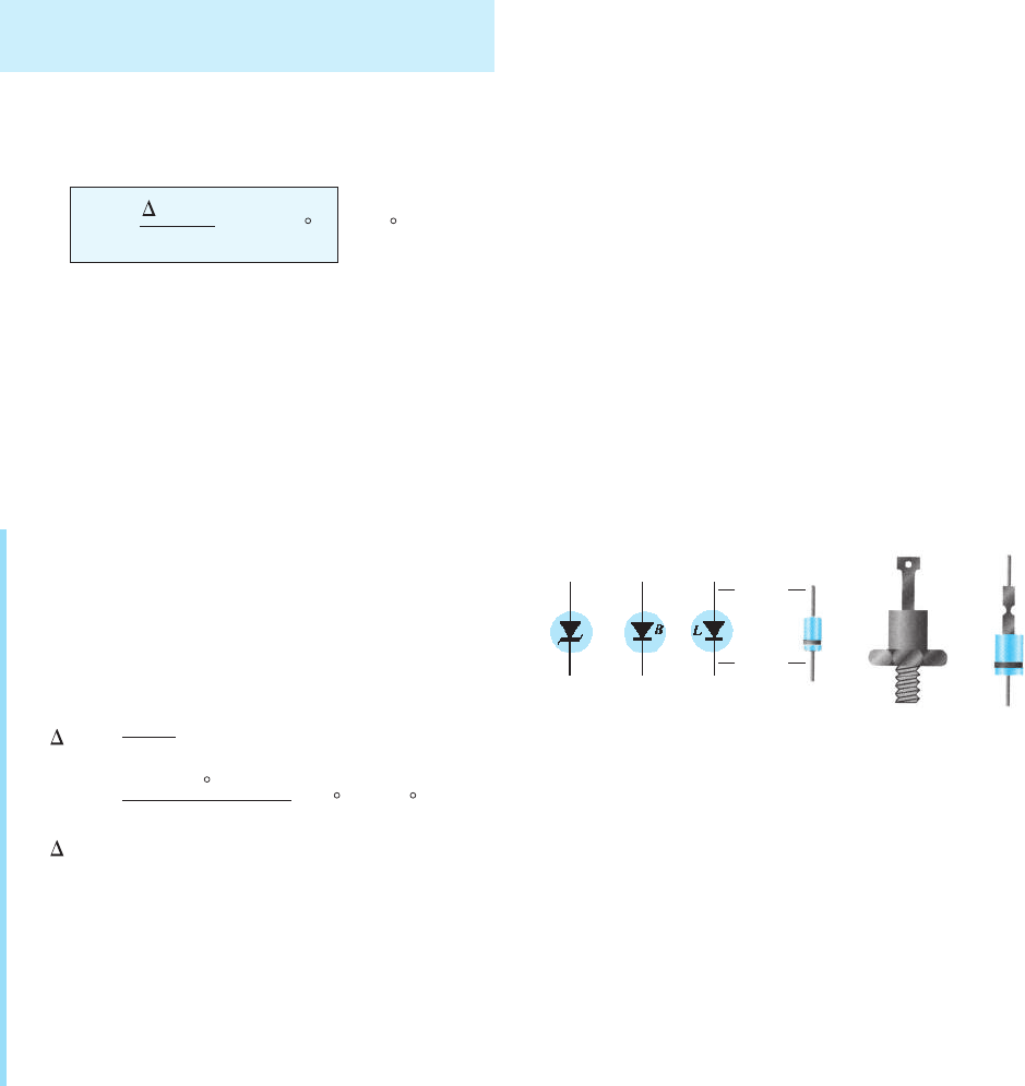 contínua que se pode querer sustentar no uso do diodo Zener em uma configuração de regulador. Por fim, temos o coeficiente de temperatura (TC) em porcentagem por grau centígrado. O potencial Zener de um diodo Zener é muito sen- sível à temperatura de operação. O coeficiente de temperatura pode ser utilizado para encontrar a alteração no potencial Zener devido a uma mudança de temperatura por meio da seguinte equação: TC = VZ /VZ T1 – T0 × 100%/ C (%/ )C (1.14) onde T1 é o novo valor da temperatura T0 é a temperatura ambiente em um gabinete fechado (25 °C) TC é o coeficiente de temperatura VZ é o potencial Zener nominal a 25 °C Para demonstrar o efeito do coeficiente de tempe- ratura sobre o potencial Zener, veja o exemplo a seguir. eXeMpLo 1.5 Analise o diodo Zener de 10 V descrito na Tabela 1.7, se a temperatura for elevada para 100 °C (ponto de ebulição da água). solução: Aplicando a Equação 1.14, obtemos VZ = TCVZ 100% (T1 – T0) = (0,072%/ C)(10 V) 100% (100 C – 25 )C VZ = 0,54 V e ΔVZ = 0,54V O potencial Zener resultante passa a ser VZ′ = VZ + 0,54 V = 10,54 V o que não é uma alteração desprezível. É importante compreender que, nesse caso, o coe- ficiente de temperatura foi positivo. Para diodos Zener com potenciais Zener inferiores a 5 V, é muito comum observar coeficientes de temperatura negativos, onde a tensão Zener cai mediante um aumento da temperatura. A Figura 1.48(a) fornece um gráfico de T versus corrente Zener para três níveis de diodo. Note que o diodo de 3,6 V tem um coeficiente de temperatura negativo, enquanto os outros apresentam valores positivos. A mudança na resistência dinâmica em função da corrente para o diodo Zener em sua região de avalanche é fornecida pela Figura 1.48(b). Novamente, temos um dia- grama dilog, que deve ser lido com atenção. Inicialmente, parece existir uma relação linear reversa entre a resistência dinâmica e a corrente Zener por causa da linha reta. Isso implicaria que, se a corrente for duplicada, a resistência cairá pela metade. Entretanto, é apenas o diagrama dilog que dá essa impressão, pois, se traçarmos a resistência dinâmica para o diodo Zener de 24 V versus a corrente utilizando escalas lineares, obteremos um gráfico quase exponencial na aparência. Observe que, em ambos os gráficos, a resistência dinâmica em correntes muito baixas que entra no joelho da curva é bem elevada, com cerca de 200 Ω. Por outro lado, em correntes Zener mais altas, longe do joelho, por exemplo, em 10 mA, a resistência dinâmica cai para cerca de 5 Ω. A identificação dos terminais e o encapsulamento de alguns diodos Zener são mostrados na Figura 1.49. Sob muitos aspectos, sua aparência é semelhante à do diodo padrão. Algumas áreas de aplicação para o diodo Zener serão examinadas no Capítulo 2. 1.16 diodos eMissores de LuZ O uso crescente de displays digitais em calcula- doras, relógios e todas as formas de instrumentação tem contribuído para um interesse cada vez maior em dispo- sitivos que emitem luz quando devidamente polarizados. Atualmente, os dois tipos de uso comum que realizam essa função são o diodo emissor de luz (LED — light- -emitting diode) e o display de cristal líquido (LCD — liquid-crystal display). Como o LED faz parte da família dos dispositivos de junção p-n e aparece em alguns dos circuitos nos próximos capítulos, ele será apresentado nes- te capítulo. O display LCD será descrito no Capítulo 16. Como o nome indica, o diodo emissor de luz (LED) é aquele que emite luz visível ou invisível (infravermelha) quando energizado. Em qualquer junção p-n polarizada diretamente, existe, dentro da estrutura e principalmente próximo da junção, uma recombinação de lacunas e elé- trons. Essa recombinação exige que a energia do elétron livre não ligado seja transferida para outro estado. Em todas Anodo Catodo Figura 1.49 Identificação e símbolos de terminais Zener. 36 dispositivos eletrônicos e teoria de circuitos Boylestad_2012_cap01.indd 36 3/11/13 5:31 PM as junções p-n semicondutoras, uma parte dessa energia será liberada na forma de calor e outra parte, na forma de fótons. Em diodos de Si e Ge, a maior porcentagem de energia convertida durante a recombinação na junção é dissipada na forma de calor no interior da estrutura, e a luz emitida é insignificante. Por essa razão, o silício e o germânio não são utiliza- dos na construção de dispositivos de LED. Por outro lado: Diodos de GaAs emitem luz (invisível) na zona de infravermelho durante o processo de recombinação na junção p-n. Ainda que a luz não seja visível, LEDs infraverme- lhos possuem inúmeras aplicações nas quais a luz visível não é um efeito desejável. Incluem-se aí sistemas de segu- rança, processamento industrial, acoplamento óptico, con- troles de segurança como abridores de porta de garagem e entretenimento doméstico, nos quais a luz infravermelha do controle remoto é o elemento controlador. Por meio de outras combinações de elementos, uma luz visível coerente pode ser gerada. A Tabela 1.9 fornece uma lista de semicondutores compostos comuns e a luz que eles emitem. Além disso, é listada a faixa típica de potenciais de polarização direta em cada caso. A construção básica de um diodo emissor de luz apa- rece na Figura 1.50 com o símbolo padrão utilizado para o dispositivo. A superfície de condução metálica externa conectada ao material do tipo p é menor para permitir a emersão do número máximo de fótons de energia de luz quando o dispositivo é polarizado diretamente. Observe que, na figura, a recombinação dos portadores injetados devido à junção de polarização direta resulta em luz emi- tida no local da recombinação. Pode haver, evidentemente, alguma absorção dos pacotes de energia do fóton na própria estrutura, mas uma porcentagem muito grande pode ser emitida, como mostra a figura. Tabela 1