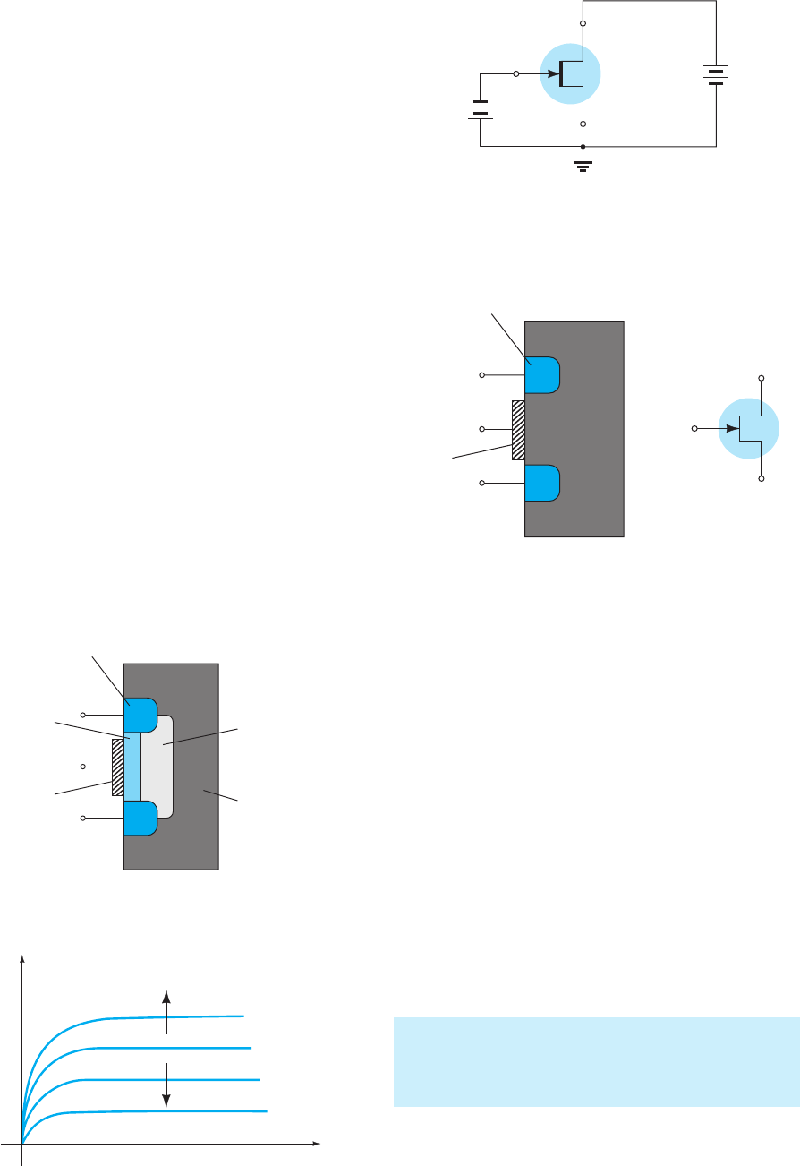 estrutura básica é fornecida na Figura 6.47. Nela obser- vamos que o terminal de porta está ligado diretamente a um condutor metálico em posição diretamente oposta ao canal n, que se estende entre os terminais de fonte e dreno. A única diferença em relação à estrutura do MOSFET tipo depleção é a ausência do isolante na porta. Quando uma tensão negativa é aplicada à porta, ela repele portadores livres negativos (elétrons) do canal para longe da superfí- cie de metal, reduzindo o número de portadores no canal. O resultado disso é uma corrente de dreno reduzida, como mostra a Figura 6.48, para valores crescentes de tensão negativa no terminal da porta. Para tensões positivas na porta, elétrons adicionais serão atraídos para o canal, e a corrente se elevará como vemos pelas características de dreno da Figura 6.48. O fato de as curvas características de dreno e a curva de transferência do MESFET tipo depleção serem tão semelhantes às do MOSFET do mesmo tipo resulta em técnicas de análise semelhantes às aplicadas aos MOSFETs tipo depleção. As polaridades e os sentidos reais definidos para o MESFET são fornecidos na Figura 6.49 juntamente com o símbolo para o dispositivo. Há também MESFETs tipo intensificação com uma estrutura igual à da Figura 6.47, mas sem o canal inicial, como mostra a Figura 6.50 juntamente com seu símbolo gráfico. A resposta e as características são essencialmente as mesmas que para o MOSFET do mesmo tipo. Contudo, devido à barreira Schottky na porta, a tensão de limiar positiva é limitada de 0 V até cerca de 0,4 V, pois a tensão necessária para ligar um diodo de barreira Schottky gira em torno de 0,4 V. Novamente, as técnicas de análise apli- cadas aos MESFETs tipo intensificação se assemelham às utilizadas para MOSFETs do mesmo tipo. É importante compreender, porém, que o canal deve ser um material do tipo n em um MESFET. A mobilidade das lacunas no GaAs é relativamente baixa em compara- ção com a dos portadores de carga negativa, o que acaba com a vantagem de utilizar GaAs em aplicações de alta velocidade. O resultado é: MESFETs tipo depleção e intensificação são feitos com um canal n entre o dreno e a fonte e, por conseguinte, ape- nas MESFETs do tipo n estão comercialmente disponíveis. Para ambos os tipos de MESFET, o comprimento do canal (identificado nas figuras 6.47 e 6.50) deve ser o mais curto possível para aplicações de alta velocidade. O comprimento mais usual está entre 0,1 μm e 1 μm. n n+ n+ p S G D Região do tipo p melhora desempenho Substrato Região fortemente dopada do tipo n Região levemente dopada do tipo n Metal (tungstênio) GaAs Figura 6.47 Estrutura básica de um MESFET de canal n. D S G DD– + GGV + – V Figura 6.49 Símbolo e arranjo básico de polarização para um MESFET de canal n. n+ n+ S G D Região fortemente dopada do tipo n Metal GaAs Substrato de D S G )b()a( Figura 6.50 MESFET tipo intensificação: (a) estrutura; (b) símbolo. ID VDS +0,5 V VGS = 0 V –0,5 V –1,0 V 0 – + Figura 6.48 Características de um MESFET de canal n. 346 dispositivos eletrônicos e teoria de circuitos Boylestad_2012_cap06.indd 346 3/11/13 5:53 PM 6.13 tabeLa-resuMo Visto que as curvas de transferência e algumas carac- terísticas importantes variam de um tipo de FET para ou- tro, a Tabela 6.3 foi elaborada para mostrar claramente as diferenças entre os dispositivos. Uma clara compreensão do significado de todas as curvas e de todos os parâmetros da tabela será suficiente para acompanhar as análises CC e CA feitas mais adiante. Estude e compreenda cada curva e sua composição e, então, estabeleça uma base para a comparação dos valores para os importantes parâmetros Ri e Ci de cada dispositivo. Tabela 6.3 Transistores de efeito de campo. Tipo Símbolo e relações básicas Curva de transferência Resistência e capacitância de entrada TEFJ ( canal n) Ri 7 100 M Ci: (1 - 10) Fp TEFSOM tipo depleção ( canal n) Ri 7 1010 Ci: (1 - 10) Fp TEFSOM tipo intensificação ( canal n) Ri 7 1010 Ci: (1 - 10) Fp TEFSEM tipo depleção ( canal n) Ri 7 1012 Ci: (1 - 5) Fp TEFSEM tipo intensificação ( canal n) Ri 7 1012 Ci: (1 - 5) Fp Capítulo 6 transistores de efeito de campo 347 Boylestad_2012_cap06.indd 347 3/11/13 5:53 PM 6.14 resuMo Conclusões e conceitos importantes 1. Um dispositivo controlado por corrente é aquele no qual uma corrente define as condições de operação do dispositivo, e um dispositivo controlado por tensão é aquele no qual uma tensão específica define as condições de operação. 2. O JFET pode realmente ser utilizado como um resistor controlado por tensão devido a uma sen- sibilidade específica da impedância dreno-fonte à tensão porta-fonte. 3. A corrente máxima para um JFET é chamada de IDSS e ocorre quando VGS = 0 V. 4. A corrente mínima para um JFET ocorre na tensão de pinch-off definida por VGS = VP. 5. A relação entre a corrente de dreno e a tensão porta- -fonte de um JFET é não linear e definida pela equa- ção de Shockley. À medida que o valor da corrente se aproxima de IDSS, a sensibilidade de ID a variações de VGS aumenta significativamente. 6. As características de transferência (ID versus VGS) são aquelas do dispositivo em si, e não são sensíveis ao circuito no qual o JFET é empregado. 7. Quando VGS = VP/2, ID = IDSS/4, e em um ponto em que ID = IDSS/2, VGS ≅ 0,3 V. 8. As condições máximas de operação são determi- nadas pelo produto da tensão porta-fonte e pela corrente do dreno. 9. Há dois tipos disponíveis de MOSFETs: de depleção e de intensificação. 10. O MOSFET tipo depleção possui as mesmas carac- terísticas de transferência de um JFET para correntes do dreno com valores até IDSS. Nesse ponto, as carac- terísticas de um MOSFET tipo depleção continuam para valores acima de IDSS, enquanto as do JFET terminam. 11. A seta no símbolo do JFET de canal n ou do MOSFET aponta sempre pa