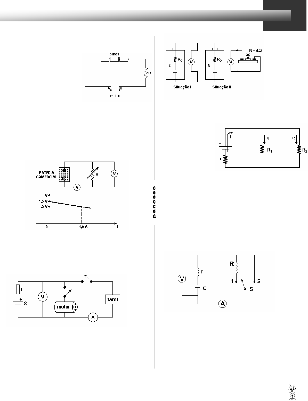 Gerador elétrico 1 Exercícios de Física 1) O circuito a seguir representa três pilhas ideais de 1, 5 V cada uma, um resistor R de resistência elétrica 1, 0 Ω e um motor, todos ligados em série. (Considere desprezível a resistência elétrica dos fios de ligação do circuito.). A tensão entre os terminais A e B do motor é 4, 0 V. Qual é a potência elétrica consumida pelo motor? a) 0, 5 W. b) 1, 0 W. c) 1, 5 W. d) 2, 0 W e) 2, 5 W. 2) (UERJ – 06) Uma bateria comercial de 1,5V é utilizada no circuito esquematizado a seguir, no qual o amperímetro e o voltímetro são considerados ideais. Varia-se a resistência R, e as correspondentes indicações do amperímetro e do voltímetro são usadas para construir o seguinte gráfico de voltagem (V) versus intensidade de corrente (I). Usando as informações do gráfico, calcule: a) o valor da resistência interna da bateria; b) a indicação do amperímetro quando a resistência R tem o valor 1,7Ω. 3) Quando se acendem os faróis de um carro cuja bateria possui resistência interna r(i) = 0,050Ω, um amperímetro indica uma corrente de 10A e um voltímetro uma voltagem de 12 V. Considere desprezível a resistência interna do amperímetro. Ao ligar o motor de arranque, observa-se que a leitura do amperímetro é de 8,0A e que as luzes diminuem um pouco de intensidade. Calcular a corrente que passa pelo motor de arranque quando os faróis estão acesos. 4) Uma bateria possui força eletromotriz E e resistência interna R0. Para determinar essa resistência, um voltímetro foi ligado aos dois pólos da bateria, obtendo-se V0 = E (situação I). Em seguida, os terminais da bateria foram conectados a uma lâmpada. Nessas condições, a lâmpada tem resistência R = 4 Ω e o voltímetro indica VA (situação II), de tal forma que V0 / VA = 1,2. Dessa experiência, conclui-se que o valor de R0 é a) 0,8 Ω b) 0,6 Ω c) 0,4 Ω d) 0,2 Ω e) 0,1 Ω 5) Um circuito e constituido por um gerador (E, r), e dois resistores R1 = 10 Ω e R2 = 15 Ω, conforme esquema.Sabendo que a intensidade i1 da corrente em R1 vale 0,60 A, as correntes no gerador e no resistor R2 têm intensidades, em amperes, respectivamente de a) 0,80 e 0,20 b) 1,0 e 0,40 c) 1,2 e 0,60 d) 1,6 e 1,0 e) 2,0 e 1,4 6) Para determinar a resistência interna r de uma pilha, de força eletromotriz E = 1,50V, um estudante monta o circuito adiante. Ele utiliza um resistor de resistência R, um voltímetro V e um amperímetro A. Com a chave S fechada na posição (1), o voltímetro e o amperímetro fornecem, respectivamente, as seguintes leituras: 1,45V e 0,50 A .Considerando o voltímetro e o amperímetro como sendo ideais e a resistência dos fios conectores desprezível, a) calcule a resistência interna r da pilha; b) calcule a resistência R; c) faça uma previsão de qual será a leitura no voltímetro quando a chave S estiver aberta, justificando sua resposta; d) determine as leituras no amperímetro e no voltímetro quando a chave S estiver fechada na posição (2). 7) Uma lanterna funciona com duas pilhas iguais de 1,5 V ligadas em série e uma lâmpada que consome 0,6 W quando submetida a uma tensão de 3 V. Ao ligarmos a lanterna, a tensão aplicada sobre a lâmpada vale 2,5 V. A resistência interna, em ohms, de cada pilha, tem o valor de: a) 1,5 b) 1,8 c) 3,0 d) 5,0 8) Deseja-se ferver água contida em um único recipiente. Para isso, dispõe-se de três aquecedores com resistências respectivas de 2Ω, 3Ω e 6Ω. Os aquecedores serão ligados a um gerador que tem uma força eletromotriz E = 6V e uma resistência interna r = 3Ω. Qual é a melhor maneira de se ferver essa água no menor tempo possível? a) utilizando-se apenas o aquecedor com resistência de 3Ω. Gerador elétrico 2 Exercícios de Física b) utilizando-se apenas o aquecedor com resistência de 2Ω. c) utilizando-se os três aquecedores ligados em paralelo. d) utilizando-se os três aquecedores ligados em série. 9) Seis pilhas iguais, cada uma com diferença de potencial V, estão ligadas a um aparelho, com resistência elétrica R, na forma esquematizada na figura. Nessas condições, a corrente medida pelo amperímetro A, colocado na posição indicada, é igual a a) V/R b) 2V/R c) 2V/3R d) 3V/R e) 6V/R 10) No circuito da figura, a corrente no resistor R2 é de 2A. O valor da força eletromotriz da fonte (E) é, em V, a) 6 b) 12 c) 24 d) 36 e) 48 11) O circuito elétrico mostrado a seguir é alimentado por uma fonte de força eletromotriz (fem) ” com resistência elétrica interna r = 2Ω. Considerando a tensão V(CD) = 10V entre os pontos C e D, calcule os itens a seguir. a) Resistência equivalente entre os pontos A e G. b) Corrente que a fonte fornece ao circuito. c) Força eletromotriz E da fonte. d) Potência dissipada pela resistência interna da fonte. 12) O circuito representado é formado pelo gerador de F.E.M. 60V, resistência interna 1Ω e por resistores. A corrente no resistor de 9Ω e a diferença de potencial entre os pontos A e B são respectivamente: a) 4A, 4V. b) 2A, 6V. c) 4A, 8V. d) 2A, 2V. e) 3,3A, 6,6V. 13) Três resistores idênticos, cada um deles com resistência R, duas pilhas P1 e P2 e uma lâmpada L estão dispostos como mostra a figura. Dependendo de como estão as chaves C1 e C2, a lâmpada L pode brilhar com maior ou menor intensidade ou, mesmo, ficar apagada, como é a situação mostrada na figura a seguir. Qual é a configuração das chaves que apresenta maior brilho da lâmpada? 14) As características de uma pilha, do tipo PX, estão apresentadas a seguir, tal como fornecidas pelo fabricante. Três dessas pilhas foram colocadas para operar, em série, em uma lanterna que possui uma lâmpada L, com resistência constante R=3,0Ω. Uma pilha, do tipo PX, pode ser representada, em qualquer situação, por um circuito equivalente, formado por um gerador ideal de força eletromotriz E = 1,5V e uma resistência interna r = 2/3Ω, como representado no esquema a seguir. Por