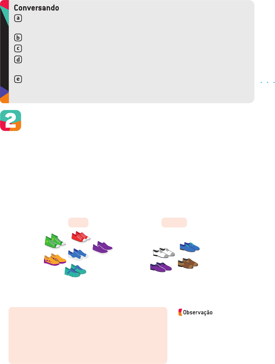 13 Cite outras situações, parecidas com a apresentada na página anterior, em que é ne- cessário realizar escolhas entre várias opções. O que você entende por Análise combinatória? Explique para um colega sua estratégia para responder à questão da página anterior. Em sua opinião, qual é a importância de calcular a quantidade de possibilidades dife- rentes acerca de uma situação? Vamos supor que Carolina optasse pelo processador de 3.8 GHz. De quantas maneiras distintas ela ainda poderia montar um computador nessa loja, sabendo que ela tam- bém pode escolher uma memória RAM, um HD e uma das opções de acessórios? Princípio fundamental da contagem Dois dos principais conceitos estudados em Análise combinatória são o princípio aditivo e o princípio multiplicativo da contagem. Analise a seguinte situação. • Saulo pretende comprar um único par de calçados em uma loja que disponibiliza 6 modelos de pares de tênis, 4 modelos de pares de sapato e 3 modelos de pares de chinelo. Quantas possibilidades Saulo tem se escolher apenas um par de calçados nessa loja? Para determinar quantos são os calçados disponíveis para a escolha de Saulo, podemos anali- sar o esquema representado a seguir. 6 tênis 4 sapatos 10 calçados1 5 tênis sapato Portanto, Saulo tem 10 possibilidades para escolher um par de calçados nessa loja. Sejam A e B dois conjuntos disjuntos, ou seja, não possuem elementos comuns. Se o conjunto A tem m ele- mentos e o conjunto B tem n elementos, então A < B possui m 1 n elementos. Esse princípio é conhecido como princípio aditivo da contagem. Agora, para resolver problemas como o apresentado no tó- pico anterior, utilizamos o chamado princípio fundamental da contagem ou princípio multiplicativo. Com esse princípio, é possível obter a solução de certos problemas sem a necessi- dade de listar todas as possibilidades e contar os elementos envolvidos. Chamamos conjunto uma coleção formada por objetos classificados de acordo com determinado critério. O conjunto união de A e B, que indicamos por A < B , é o conjunto formado por todos os elementos que pertencem a A ou a B. Já o conjunto interseção de A e B, que indicamos por A > B , é o conjunto formado pelos elementos comuns a A e a B. Considerando os conjuntos A 5 {2 1,0,3,5,6 } e B 5 {2 1,1,3,5,7 } , temos: A < B 5 {2 1,0,1,3,5,6,7 } A > B 5 {2 1,3,5 } Resposta pessoal. Possíveis respostas: Resposta pessoal. 48 maneiras Resposta pessoal. Proponha aos alunos a situação apresentada antes de abordá-la no livro, a fim de que, em duplas, tentem resolvê-la. Depois, considerando as estratégias e resoluções propostas e desenvolvidas por eles, apresente as explicações encontradas nesta página. escolha de saladas com sucos; escolha de modelo de bicicleta, cores e acessórios. c) Resposta pessoal. Espera-se que os alunos respondam que para cada tipo de processador há três opções de memória, com quatro opções de HD e quatro opções de acessórios. Ao combinar as opções entre si, obtém-se o total de maneiras distintas para montar o computador. Para isso, multiplica-se o número de processadores pelo de opções de memória, opções de HD e opções de acessórios, isto é, 5 ?? 3 ?? 4 ?? 4 5 240 . Ilu st ra çõ es : E m ili an o C av al ca n te g21_scp_lt_5mat_c1_p010a023.indd 13g21_scp_lt_5mat_c1_p010a023.indd 13 9/15/20 6:25 PM9/15/20 6:25 PM 14 Outra maneira de representar es- sas possibilidades é por meio de um quadro de dupla entrada. De acordo com a árvore de possi- bilidades e o quadro de dupla entra- da, podemos obter o total de opções da seguinte maneira. Motor Cor 1.0 1.6 Prata prata, 1.0 prata, 1.6 Preta preta, 1.0 preta, 1.6 Vermelha vermelha, 1.0 vermelha, 1.6 total de cores total de motores total de possibilidades 3 ?? 2 5 6 Note que a escolha do carro pode ser realizada em duas etapas, isto é, a escolha da cor, com 3 possibilidades, e a escolha do motor, com 2 possibilidades. Assim, Simone teria 6 possibilidades diferentes para escolher o carro nessa concessionária. De modo geral: Se uma decisão A pode ser tomada de m maneiras distintas e, para cada uma dessas maneiras, uma outra decisão B pode ser tomada de n maneiras distintas, então o núme- ro de maneiras distintas de serem tomadas as decisões A e B é m ?? n . Esse princípio é conhecido como princípio multiplicativo ou princípio fundamental da contagem (PFC). 1. Uma loja oferece 2 modelos de telefone celular, 2 planos de tarifa e 3 condições de paga- mento. Quantas possibilidades diferentes uma pessoa tem para comprar um telefone celular nessa loja? Representando os modelos dos telefones celulares por M 1 e M 2 , os planos de tarifa por O PFC também pode ser estendido para ações com mais de duas etapas sucessivas e independentes. Veja os exemplos a seguir. Para determinar todas as opções de Simone, podemos utilizar o seguinte esquema, co- nhecido como diagrama de árvore ou árvore de possibilidades. prata preta vermelha motor 1.0 preta, motor 1.0 preta, motor 1.6motor 1.6 motor 1.0 prata, motor 1.0 prata, motor 1.6motor 1.6 motor 1.0 vermelha, motor 1.0 vermelha, motor 1.6motor 1.6 cor (3 possibilidades) motor (2 possibilidades) possíveis escolhas (6 possibilidades) Veja, por exemplo, a resolução da seguinte situação. • Simone foi a uma concessionária comprar um carro. Para determinado modelo, ela po- deria escolher entre as cores prata, preta e vermelha, além de dois tipos de motor, 1.0 e 1.6. Quantas possibilidades diferentes Simone teria para escolher esse modelo de carro nessa concessionária, sabendo que ela pode optar por uma cor e um tipo de motor? Verifique a possibilidade de propor aos alunos as situações apresentadas nos exemplos 1 e 2, antes de abordá-las no livro, a fim de que, em duplas, eles tentem resolvê-las. Depois, considerando as estratégias de resoluções propostas e desenvolvidas por eles, apresente as explicações encontradas na página 15