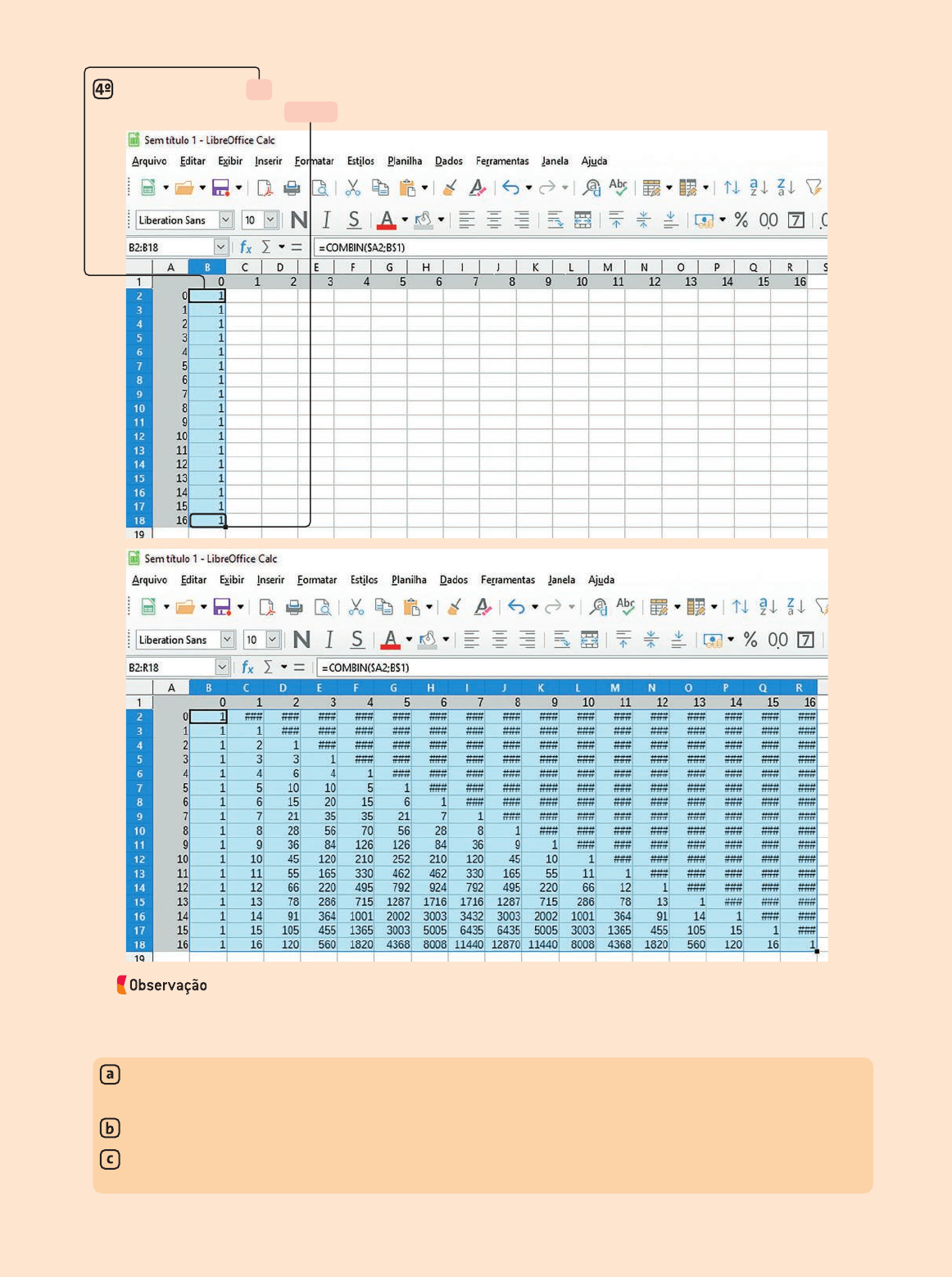43 No triângulo de Pascal construído na planilha eletrônica, o valor da célula H12 é igual à soma dos valores de qual par de células? Expresse essa igualdade usando a notação de números binomiais. Qual é a soma dos elementos da linha 15 do triângulo de Pascal? Esse número corresponde a qual potência de base 2? Pesquise na internet algumas regularidades que podem ser observadas no triângulo de Pascal e verifique-as no triângulo que você construiu na planilha eletrônica. Note que as células acima da diagonal principal possuem um conteúdo inválido, pois essas células correspondem a números binomiais com numerador menor do que o denominador, ou seja, casos em que o valor não pode ser definido. Se desejar, apague o conteúdo dessas células. Selecione a célula B2 e utilize o autopreenchimento, arrastando a alça de preenchimento até a célula B18. Depois, com o intervalo B2:B18 selecionado, arraste a alça de preenchimento até a célula R18. Resposta pessoal. 32 768 ; 2 15 G11 e H11; ( 9 5 ) 1 ( 9 6 ) 5 ( 10 6 ) Diga aos alunos que o programa Calc exibe, na barra de status, localizada na parte inferior da janela, a soma dos valores das células que se encontram selecionadas. Esse recurso será útil na realização das tarefas. Im a g en s: R ep ro d u çã o /L ib re O ff ic e C a lc /T h e D o cu m en t Fo u n d at io n g21_scp_lt_5mat_c1_p038a047.indd 43g21_scp_lt_5mat_c1_p038a047.indd 43 9/15/20 6:34 PM9/15/20 6:34 PM 44 PR - CURITIBA ABC - 1234 O emplacamento de um veículo pode ser realizado como mostra o esquema a seguir. Ao realizar a compra de um veículo em uma concessionária, o proprietário dispõe de um prazo de 15 dias consecutivos para fazer o registro desse veículo junto ao Detran e efetuar seu emplacamento. No Detran, obtém o decalque do chassi e retira a autorização de confecção do primeiro emplacamento. Para isso, o proprietário do veículo deve portar os documentos necessários, incluindo a nota fiscal do veículo adquirido, uma ficha de cadastro e o comprovante de pagamento da taxa. Placas de veículos Assim como um dos objetivos do Cadastro de Pessoas Físicas (CPF) é identificar as pessoas, as placas dos automóveis surgiram da necessidade de identificar os veículos, a fim de melhor organizar e controlar a frota. Para sua identificação externa, alguns veículos possuem duas placas: uma dianteira e uma traseira. A codificação dessas placas é alfanumérica, ou seja, parte do código é composta por letras do alfabeto e parte é composta por algarismos de 0 a 9. Até 2019, as placas dos veículos brasileiros eram compostas por três letras e quatro A partir de 2019 e com referência nos mesmos moldes do sistema adotado pelos países pertencentes à União Europeia, as novas placas dos veículos no Brasil, conhecidas como placas Mercosul, foram elaboradas para padronizar a identificação dos veículos do Brasil, Argentina, Paraguai, Uruguai e Venezuela. Nessas placas, um dos caracteres nu- méricos foi substituído por uma letra do alfabeto. Desse modo, os códigos alfanuméri- cos descritos nas placas atuais são compostos por quatro letras e três algarismos. Com a criação do novo modelo de placas, é possível criar um banco de dados inte- grado, o que promete facilitar a fiscalização, principalmente no que diz respeito a veí- culos roubados que cruzam as fronteiras. decalque: reprodu- ção de um desenho ou escrita por meio de sua compressão de encontro a uma superfície. algarismos, nessa ordem. Pelo princípio fundamental da contagem, é possível calcular a quantidade de placas dis- tintas possíveis de ser obtidas seguindo essas condições. Nesse caso, temos: letras algarismos 26 ?? 26 ?? 26 ?? 10 ?? 10 ?? 10 ?? 10 5 175 760 000 g21_scp_lt_5mat_c1_p038a047.indd 44g21_scp_lt_5mat_c1_p038a047.indd 44 9/15/20 6:34 PM9/15/20 6:34 PM