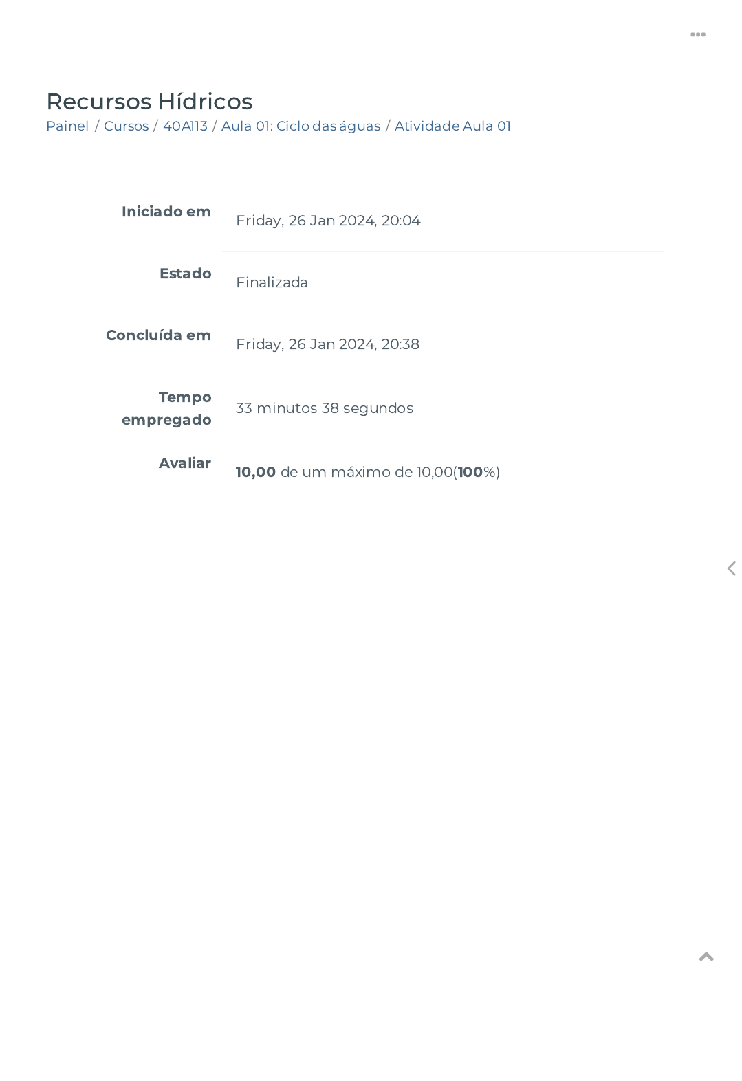 26/01/2024, 20:38 Atividade Aula 01 https://ava.politecnicabr.com.br/mod/quiz/review.php?attempt=6236162 1/8 Painel / Cursos / 40A113 / Aula 01: Ciclo das águas / Atividade Aula 01 Recursos Hídricos Iniciado em Friday, 26 Jan 2024, 20:04 Estado Finalizada Concluída em Friday, 26 Jan 2024, 20:38 Tempo empregado 33 minutos 38 segundos Avaliar 10,00 de um máximo de 10,00(100%) https://ava.politecnicabr.com.br/my/ https://ava.politecnicabr.com.br/my/ https://ava.politecnicabr.com.br/course/index.php https://ava.politecnicabr.com.br/course/view.php?id=1055 https://ava.politecnicabr.com.br/course/view.php?id=1055#section-2 https://ava.politecnicabr.com.br/mod/quiz/view.php?id=33935 https://ava.politecnicabr.com.br/ 26/01/2024, 20:38 Atividade Aula 01 https://ava.politecnicabr.com.br/mod/quiz/review.php?attempt=6236162 2/8 Questão 1 Correto Atingiu 2,00 de 2,00 O ciclo hidrológico, ou ciclo da água, é responsável pela renovação dos reservatórios e aquíferos na superfície do planeta. Trata-se de uma importante via de conexão entre oceanos, terra e atmosfera, garantindo a reserva de água necessária à manutenção da vida na Terra. Com base na a�rmativa, marque a alternativa incorreta quanto ao ciclo hidrológico. Escolha uma opção: a. O fenômeno da evapotranspiração caracteriza-se pela perda de água pelas plantas, devido à transpiração, e pela evaporação da água presente no solo. Essa água evaporada é conduzida a altitudes elevadas mediante correntes de convecção, onde a temperatura é mais baixa, o que leva à condensação e à formação de nuvens. b. Os aquíferos são regiões subterrâneas responsáveis pelo armazenamento de água salobra por longos períodos. Alguns aquíferos estão localizados em grandes profundidades, e a água pode retornar à superfície em regiões de descargas subterrâneas, resultando em nascentes de água doce. c. Durante o processo do ciclo hidrológico, o volume total de água permanece constante. Entretanto, durante as etapas do ciclo, as formas em que a molécula de água se apresenta no planeta são variadas e dependentes das condições climáticas de cada região. Assim, é possível encontrar reservas de água em aquíferos, lagos, rios, geleiras, atmosfera, além das reservas presentes nos organismos vivos e que são liberadas a partir do processo de transpiração. d. As correntes de ar são responsáveis por movimentar essas nuvens ao redor do globo, fazendo com que alcancem, muitas vezes, quilômetros de distância do local onde foram inicialmente formadas. Ao colidirem umas com as outras, as partículas formadoras das nuvens crescem. Esse fenômeno é conhecido como coalescência. https://ava.politecnicabr.com.br/mod/resource/view.php?id=33903 https://ava.politecnicabr.com.br/ 26/01/2024, 20:38 Atividade Aula 01 https://ava.politecnicabr.com.br/mod/quiz/review.php?attempt=6236162 3/8 e. Ao modi�car seu estado (de sólida para líquida, ou de líquida para gasosa, por exemplo), a molécula de água é submetida a mudanças físicas, também denominadas de mudanças de estado. Essas alterações dependem da temperatura e da pressão, resultando na fusão, solidi�cação, evaporação, condensação ou sublimação da molécula de água. https://ava.politecnicabr.com.br/ 26/01/2024, 20:38 Atividade Aula 01 https://ava.politecnicabr.com.br/mod/quiz/review.php?attempt=6236162 4/8 Questão 2 Correto Atingiu 2,00 de 2,00 Marque corretamente conforme o texto a seguir. Um recurso hídrico implica em águas capazes de serem utilizadas como um bem econômico, isto é, cujo uso seja viável para o desenvolvimento econômico, político e social de uma região. Como exemplos, têm-se as águas utilizadas para: abastecimento humano (Figura 1), canalizadas ou não; dessedentação de animais; processos de irrigação; geração de energia; paisagismo; lazer; navegação; entre outros usos. é fundamental ao desenvolvimento de uma região que os recursos hídricos disponíveis sejam utilizados de forma sustentável. Sustentabilidade é um termo que, durante muito tempo, foi de difícil de�nição. Entretanto, em 1987, a Organização das Nações Unidas (ONU), por meio da sua Comissão Mundial sobre o Meio Ambiente e Desenvolvimento, elaborou um relatório intitulado Our Common Future (ou Relatório de Bruntland), que �cou conhecido como um divisor de águas na política ambiental mundial, por trazer uma de�nição bastante acurada do termo desenvolvimento sustentável (HARLEM et al., 1987). De acordo com o Relatório de Bruntland, o desenvolvimento sustentável é aquele “capaz de satisfazer as necessidades do presente, sem, contudo, comprometer a capacidade das futuras gerações em suprir suas próprias necessidades” (HARLEM et al., 1987). Por conseguinte, é possível aplicar esse conceito ao uso dos recursos hídricos, aproveitando de forma consciente e sustentável os benefícios que os diferentes corpos hídricos podem proporcionar. Escolha uma opção: Verdadeiro Falso https://ava.politecnicabr.com.br/ 26/01/2024, 20:38 Atividade Aula 01 https://ava.politecnicabr.com.br/mod/quiz/review.php?attempt=6236162 5/8 Questão 3 Correto Atingiu 2,00 de 2,00 Com relação aos reservatórios hídricos, marque Verdadeiro ou Falso: ( ) Estima-se que 1,33 bilhão de km3 de água estejam armazenados nos oceanos (USGS, 2016), o que equivale a, aproximadamente, 96,5% de toda água armazenada no planeta. Os oceanos também contribuem com a maior parcela de água evaporada no ciclo hidrológico, isto é, cerca de 90% (MANN; LAZIER, 2013). ( ) Os oceanos são corpos hídricos em constante movimento e, em seu interior, há correntes responsáveis pelo movimento de grandes massas de água ao redor do globo. Esse �uxo interno é muito importante para o ciclo hidrológico e atua sobre os ecossistemas marinhos e costeiros, além de in�uenciar diretamente o clima. ( ) Dentre as correntes marítimas, a Corrente Kuroshio (também conh