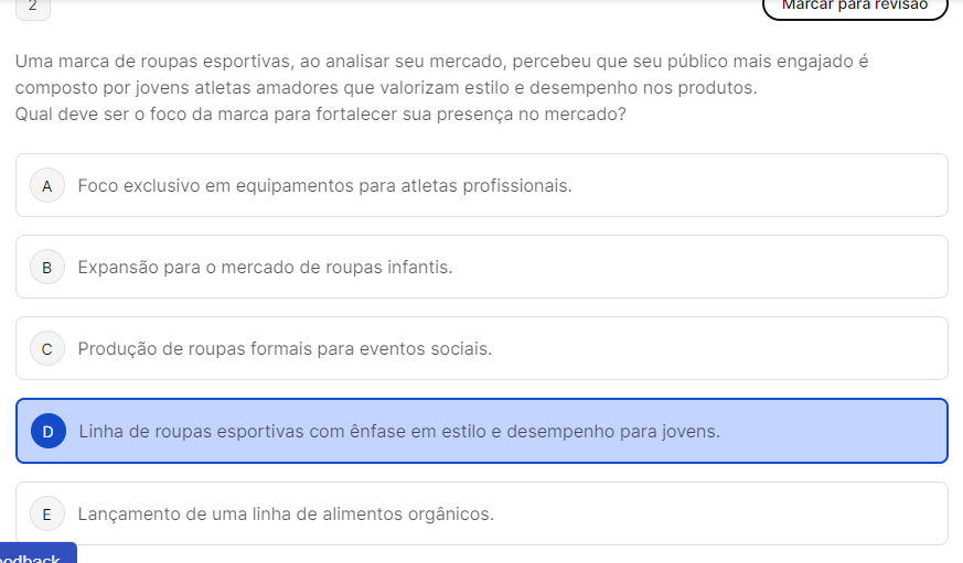 2 Marcar para Uma marca de roupas esportivas, ao analisar seu mercado, percebeu que seu público mais engajado é composto por jovens atletas amadores que valorizam estilo e desempenho nos produtos. Qual deve ser foco da marca para fortalecer sua presença no mercado? A Foco exclusivo em equipamentos para atletas profissionais. B Expansão para mercado de roupas infantis. C Produção de roupas formais para eventos sociais. D Linha de roupas esportivas com ênfase em estilo e desempenho para jovens. E Lançamento de uma linha de alimentos orgânicos.