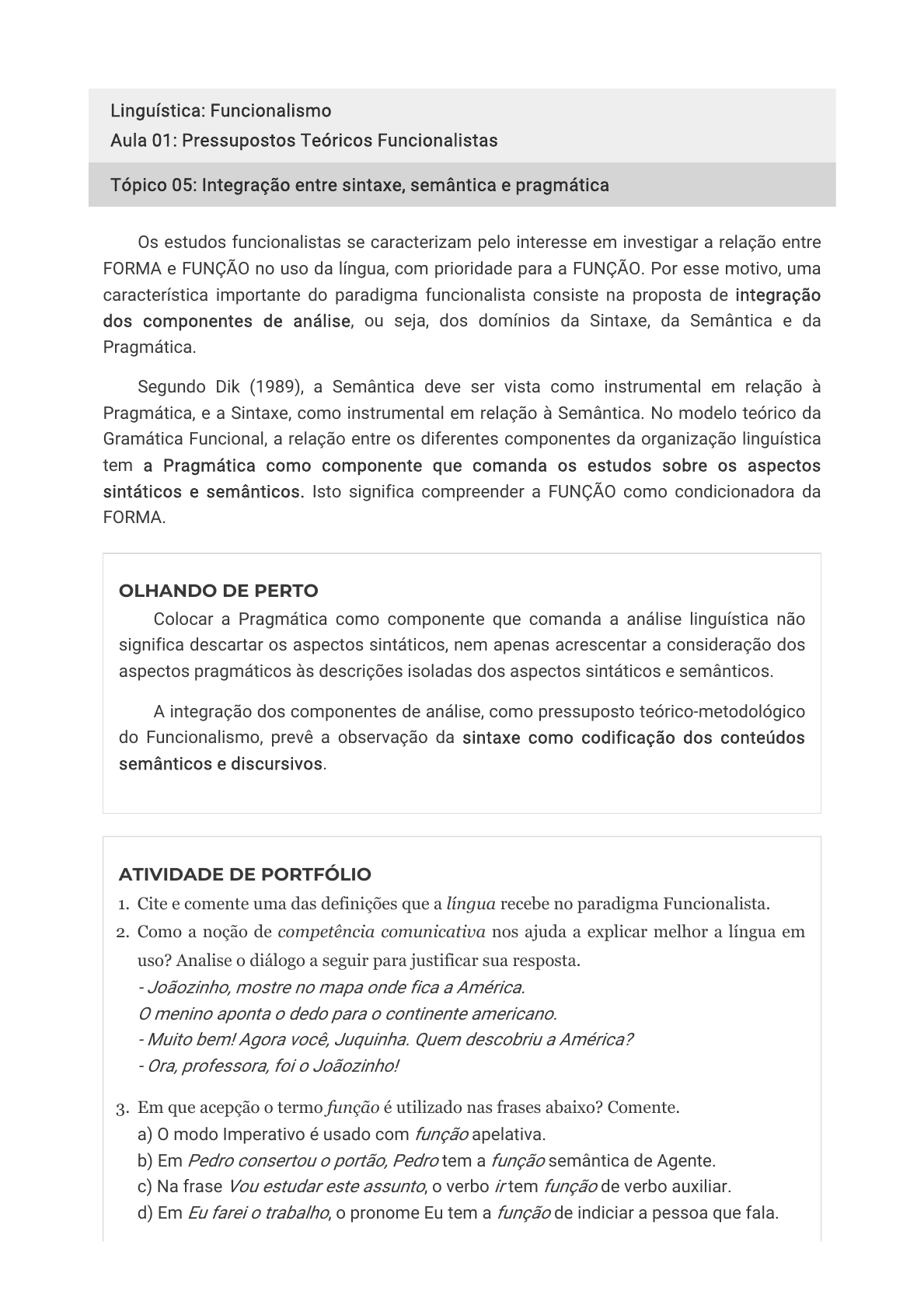 Linguística: Funcionalismo Aula 01: Pressupostos Teóricos Funcionalistas Tópico 05: Integração entre sintaxe, semântica e pragmática Os estudos funcionalistas se caracterizam pelo interesse em investigar a relação entre FORMA e FUNÇÃO no uso da língua, com prioridade para a FUNÇÃO. Por esse motivo, uma característica importante do paradigma funcionalista consiste na proposta de integração dos componentes de análise, ou seja, dos domínios da Sintaxe, da Semântica e da Pragmática. Segundo Dik (1989), a Semântica deve ser vista como instrumental em relação à Pragmática, e a Sintaxe, como instrumental em relação à Semântica. No modelo teórico da Gramática Funcional, a relação entre os diferentes componentes da organização linguística tem a Pragmática como componente que comanda os estudos sobre os aspectos sintáticos e semânticos. Isto significa compreender a FUNÇÃO como condicionadora da FORMA. OLHANDO DE PERTO Colocar a Pragmática como componente que comanda a análise linguística não significa descartar os aspectos sintáticos, nem apenas acrescentar a consideração dos aspectos pragmáticos às descrições isoladas dos aspectos sintáticos e semânticos. A integração dos componentes de análise, como pressuposto teórico-metodológico do Funcionalismo, prevê a observação da sintaxe como codificação dos conteúdos semânticos e discursivos. ATIVIDADE DE PORTFÓLIO 1. Cite e comente uma das definições que a língua recebe no paradigma Funcionalista. 2. Como a noção de competência comunicativa nos ajuda a explicar melhor a língua em uso? Analise o diálogo a seguir para justificar sua resposta. - Joãozinho, mostre no mapa onde fica a América. O menino aponta o dedo para o continente americano. - Muito bem! Agora você, Juquinha. Quem descobriu a América? - Ora, professora, foi o Joãozinho! 3. Em que acepção o termo função é utilizado nas frases abaixo? Comente. a) O modo Imperativo é usado com função apelativa. b) Em Pedro consertou o portão, Pedro tem a função semântica de Agente. c) Na frase Vou estudar este assunto, o verbo ir tem função de verbo auxiliar. d) Em Eu farei o trabalho, o pronome Eu tem a função de indiciar a pessoa que fala. 10