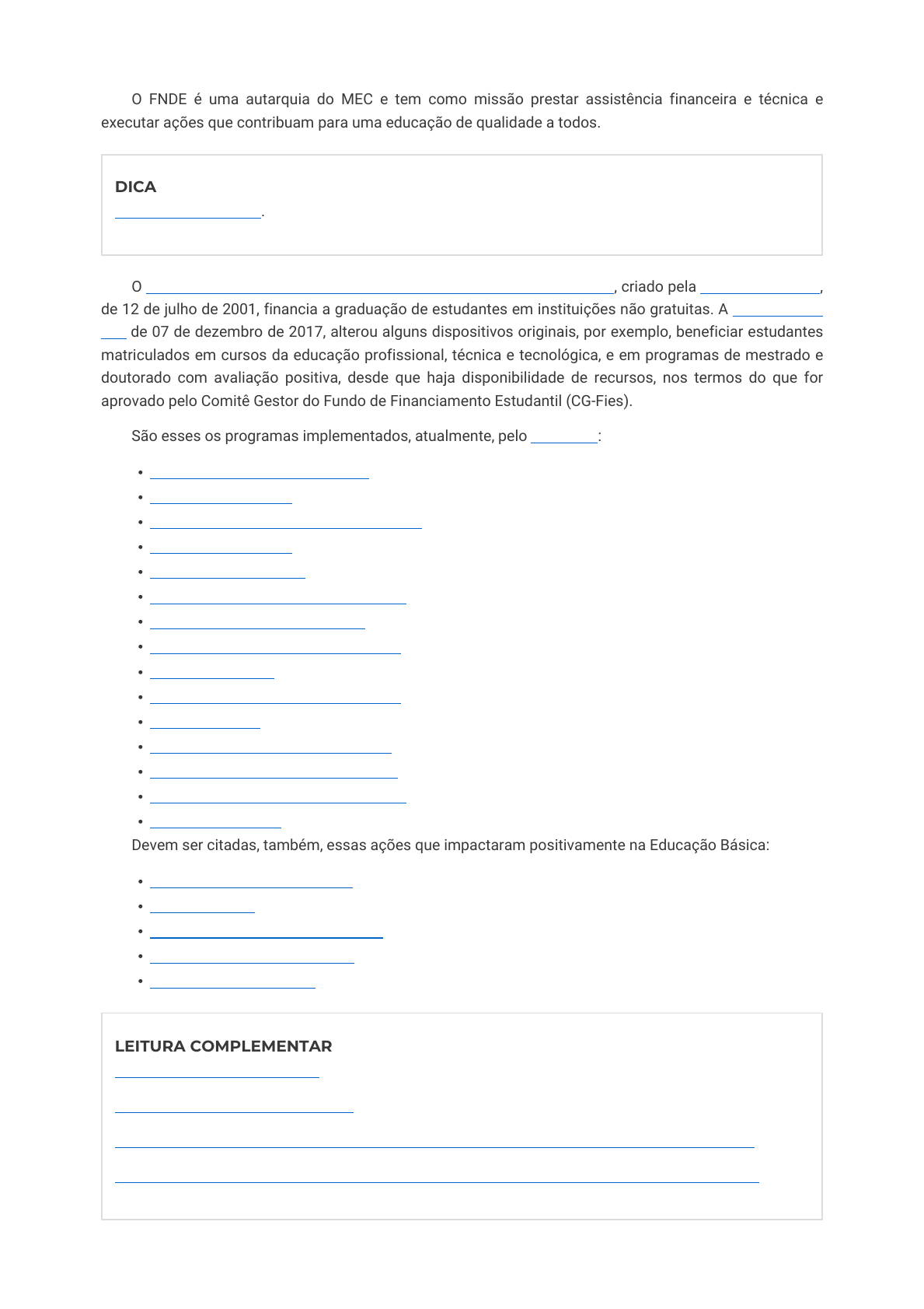 O FNDE é uma autarquia do MEC e tem como missão prestar assistência financeira e técnica e executar ações que contribuam para uma educação de qualidade a todos. DICA Salário-educação [70]. O Fundo de Financiamento ao Estudante do Ensino Superior (FIES) [71], criado pela Lei nº 10.260 [72], de 12 de julho de 2001, financia a graduação de estudantes em instituições não gratuitas. A Lei nº 13.530 [73] de 07 de dezembro de 2017, alterou alguns dispositivos originais, por exemplo, beneficiar estudantes matriculados em cursos da educação profissional, técnica e tecnológica, e em programas de mestrado e doutorado com avaliação positiva, desde que haja disponibilidade de recursos, nos termos do que for aprovado pelo Comitê Gestor do Fundo de Financiamento Estudantil (CG-Fies). São esses os programas implementados, atualmente, pelo FNDE [74]: • Alimentação escolar (PNAE) [75] • Bolsas e Auxílios [76] • Programas do Livro (PNBE e PNLD) [77] • Brasil Carinhoso [78] • Caminho da escola [79] • Dinheiro direto na escola (PDDE) [80] • Formação pela escola (FPE) [81] • Plano de ações articuladas (PAR) [82] • Livro didático [83] • Plano de ações articuladas (PAR) [84] • ProInfância [85] • Transporte do escolar (PNATE) [86] • Banda Larga nas Escolas (PBLE) [87] • Tecnologia Educacional (ProInfo) [88] • Suplementares [89] Devem ser citadas, também, essas ações que impactaram positivamente na Educação Básica: • Planejamento Estratégico [90] • Mais Brasil [91] • Plano de Logística Sustentável [92] • Compras Governamentais [93] • Prestação de Contas [94] LEITURA COMPLEMENTAR A Conferência de Jomtien [95] O Banco Mundial e a Educação [96] Financiamento da educação infantil (Visite a aula online para realizar download deste arquivo.) Financiamento do ensino médio [97] (Visite a aula online para realizar download deste arquivo.) 92