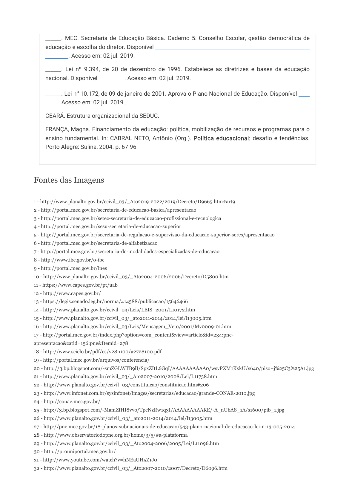 ______. MEC. Secretaria de Educação Básica. Caderno 5: Conselho Escolar, gestão democrática de educação e escolha do diretor. Disponível aqui [126] (Visite a aula online para realizar download deste arquivo.). Acesso em: 02 jul. 2019. ______. Lei nº 9.394, de 20 de dezembro de 1996. Estabelece as diretrizes e bases da educação nacional. Disponível aqui [127]. Acesso em: 02 jul. 2019. ______. Lei no 10.172, de 09 de janeiro de 2001. Aprova o Plano Nacional de Educação. Disponível aqui [128]. Acesso em: 02 jul. 2019.. CEARÁ. Estrutura organizacional da SEDUC. FRANÇA, Magna. Financiamento da educação: política, mobilização de recursos e programas para o ensino fundamental. In: CABRAL NETO, Antônio (Org.). Política educacional: desafio e tendências. Porto Alegre: Sulina, 2004. p. 67-96. Fontes das Imagens 1 - http://www.planalto.gov.br/ccivil_03/_Ato2019-2022/2019/Decreto/D9665.htm#art9 2 - http://portal.mec.gov.br/secretaria-de-educacao-basica/apresentacao 3 - http://portal.mec.gov.br/setec-secretaria-de-educacao-profissional-e-tecnologica 4 - http://portal.mec.gov.br/sesu-secretaria-de-educacao-superior 5 - http://portal.mec.gov.br/secretaria-de-regulacao-e-supervisao-da-educacao-superior-seres/apresentacao 6 - http://portal.mec.gov.br/secretaria-de-alfabetizacao 7 - http://portal.mec.gov.br/secretaria-de-modalidades-especializadas-de-educacao 8 - http://www.ibc.gov.br/o-ibc 9 - http://portal.mec.gov.br/ines 10 - http://www.planalto.gov.br/ccivil_03/_Ato2004-2006/2006/Decreto/D5800.htm 11 - https://www.capes.gov.br/pt/uab 12 - http://www.capes.gov.br/ 13 - https://legis.senado.leg.br/norma/414588/publicacao/15646466 14 - http://www.planalto.gov.br/ccivil_03/Leis/LEIS_2001/L10172.htm 15 - http://www.planalto.gov.br/ccivil_03/_ato2011-2014/2014/lei/l13005.htm 16 - http://www.planalto.gov.br/ccivil_03/Leis/Mensagem_Veto/2001/Mv0009-01.htm 17 - http://portal.mec.gov.br/index.php?option=com_content&view=article&id=234:pne- apresentacao&catid=156:pne&Itemid=278 18 - http://www.scielo.br/pdf/es/v28n100/a2728100.pdf 19 - http://portal.mec.gov.br/arquivos/conferencia/ 20 - http://3.bp.blogspot.com/-smZGLWTB9lI/SpxZItL6GqI/AAAAAAAAAA0/wsvPXM1KxkU/s640/piso+j%25C3%25A1.jpg 21 - http://www.planalto.gov.br/ccivil_03/_Ato2007-2010/2008/Lei/L11738.htm 22 - http://www.planalto.gov.br/ccivil_03/constituicao/constituicao.htm#206 23 - http://www.infonet.com.br/sysinfonet/images/secretarias/educacao/grande-CONAE-2010.jpg 24 - http://conae.mec.gov.br/ 25 - http://3.bp.blogspot.com/-MamZfHI8vvo/TpcNzRw1q3I/AAAAAAAAAKE/-A_nUbA8_1A/s1600/pib_1.jpg 26 - http://www.planalto.gov.br/ccivil_03/_ato2011-2014/2014/lei/l13005.htm 27 - http://pne.mec.gov.br/18-planos-subnacionais-de-educacao/543-plano-nacional-de-educacao-lei-n-13-005-2014 28 - http://www.observatoriodopne.org.br/home/3/5/#a-plataforma 29 - http://www.planalto.gov.br/ccivil_03/_Ato2004-2006/2005/Lei/L11096.htm 30 - http://prouniportal.mec.gov.br/ 31 - http://www.youtube.com/watch?v=hNEaUH5Z1J0 32 - http://www.planalto.gov.br/ccivil_03/_Ato2007-2010/2007/Decreto/D6096.htm 99