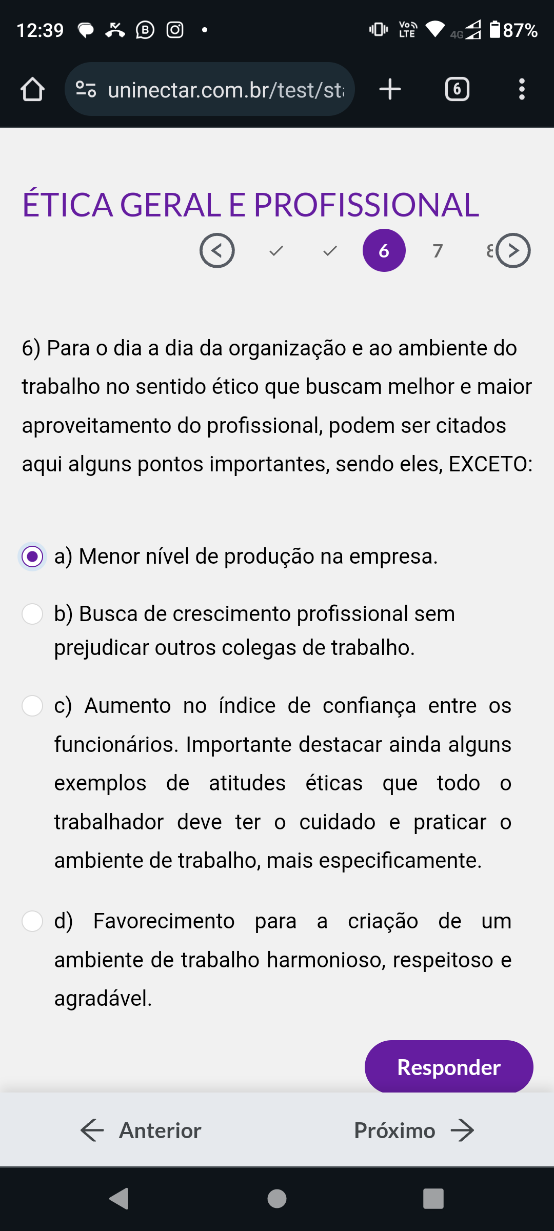12:39 B O LTE 4G 87% uninectar.com.br/test/st + 6 ÉTICA GERAL E PROFISSIONAL < 6 7 8 > 6) Para o dia a dia da organização e ao ambiente do trabalho no sentido ético que buscam melhor e maior aproveitamento do profissional, podem ser citados aqui alguns pontos importantes, sendo eles, EXCETO: a) Menor nível de produção na empresa. b) Busca de crescimento profissional sem prejudicar outros colegas de trabalho. c) Aumento no índice de confiança entre os funcionários. Importante destacar ainda alguns exemplos de atitudes éticas que todo o trabalhador deve ter o cuidado e praticar o ambiente de trabalho, mais especificamente. d) Favorecimento para a criação de um ambiente de trabalho harmonioso, respeitoso e agradável. Responder Anterior Próximo