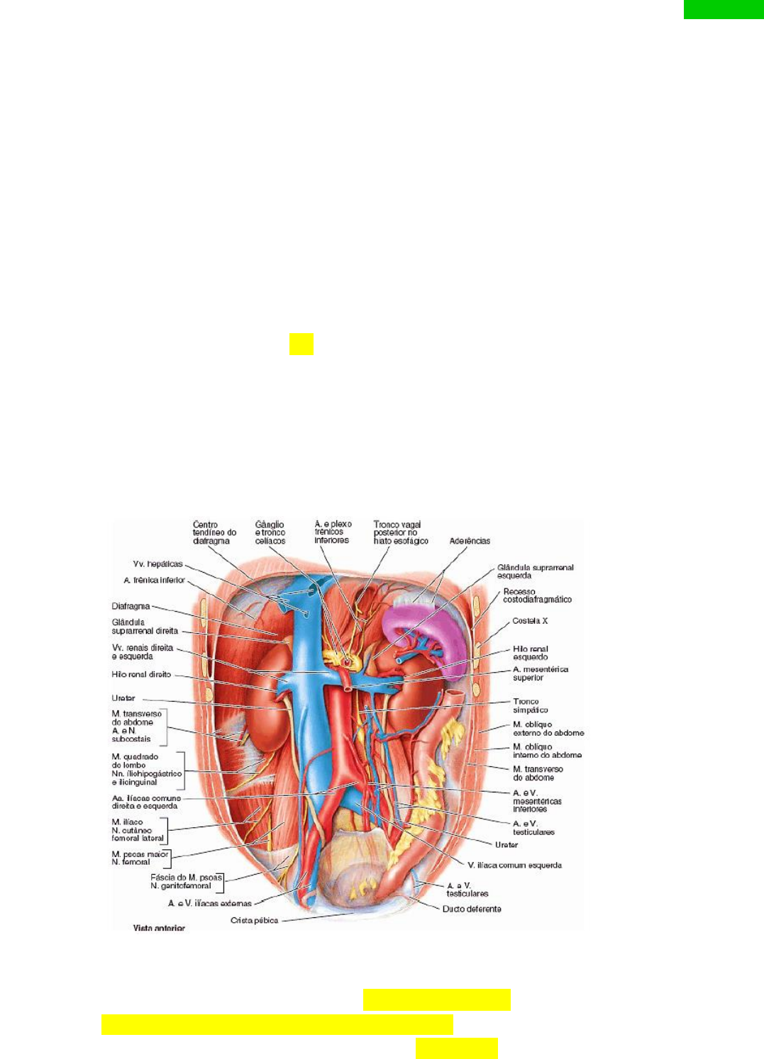 1 LUCY RODRIGUES RIBEIRO – MEDICINA – UFBA – TURMA 254 Sistema Urinário Anatomia dos Sistemas RINS Os rins produzem urina que é conduzida pelos ureteres até a bexiga urinária na pelve. A face superomedial de cada rim normalmente está em contato com a glândula suprarrenal. Um septo fascial fraco separa as glândulas dos rins; assim, eles não estão realmente fixados um ao outro. As glândulas suprarrenais atuam como parte do sistema endócrino, com função completamente separada dos rins. Os órgãos urinários superiores (rins e ureteres), seus vasos e as glândulas suprarrenais são estruturas retroperitoneais primárias na parede posterior do abdome — isto é, foram originalmente formados como vísceras retroperitoneais e assim permanecem. REVESTIMENTOS DOS RINS [Prancha 315 do Netter] Os rins são cobertos mais internamente pela cápsula renal fibrosa. Mais superficialmente a ela, a cápsula adiposa perirrenal (gordura perirrenal) circunda os rins e seus vasos enquanto se estende até suas cavidades centrais, os seios renais. 2 LUCY RODRIGUES RIBEIRO – MEDICINA – UFBA – TURMA 254 Os rins, as glândulas suprarrenais e a gordura que os circunda estão encerrados (exceto inferiormente) por uma camada membranácea e condensada de fáscia renal, que continua medialmente e envolve os vasos renais, fundindo-se com as bainhas vasculares desses últimos. OBS: inferomedialmente, uma extensão delicada da fáscia renal prolonga-se ao longo do ureter como a fáscia periureteral. Externamente à fáscia renal está o corpo adiposo pararrenal (gordura pararrenal/paranefrética), a gordura extraperitoneal da região lombar, que é mais visível posteriormente ao rim. OBS: superiormente, a fáscia renal é contínua com a fáscia na face inferior do diafragma (fáscia diafragmática); assim, as glândulas suprarrenais fixam-se principalmente ao diafragma. Inferiormente, as lâminas anterior e posterior da fáscia renal não estão fixadas ou apresentam apenas união frouxa. ORDEM DOS REVESTIMENTOS DO RIM (da mais interna para a mais externa) Cápsula renal fibrosa → Cápsula adiposa perirrenal → Fáscia renal → Corpo adiposo pararrenal LOCALIZAÇÃO E POSIÇÃO DOS RINS [Pranchas 308, 309 e 320] Estão situados no retroperitônio sobre a parede posterior do abdome, um de cada lado da coluna vertebral, no nível das vértebras T XII a L III. O plano transpilórico atravessa o polo superior do rim direito, que está por volta de 2,5 cm mais baixo do que o polo esquerdo, provavelmente por causa do fígado. Posteriormente, as partes superiores dos rins situam-se profundamente às costelas XI e XII. OBS: como o acesso cirúrgico habitual aos rins é através da parede posterior do abdome, convém saber que o polo inferior do rim direito está aproximadamente um dedo superior à crista ilíaca. 3 LUCY RODRIGUES RIBEIRO – MEDICINA – UFBA – TURMA 254 Durante a vida, os rins têm coloração marrom-avermelhada e medem cerca de 10 cm de comprimento, 5 cm de largura e 2,5 cm de espessura. Superiormente, os rins estão associados ao diafragma, que os separa das cavidades pleurais e do 12º par de costelas. Inferiormente, as faces posteriores do rim têm relação com os músculos psoas maior medialmente e quadrado do lombo. OBS: o nervo e os vasos subcostais e os nervos ílio-hipogástrico e ilioinguinal descem diagonalmente através das faces posteriores dos rins. O fígado, o duodeno e o colo ascendente são anteriores ao rim direito. Esse rim é separado do fígado pelo recesso hepatorrenal. O rim esquerdo está relacionado com o estômago, baço, pâncreas, jejuno e colo descendente. ESTRUTURAS DO RIM [Pranchas 311 e 312 do Netter] Na margem medial côncava do rim há uma fenda vertical, o hilo renal. O hilo renal é a entrada de um espaço no rim, o seio renal. As estruturas que servem aos rins (vasos, nervos e estruturas que drenam urina do rim) entram e saem do seio renal através do hilo renal. OBS: o hilo renal esquerdo situa-se perto do plano transpilórico, a cerca de 5 cm do plano mediano. No hilo renal, a veia renal situa-se anteriormente à artéria renal, que é anterior à pelve renal. No rim, o seio renal é ocupado pela pelve renal, cálices, vasos e nervos e uma quantidade variável de gordura. Cada rim tem faces anterior e posterior, margens medial e lateral e polos superior e inferior. OBS: no entanto, devido à protrusão da coluna vertebral lombar para a cavidade abdominal, os rins estão posicionados obliquamente, formando um ângulo entre eles. Consequentemente, o 4 LUCY RODRIGUES RIBEIRO – MEDICINA – UFBA – TURMA 254 diâmetro transverso dos rins é reduzido em vistas anteriores e em radiografias anteroposteriores (AP). A margem lateral de cada rim é convexa, e a margem medial é côncava, onde estão localizados o seio renal e a pelve renal. A pelve renal é a expansão afunilada e achatada da extremidade superior do ureter. O ápice da pelve renal é contínuo com o ureter. A pelve renal recebe dois ou três cálices maiores, e cada um deles se divide em dois ou três cálices menores. OBS: lembrar que existem dois tipos de pelve, a ampular (inteira) e dendrítica (ramificada). Cada cálice menor é entalhado por uma papila renal, o ápice da pirâmide renal, de onde a urina é excretada. Nas pessoas vivas, a pelve renal e seus cálices geralmente estão colapsados (vazios). As pirâmides e o córtex associado formam os lobos renais. OBS: os lobos são visíveis na face externa dos rins nos fetos, e os sinais dos lobos podem persistir por algum tempo após o nascimento (“rim lobulado”) [Prancha 311 do Netter]. VASCULARIZAÇÃO DOS RINS [Pranchas 310 e 312 do Netter] Irrigação arterial As artérias renais direita e esquerda originam-se a partir da artéria aorta no nível do disco IV entre as vértebras L I e L II. A artéria renal direita, que é mais longa, passa posteriormente à VCI. 5 LUCY RODRIGUES RIBEIRO – MEDICINA – UFBA – T