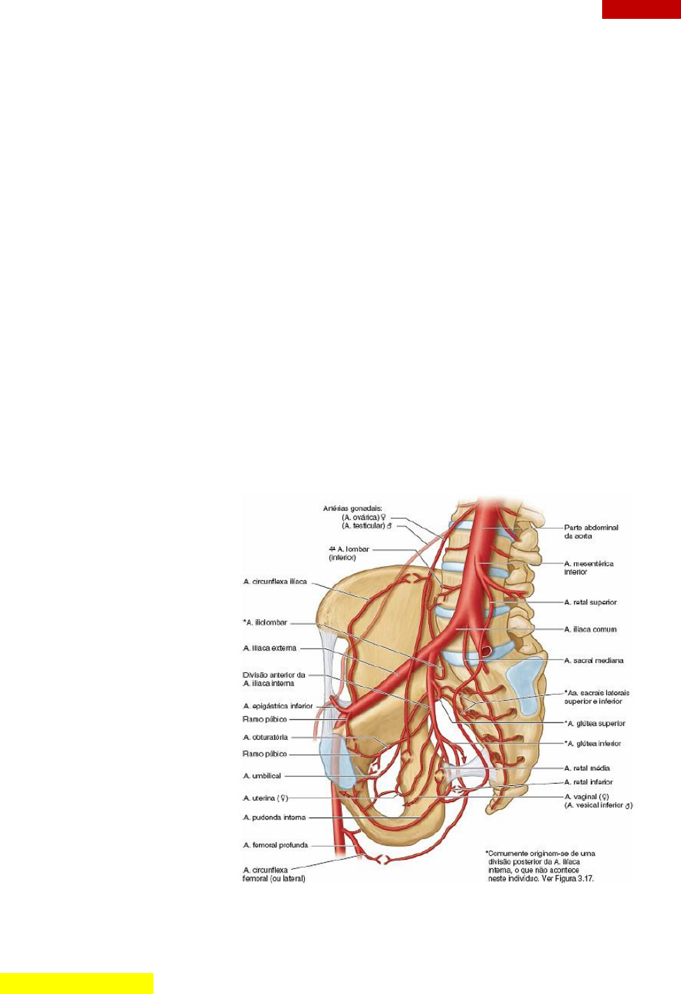 1 LUCY RODRIGUES RIBEIRO - MEDICINA - UFBA - TURMA 254 Estruturas Neurovasculares da Pelve e Períneo Anatomia dos Sistemas As principais estruturas neurovasculares da pelve são extraperitoneais, situadas adjacentes às paredes posterolaterais. Os nervos somáticos situam-se lateralmente (adjacentes às paredes) e as estruturas vasculares, medialmente a eles. Em geral, as veias situam-se lateralmente às artérias. Os linfonodos pélvicos agrupam-se principalmente ao redor das veias pélvicas, e a drenagem linfática costuma ser paralela ao fluxo venoso. Na dissecção da cavidade pélvica em direção às paredes da pelve, primeiro encontram-se as artérias pélvicas, seguidas pelas veias pélvicas associadas e, a seguir, os nervos somáticos da pelve. ARTÉRIAS PÉLVICAS A pelve é ricamente irrigada por artérias, entre as quais ocorrem múltiplas anastomoses, o que proporciona significativa circulação colateral. OBS: acompanhar pelo Netter, pranchas 378 a 381. Seis artérias principais entram na pelve menor das mulheres: duas artérias ilíacas internas, duas artérias ováricas, uma artéria sacral mediana e uma artéria retal superior. Como as artérias testiculares não entram na pelve menor, apenas quatro artérias principais entram na pelve menor dos homens. ARTÉRIA ILÍACA INTERNA A artéria ilíaca interna é a mais importante da pelve, principal responsável pela vascularização das vísceras pélvicas e por parte da vascularização da porção musculoesquelética da pelve; entretanto, também envia ramos para a região glútea, regiões mediais da coxa e períneo. 2 LUCY RODRIGUES RIBEIRO - MEDICINA - UFBA - TURMA 254 Cada artéria ilíaca interna, com cerca de 4 cm de comprimento, começa como a artéria ilíaca comum e bifurca-se nas artérias ilíacas interna e externa no nível do disco entre as vértebras LV e SI. OBS: o ureter cruza a artéria ilíaca comum ou seus ramos terminais na bifurcação ou imediatamente distal a ela. A artéria ilíaca interna é separada da articulação sacroilíaca pela veia ilíaca interna e pelo tronco lombossacral. Desce posteromedialmente até a pelve menor, medialmente à veia ilíaca externa e ao nervo obturatório, e lateralmente ao peritônio. DIVISÃO ANTERIOR DA ARTÉRIA ILÍACA INTERNA Embora as variações sejam comuns, a artéria ilíaca interna geralmente termina na margem superior do forame isquiático maior, dando origem às divisões (troncos) anterior e posterior. Os ramos da divisão anterior da artéria ilíaca interna são principalmente viscerais (isto é, irrigam a bexiga urinária, o reto e os órgãos genitais), mas também incluem ramos parietais que seguem até a coxa e a nádega. A disposição dos ramos viscerais é variável. OBS: Telma chamou atenção em aula para o fato de que essa divisão de “tronco anterior” e “tronco inferior” acontece, mas a frequência é bem baixa. Existem MUITAS variações anatômicas. ARTÉRIA UMBILICAL Antes do nascimento, as artérias umbilicais são a principal continuação das artérias ilíacas internas. Elas seguem ao longo da parede lateral da pelve, ascendem pela parede anterior da pelve, chegam ao anel umbilical e atravessam-no até o cordão umbilical. No período pré-natal, as artérias umbilicais levam o sangue pobre em oxigênio e nutrientes até a placenta, onde é feita a reposição. Quando o cordão umbilical é seccionado, as partes distais desses vasos não funcionam mais e são ocluídas distalmente aos ramos que seguem até a bexiga urinária. As partes ocluídas formam cordões fibrosos chamados ligamentos umbilicais medianos. Os ligamentos elevam pregas de peritônio (as pregas umbilicais medianas) na face profunda da parede anterior do abdome. No período pós-natal, as partes pérvias das artérias umbilicais seguem anteroinferiormente entre a bexiga urinária e a parede lateral da pelve. Irrigam a face superior da bexiga urinária e, em alguns homens, ducto deferente. ARTÉRIA OBTURATÓRIA A origem da artéria obturatória é variável; em geral surge perto da origem da artéria umbilical, onde é cruzada pelo ureter. Segue anteroinferiormente sobre a fáscia obturatória na parede lateral da pelve e passa entre o nervo e a veia obturatórios. 3 LUCY RODRIGUES RIBEIRO - MEDICINA - UFBA - TURMA 254 OBS: lembrar que a artéria obturatória sai da pelve pelo forame obturado. Na pelve, a artéria obturatória emite ramos musculares, uma artéria nutrícia para o ílio e um ramo púbico [assim, irriga músculos pélvicos, ílio, cabeça do fêmur e músculos do compartimento medial da coxa]. O ramo púbico origina-se logo antes da artéria obturatória deixar a pelve. Ascende na face pélvica do púbis para se anastomosar com seu companheiro do lado oposto e o ramo púbico da artéria epigástrica inferior, um ramo da artéria ilíaca externa. OBS: em uma variação comum (20%), uma artéria obturatória aberrante ou acessória origina-se da artéria epigástrica inferior e desce até a pelve ao longo da via habitual do ramo púbico. Os cirurgiões que realizam reparos de hérnias não devem se esquecer dessa variação comum. ARTÉRIA VESICAL INFERIOR A artéria vesical inferior é encontrada apenas nos homens [IMPORTANTE: Telma disse que isso está ERRADO, a artéria vesical inferior também é encontrada em mulheres], sendo substituída pela artéria vaginal nas mulheres. Irriga face inferior da bexiga urinária, parte pélvica do ureter, próstata e glândulas seminais; às vezes, ducto deferente. ARTÉRIA UTERINA A artéria uterina é outro ramo da artéria ilíaca interna em mulheres, geralmente com origem separada e direta da artéria ilíaca interna. Pode originar-se da artéria umbilical. É o homólogo embriológico da artéria para o ducto deferente no homem. Desce sobre a parede lateral da pelve, anterior à artéria ilíaca interna, e segue medialmente para chegar à junção do útero com a vagina, onde há protrusão do colo do 