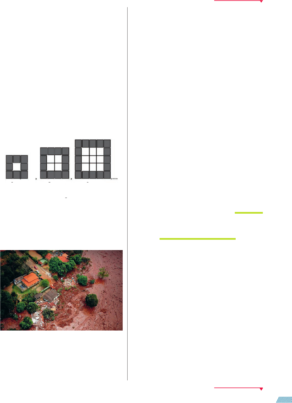 22. Para um evento cultural que acontecerá em um giná- sio de esportes, a comissão organizadora começou a distribuir os crachás de identificação exatamente às 8 h 00 min, quando na fila já se encontravam 40 pesso- as. Sabendo que chega 1 pessoa a cada 10 segundos e que 5 pessoas são atendidas a cada 2 minutos, quan- tas pessoas estavam na fila às 8 h 20 min? 23. Um estacionamento cobra R$ 4,00 para um automóvel parar por até 1 hora. Por até 2 horas ele cobra R$ 5,00; por até 3 horas, R$ 5,80, e a partir desse período sem- pre acrescenta R$ 0,80 a cada hora (ou fração de hora) a mais que o veículo está estacionado. Se um motorista pagou R$ 17,00 e ficou estacionado uma quantidade inteira de horas, então por quantas horas ele manteve o veículo estacionado? 24. (Unifor-CE) Observe bem as três figuras que são mos- tradas abaixo. Todas elas são formadas por quadrinhos de mesmo tamanho. 1a figura 2a figura 3a figura Então, podemos afirmar que, nessa ordem, o número de quadrinhos escuros da 11a figura será de: a) 42. b) 44. c) 46. d) 48. e) 50. 25. Depois das tragédias com o rompimento de barragens que ocorreram nas cidades mineiras de Mariana (em 2015) e Brumadinho (em 2019), foram criados alguns mecanismos de alerta para avisar os habitantes caso haja o risco de um rompimento. A barragem da Mina Córrego do Feijão, na cidade de Brumadinho (MG), era destinada a reter resíduos sólidos e água resultantes dos processos de extração de ferro da região. O rompimento dela, em 2019, foi um dos maiores desastres ambientais da mineração no país, bem como um desastre humanitário que causou centenas de mortes. Na foto, vista aérea de região atingida em 2019 pela lama de rejeitos. 103 pessoas. 12 horas. R e p ro d u ç ã o /U n if o r- C E , 2 0 1 7. Alternativa d. Im a g o /Z U M A P re s s /F o to a re n a a) Uma das estratégias criadas para avisar os habitan- tes consiste em um carro de som que percorre as ruas da cidade emitindo um alerta sonoro. Considere que, em uma cidade, o carro de som deve sair da praça central e se mover a uma medida de velocidade de 6 m/s, sem fazer paradas no per- curso, emitindo um alerta sonoro a cada 5 segun- dos. Dessa maneira, o primeiro alerta sonoro ocorre ainda na praça, o segundo ocorre 5 segundos de- pois, e assim por diante até que o carro percorra 3 240 metros pelas ruas da cidade. Quantos alertas sonoros ele terá emitido no total? b) Se a medida de velocidade do carro fosse de 9 m/s, sem fazer paradas no percurso, e ele emitisse um alerta sonoro a cada 4 segundos, então, manten- do as demais informações, a quantidade de alertas emitidos no total seria maior ou menor do que na situação inicial? c) Quais outros mecanismos de alerta você acha que podem ser criados para avisar a população de um risco iminente nessa situação? 26. A radiologia médica, que engloba os exames de ima- gem, traz consigo diversas contribuições para a medi- cina atual. Os exames de imagem servem para obser- var partes internas do organismo e a maioria deles não é invasiva, o que explica a popularização em diversos países. Pesquisas apontam que, entre 1991 e 1996, fo- ram realizados 2,4 bilhões de exames em imagiologia médica no planeta, e, entre 1997 e 2007, 3,6 bilhões de exames. O mesmo que diagn—stico por imagem. Imagiologia Fonte de consulta: TELEMEDICINA MORSCH. O que são exames por imagem? Para que servem? Disponível em: https://telemedicinamorsch.com.br/blog/exames-de-imagem. Acesso em: 17 abr. 2020. Suponha que, em determinado país, tenha sido obser- vado que a quantidade de exames por imagem, em milhões por ano, aumentou de acordo com os termos de uma progressão aritmética de razão 4, chegando ao fim de 6 anos à quantidade de 98 milhões de exames por ano. A quantidade de exames de imagem ao fim do primeiro ano de observação foi de: a) 92 milhões por ano. b) 94 milhões por ano. c) 78 milhões por ano. d) 102 milhões por ano. e) 74 milhões por ano. 109 alertas. Menor do que na situação inicial. Resposta pessoal. Alternativa c. Não escreva no livro. 123 106a127_V1_MATEMATICA_Dante_g21At_Cap3_LA.indd 123106a127_V1_MATEMATICA_Dante_g21At_Cap3_LA.indd 123 04/09/2020 14:1404/09/2020 14:14 27. Uma questão de saúde pública, não apenas no Brasil, mas também mundialmente, é fazer com que a popu- lação diminua o consumo de açúcar, substância que, quando consumida em excesso, pode ocasionar obesi- dade e diabetes. Em 2018, o Brasil assinou um acordo com a OMS comprometendo-se a diminuir o consumo médio dos brasileiros, que era de 80 gramas de açúcar por dia, visando chegar aos 50 gramas por dia reco- mendados. A meta tinha previsão de ser cumprida até 2022 e contava com a participação de vários setores da indústria alimentícia. Fonte de consulta: MINISTÉRIO DA SAÚDE. Brasil assume meta para reduzir 144 mil toneladas de açúcar até 2022. Disponível em: https://www.saude.gov.br/noticias/agencia-saude/44777-brasil- assume-meta-para-reduzir-144-mil-toneladas-de-acucar-ate-2022. Acesso em: 17 abr. 2020. O açúcar é um produto derivado do caldo da cana. O Brasil é o maior produtor e exportador de açúcar no mundo, com a maioria das lavouras de cana-de-açúcar no estado de São Paulo. Na foto, de 2018, plantação em Leme (SP). Considerando que essa diminuição começou em janei- ro de 2019, com consumo de 80 g por dia, e ocorra de acordo com uma progressão aritmética até chegar a 50 g em maio de 2022, qual era a estimativa de consu- mo mensal de açúcar no 30o mês de diminuição? 28. De acordo com muitos dos manuais de drenagem se- guidos pelos municípios brasileiros, os bueiros (ou bocas de lobo) devem adotar um espaçamento máximo de 60 metros entre si, salvo se houver análise da capacida- de de escoamento da sarjeta. Em vias largas, a recomen- dação é de que a medida de distância máxima seja re- duzida, pois o volume de uma enxurrada pode ser maior. a) No planejamento
