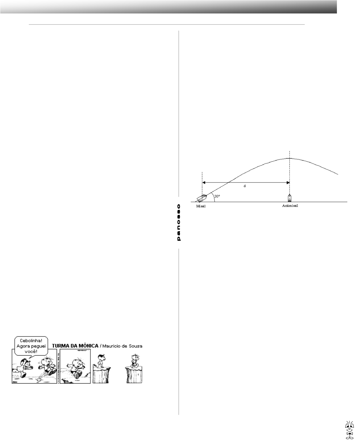 Lançamento Oblíquo 1 Exercícios de Física 1) Um aluno do CEFET em uma partida de futebol lança uma bola para cima, numa direção que forma um ângulo de 60° com a horizontal. Sabendo que a velocidade na altura máxima é 20 m/s, podemos afirmar que a velocidade de lançamento da bola, em m/s, será: a) 10 b) 17 c) 20 d) 30 e) 40 2) Um super atleta de salto em distância realiza o seu salto procurando atingir o maior alcance possível. Se ele se lança ao ar com uma velocidade cujo módulo é 10 m/s, e fazendo um ângulo de 45º em relação a horizontal, é correto afirmar que o alcance atingido pelo atleta no salto é de: (Considere g = 10 m/s2) a) 2 m. b) 4 m. c) 6 m. d) 8 m. e) 10 m. 3) Um projétil é lançado, a partir do solo, fazendo um ângulo α com a horizontal, e com velocidade de 10m/s. Despreza-se a resistência do ar. Considerar: g = 10 m/s2 , senα = 0,8 e cosα = 0,6. A altura máxima atingida pelo corpo é de: a) 4,2m; b) 4,4m; c) 4,6m; d) 4,8m; e) 5,0m. 4) Um projétil é disparado com uma velocidade inicial de 30m/s sob um ângulo de 60º acima do horizonte. Use g = 10m/s2 e determine: a) a altura máxima atingida pelo projétil; b) o alcance desse projétil. 5) Um projétil é lançado do solo com uma velocidade de 100m/s numa direção que forma 37º com a vertical (despreze a resistência do ar). Calcule o alcance desse projétil. (Dado: g= 10 m/s2, cos 37º = 0,8 e sen 37º = 0,6) 6) Numa partida de futebol, uma falta é cobrada de modo que a bola é lançada segundo um ângulo de 30° com o grama do. A bola alcança uma altura máxima de 5,0m. Despreze a resistência do ar. a) Qual é o módulo da velocidade inicial da bola? Despreze a resistência do ar? b) Qual é o alcance dessa bola? 7) Em uma região plana, um projétil é lançado do solo para cima, com velocidade de 400m/s, em uma direção que faz 60° com a horizontal. Calcule o alcance atingido por esse projétil. 8) Suponha que Cebolinha, para vencer a distância que o separa da outra margem e livrar-se da ira da Mônica, tenha conseguido que sua velocidade de lançamento, de valor 10 m/s, fizesse com a horizontal um ângulo a, cujo senα = 0,6 e cos α = 0,8. Desprezando-se a resistência do ar, o intervalo de tempo decorrido entre o instante em que Cebolinha salta e o instante em que atinge o alcance máximo do outro lado é a) 2,0 s b) 1,8 s c) 1,6 s d) 1,2 s e) 0,8 s 9) Um projétil é lançado obliquamente no ar, com velocidade inicial v0 = 20 m/s, a partir do solo. No ponto mais alto de sua trajetória, verifica-se que ele tem velocidade igual à metade de sua velocidade inicial. Qual a altura máxima, em metros, atingida pelo projétil? (Despreze a resistência do ar.) 10) Um atleta arremessa um dardo sob um ângulo de 45° com a horizontal e, após um intervalo de tempo t, o dardo bate no solo 16 m à frente do ponto de lançamento. Desprezando a resistência do ar e a altura do atleta, o intervalo de tempo t, em segundos, é um valor mais próximo de: Dados: g = 10 m/s2 e sen 45° = cos 45°=0,7 a) 3,2 b) 1,8 c) 1,2 d) 0,8 e) 0,4 11) Um canhão pode ter a elevação de seu cano alterado, para com isso alterar o local do impacto do projétil. A velocidade de saída do tiro é de 300m/s. Use g = 10m/s2. a) Calcule o tempo de impacto, a altura máxima e o alcance para um disparo com uma inclinação em relação a horizontal de 30º. b) Calcule o tempo de impacto, a altura máxima e o alcance para um disparo com uma inclinação em relação a horizontal de 60º. c) Compare o alcance e o tempo dos dois disparos. 12) Em um dado instante t0, um míssil é lançado do solo, com velocidade inicial de 120 m/s formando um ângulo de 30º em relação ao plano horizontal. Um lançador de antimísseis está posicionado a certa distância d, conforme a figura. O valor de d é igual à posição horizontal em que o míssil atinge seu ponto mais alto na trajetória. Alguns instantes após o lançamento do míssil, um antimíssil é lançado verticalmente com velocidade vy. Considere g = 10 m/s2, despreze velocidade a resistência do ar e considere tanto o míssil quanto o antimíssil como pontos materiais. Com base nessas informações, faça o que se pede. a) Determine o valor da posição horizontal d. b) Calcule em que instante após o lançamento do míssil, o antimíssil deve ser lançado para atingir o míssil com uma velocidade de 80 m/s. 13) Num teste de balística, um projétil foi lançado do solo sob um ângulo de 37º (cos 37º = 0,8 e sen 37º = 0,6) retornando ao solo em 6,0 s. Considerando desprezível a resistência do ar e a aceleração da gravidade com o valor 10m⁄s2, a velocidade de lançamento do projétil, em m/s, e o respectivo alcance, em m, foram a) 50 e 240. b) 50 e 120. c) 40 e 240. d) 40 e 120. e) 30 e 240. 14) Num teste de balística, um projétil foi lançado do solo sob um ângulo de 45º com a horizontal , retornando ao solo 360 m adiante do ponto de lançamento. Considerando a aceleração da gravidade com o valor 10 m/s2, pode-se dizer que a velocidade de lançamento do projétil foi, em m/s, de a) 10. b) 36. c) 60. d) 126. e) 252. 15) Um objeto ao nível do mar é lançado obliquamente com velocidade inicial de 100,0 m/s, com um ângulo de lançamento tal que o cosα = 0,6 e senα = 0,8. (obs.: despreze a resistência do ar). Considere g = 10,0 m/s2. Assinale o que for correto. 01. As componentes horizontal e vertical da velocidade no instante de lançamento são vx = 60,0 m/s e vy = 80,0 m/s. 02. Desprezando a resistência do ar, o objeto não retorna ao nível de lançamento. Lançamento Oblíquo 2 Exercícios de Física 04. O alcance máximo do objeto é superior a 500 m. 08. O tempo necessário para o objeto atingir o alcance máximo é 16,0 s. 16. O módulo da componente da velocidade no eixo paralelo ao solo se mantém constante durante o percurso. 16) A figura mostra uma bola de golfe sendo arremessada pelo jogador, com velocidade de 40 m/s, formando um âng