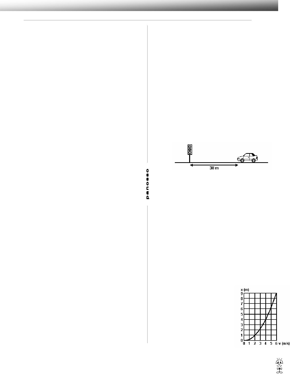 M.U.V. 1 Exercícios de Física 1) Dois objetos saem no mesmo instante de dois pontos A e B situados a 100 m de distância um do outro. Os objetos vão se encontrar em algum ponto entre A e B. O primeiro objeto sai de A em direção a B, a partir do repouso, com uma aceleração constante igual a 2,0 m/s 2 . O segundo objeto sai de B em direção a A com uma velocidade constante de v = 15 m/s. Determine: a) o tempo que levam os objetos para se encontrar; b) a posição onde ocorre o encontro dos dois objetos, medido a partir do ponto A. 2) Em uma prática de laboratório, um aluno observa que uma pequena bola, em movimento retilíneo uniformemente variado, passa por um ponto A com velocidade de 1,0 m/s, e por um ponto B, 2,0 m à direita de A, com 3,0 m/s. O tempo que a bolinha levará, para cumprir um trecho BC, se o ponto C está a 4,0 m à direita de B, será de: a) 0,25 s b) 0,50 s c) 1,0 s d) 2,0 s e) 4,0 s 3) Um policial rodoviário, estacionado com uma MOTO às margens de uma estrada e munido de um radar, observa a passagem de uma FERRARI, cuja velocidade é registrada no aparelho como 108 km/h. Sendo de 80 km/h a velocidade máxima permitida no local, o policial parte do repouso, no instante t = 0 e com aceleração escalar constante de 1,0 m/s 2 , em perseguição à FERRARI que, nesse instante, já se encontra a 600 m de distância. Se a máxima velocidade que a MOTO pode imprimir é de 144 km/h, qual o menor intervalo de tempo gasto pelo policial para alcançar a FERRARI, supondo que a velocidade da mesma não se altera durante a perseguição? 4) Um atleta corre a uma certa velocidade constante em linha reta e ultrapassa um carro que está sendo acelerado (a = 2,0 m/s 2 ) do repouso na mesma direção e sentido. O instante de tempo t = 0 é o tempo inicial de aceleração do carro e também o instante de tempo em que o atleta passa pelo carro. O atleta consegue se manter à frente do carro por 3,0 s. Qual é a velocidade do atleta? a) 1,0 m/s b) 3,0 m/s c) 7,0 m/s d) 9,0 m/s e) 11,0 m/s 5) Uma composição de metrô deslocava-se com a velocidade máxima permitida de 72 km/h, para que fosse cumprido o horário estabelecido para a chegada à estação A. Por questão de conforto e segurança dos passageiros, a aceleração (e desaceleração) máxima permitida, em módulo, é 0,8 m/s 2 . Experiente, o condutor começou a desaceleração constante no momento exato e conseguiu parar a composição corretamente na estação A, no horário esperado. Depois de esperar o desembarque e o embarque dos passageiros, partiu em direção à estação B, a próxima parada, distante 800 m da estação A. Para percorrer esse trecho em tempo mínimo, impôs à composição a aceleração e desaceleração máximas permitidas, mas obedeceu a velocidade máxima permitida. Utilizando as informações apresentadas, e considerando que a aceleração e a desaceleração em todos os casos foram constantes, calcule: a) a distância que separava o trem da estação A, no momento em que o condutor começou a desacelerar a composição. b) o tempo gasto para ir da estação A até a B. 6) Um jogador de futebol em repouso vê uma bola passar por ele a uma velocidade constante de 5m/s. Ele sai em perseguição da mesma com uma aceleração constante igual a 1,0 m/s 2 . a) Em quanto tempo ele alcançará a bola? b) Qual a distância percorrida por jogador e bola, quando o jogador finalmente alcançar a bola? 7) Em um piso horizontal um menino dá um empurrão em seu caminhãozinho de plástico. Assim que o contato entre o caminhãozinho e a mão do menino é desfeito, observa-se que em um tempo de 6 s o brinquedo foi capaz de percorrer uma distância de 9 m até cessar o movimento. Se a resistência oferecida ao movimento do caminhãozinho se manteve constante, a velocidade inicial obtida após o empurrão, em m/s, foi de a) 1,5. b) 3,0. c) 4,5. d) 6,0. e) 9,0. 8) Um carro trafega por uma avenida, com velocidade constante de 54 km/h. A figura a seguir ilustra essa situação. Quando o carro encontra-se a uma distância de 38 m do semáforo, o sinal muda de verde para amarelo, permanecendo assim por 2,5 s. Sabendo que o tempo de reação do motorista é de 0,5 s e que a máxima aceleração (em módulo) que o carro consegue ter é de 3 m/s 2 , responda: a) verifique se o motorista conseguirá parar o carro (utilizando a desaceleração máxima) antes de chegar ao semáforo. A que distância do semáforo ele conseguirá parar? b) considere que, ao ver o sinal mudar de verde para amarelo, o motorista decide acelerar, passando pelo sinal amarelo. Determine se ele conseguirá atravessar o cruzamento de 5 m antes que o sinal fique vermelho. 9) Um automóvel que trafega com velocidade constante de 10 m/s, em uma pista reta e horizontal, passa a acelerar uniformemente à razão de 60 m/s em cada minuto, mantendo essa aceleração durante meio minuto. A velocidade instantânea do automóvel, ao final desse intervalo de tempo, e sua velocidade média, no mesmo intervalo de tempo, são, respectivamente: a) 30 m/s e 15 m/s. b) 30 m/s e 20 m/s. c) 20 m/s e 15 m/s. d) 40 m/s e 20 m/s. e) 40 m/s e 25 m/s. 10) Um predador, partindo do repouso, alcança sua velocidade máxima de 54 km/h em 4 s e mantém essa velocidade durante 10 s. Se não alcançar sua presa nesses 14 s, o predador desiste da caçada. A presa, partindo do repouso, alcança sua velocidade máxima, que é 4/5 da velocidade máxima do predador, em 5 s e consegue mantê-la por mais tempo que o predador. Suponha-se que as acelerações são constantes, que o início do ataque e da fuga são simultâneos e que predador e presa partem do repouso. Para o predador obter sucesso em sua caçada, a distância inicial máxima entre ele e a presa é de: a) 21 m b) 30 m c) 42 m d) 72 m e) 80 m 11) Em um teste, um automóvel é colocado em movimento retilíneo uniformemente acelerado a partir do repouso até atingir a velocidade máxima. Um técnico constrói o gráfico 