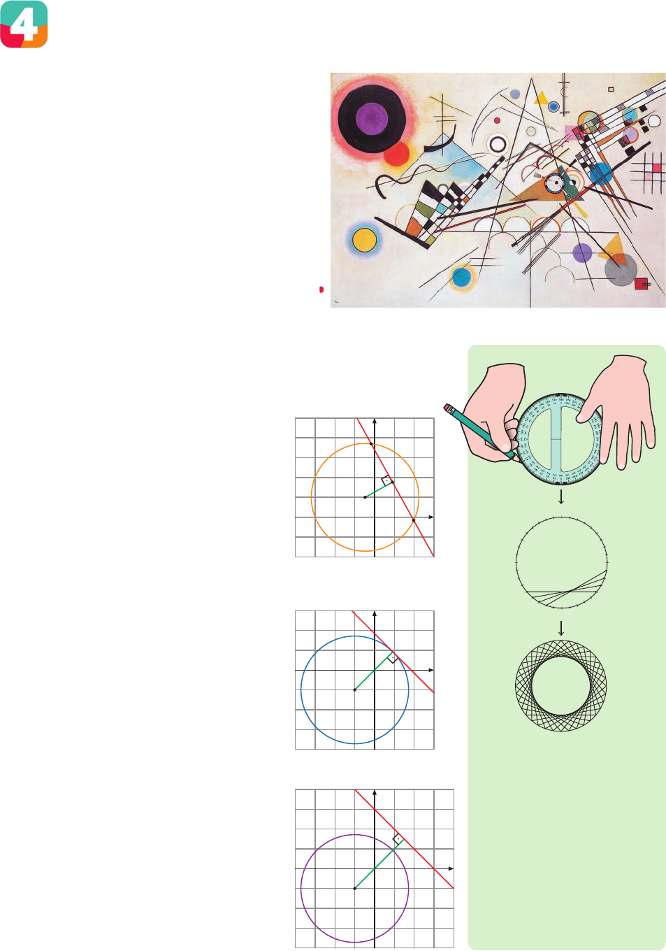 137 0 x y t d < r A B C M λ 0 x y t C d = r λ 0 x y C d > r t λ Posições relativas entre reta e circunferência Wassily Kandinsky foi um pintor e escritor russo que se destacou pela qualidade de suas obras, bem como por introduzir a abstração nas artes visuais. Veja ao lado uma obra desse artista. Nela, pode- mos observar a presença de várias representações de círculos, circunferências, partes de circunferên- cias e retas, algumas das quais com pontos comuns. De acordo com a posição entre uma circunferên- cia e uma reta, podemos estabelecer relações, como mostraremos a seguir. • t corta λ em 2 pontos. Nesse caso, dizemos que t é secante a λ , e podemos destacar que: › a distância d entre a reta secante e o centro da circunferência é menor do que o comprimento do raio. › M corresponde ao ponto médio de ‾AB . • t toca λ em apenas 1 ponto. Nesse caso, dizemos que t é tangente a λ , e podemos destacar que: › a distância d entre a reta tangente e o centro da circunferência é igual ao com- primento do raio. › toda reta tangente a uma circunferên- cia é perpendicular ao raio no ponto de tangência. • t não toca λ . Nesse caso, dizemos que t é exterior a λ , e podemos destacar que: › a distância d entre a reta exterior e o centro da circunferência é maior do que o comprimento do raio. Com base na representação de uma circunferência, e, utilizando apenas linhas retas, é possível obter um formato parecido com uma coroa circular, como mostra a imagem acima. Nesse caso, as linhas traçadas representam retas secantes à circunferência. Quanto maior a quantidade de linhas retas traçadas, mais a figura central obtida na imagem final será parecida com uma circunferência. Seja uma circunferência λ de centro C( a,b ) e raio r e uma reta t em um mesmo plano cartesiano. Quanto à posição da reta t em relação à circun- ferência λ , temos 3 possibilidades: Composição VIII, de Wassily Kandinsky, 1923. Óleo sobre tela, 140 cm 3 201 cm . Museu Solomon R. Guggenheim, Nova Iorque. 3 6 3 5 3 4 3 3 3 2 3 1 30 29 282726 25 24 2 3 2 2 2 1 2 0 1 9 1 8 1 7 1 6 1 5 1 4 1 3 12 11 10 9 8 7 6 5 4 3 2 1 Se possível, apresente aos alunos outras obras do artista Wassily Kandinsky. Algumas sugestões podem ser encontradas no site <https://www.wassilykandinsky.net/painting1896-1944.php>. Acesso em: 6 jun. 2020. R ep ro d u çã o /M u se u S o lo m o n R . G u g g en h ei m , N o va Y o rk Il u st ra çõ es : S er g io L . F il h o g21_scp_lt_4mat_c5_p126a137.indd 137g21_scp_lt_4mat_c5_p126a137.indd 137 9/17/20 3:56 PM9/17/20 3:56 PM 138 R8. Determine a posição relativa entre a reta s: 8x 1 6y 1 9 5 0 e a circunferência λ: ( x 2 5 ) 2 1 ( y 1 2 ) 2 5 16 . Resolução A circunferência λ tem centro C ( 5, 2 2 ) e raio 4. Calculando a distância do centro de λ à reta s: Assim, os valores de k são 3 √ ― 2 ou 2 3 √ ― 2 . Como há dois valores para k, existem duas retas que satisfazem à condição imposta, ou seja, s 1 : x 2 y 1 3 √ ― 2 5 0 e s 2 : x 2 y 2 3 √ ― 2 5 0 . Então, C ( 0, 0 ) e r 5 3 . De acordo com a equação da reta s, a 5 1 , b 5 2 1 e c 5 k . Assim, temos: Como a distância entre a reta s e o centro da circunferência é igual ao comprimento do raio, segue que a reta s é tangente à circunferência λ . R10. A reta s: x 2 y 1 k 5 0 é tangente à circunferência λ: x 2 1 y 2 5 9 . De acordo com essas infor- mações, calcule o valor de k. Resolução Se a reta s é tangente à circunferência λ , então a distância do centro de λ até a reta s é igual ao comprimento do raio, ou seja, d 5 r . Assim: d 5 |1 ?? 0 2 1 ?? 0 1 k| ―― √ ―― 1 2 1 ( 21 ) 2 5 k ― √ ― 2 ä |k| ― √ ― 2 5 3 ⏟ d 5 r ä |k| 5 3 √ ― 2 ä k 5 ± 3 √ ― 2 x 2 1 y 2 5 9 ( x 2 0 ) 2 1 ( y 2 0 ) 2 5 3 2 d ( C, s ) 5 |2 ?? 1 1 1 ?? 1 1 2| ― √ ― 2 2 1 1 2 5 |2 1 1 1 2| ― √ ― 5 5 5 ― √ ― 5 5 5 ― √ ― 5 ?? √ ― 5 ― √ ― 5 5 √ ― 5 Como a distância entre o centro da circunferência e a reta é menor do que o comprimento do raio de λ , segue que s é secante a λ . R9. Considere a circunferência λ: ( x 2 1 ) 2 1 ( y 2 1 ) 2 5 5 . Determine a posição relativa da reta s: 2x 1 y 1 2 5 0 em relação à circunferência λ . Resolução Da equação da circunferência segue que C ( 1, 1 ) é o centro de λ e o comprimento do raio é √ ― 5 . Da equação da reta temos a 5 2 , b 5 1 e c 5 2 . Calculando a distância do centro de λ até a reta s, segue que: d ( C, s ) 5 |8 ?? 5 1 6 ?? ( 2 2 ) 1 9| ― √ ― 8 2 1 6 2 5 |37| ― √ ― 100 5 37 ― 10 5 3,7 , 4 Se achar necessário, relembre aos alunos a expressão que permite calcular a distância entre um ponto e uma reta, assunto abordado no capítulo 4 deste volume. g21_scp_lt_4mat_c5_p138a145.indd 138g21_scp_lt_4mat_c5_p138a145.indd 138 9/17/20 4:02 PM9/17/20 4:02 PM