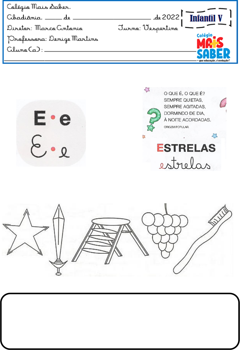 LÍNGUA PORTUGUESA 1- VAMOS CONHECER A LETRA “E”? 2- PINTE OS DESENHOS QUE COMEÇAM COM A VOGAL “E”: 3-AGORA, ESCREVA SEU NOME COMPLETO: ______________________________________________ ______________________________________________ 4- CUBRA OS PONTILHADOS PARA COMPLETAR A VOGAL “E”: LÍNGUA PORTUGUESA 1- VAMOS CONHECER A LETRA “I”? CIRCULE-AS NO TEXTO ABAIXO: 2- LIGUE OS PONTOS SEGUINDO A ORDEM EM QUE AS LETRAS APARECEM NO ALFABETO PARA DESCOBRIR A IMAGEM QUE SE FORMA. Iglu IGLU 3- CUBRA O PONTILHADO PARA COMPLETAR A VOGAL “I”. LÍNGUA PORTUGUESA 1- VAMOS CONHECER A LETRA “O”? QUANTOS ANIMAIS DIFERENTES SÃO CITADOS NA CANTIGA? 2- PINTE SOMENTE OS DESENHOS QUE INICIAM COM A LETRA “O”: 3- CUBRA O PONTILHADO PARA COMPLETAR A VOGAL “O”. LÍNGUA PORTUGUESA 1- PINTE OS DESENHOS INDICADOS PELA VOGAL DESTACADA: NATUREZA E SOCIEDADE 1- COMPLETE DE ACORDO COM SUAS CARACTERÍSTICAS: COORDENAÇÃO MOTORA 1- CUBRA OS PONTILHADOS DOS FOGUETES COM MUITO CAPRICHO, USANDO LÁPIS DE COR OU COLA COLORIDA: MATEMÁTICA 1- OBSERVE A CENA COM ATENÇÃO. AGORA, RESPONDA O QUE SE PEDE: A) QUANTAS AVES ADULTAS TÊM NA IMAGEM? B) QUANTOS PINTINHOS ESTÃO AO LADO DA GALINHA? C) QUANTOS PINTINHOS ESTÃO AO LADO DO GALO? D) QUANTOS PINTINHOS TÊM AO TOTAL? E) QUANTAS AVES TÊM AO TOTAL?