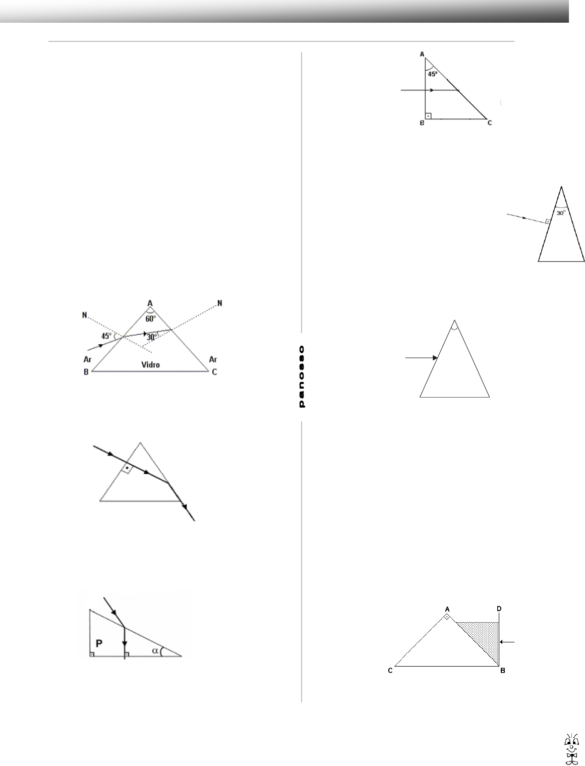 Prisma Refrator 1 Exercícios de Física 1) Um raio de luz se propagando no ar incide sobre uma das faces de um prisma (nP = 3), sabe- se que o ângulo de incidência da luz é de 60° e o ângulo refrator do prisma é de A = 60°. Faça um desenho do prisma, determine os ângulos da luz durante sua trajetória e o desvio total. 2) Um raio de luz se propagando no ar incide sobre uma das faces de um prisma (nP = 2), sabe- se que o ângulo de incidência da luz é de 45° e o ângulo refrator do prisma é de A = 75°. Faça um desenho do prisma, determine os ângulos da luz durante sua trajetória e o desvio total. 3) Após incidir perpendicular a uma das faces, um raio de luz emerge formando um ângulo de 60° com a normal, sabe – se que o ângulo refrator desse prima vale passar por um prima A = 45°. Se ele está imerso no ar, calcule o índice de refração absoluto desse prisma. 4) Um prisma de vidro, cujo ângulo de refringência é 60°, está imerso no ar. Um raio de luz monocromática incide em uma das faces do prisma sob ângulo de 45° e, em seguida, na segunda face sob ângulo de 30°, como está representado no esquema. Calcule o índice de refração do prisma e o desvio total da luz ao atravessar o prisma. 5) Um raio de luz monocromática incide perpendicularmente em uma das faces de um prisma equilátero emerge de forma rasante pela outra face. Sabe- se que o índice de refração do prisma é nP e está imerso no ar, cujo índice de refração é 1, calcule o ângulo de abertura do prisma, bem como o índice de refração do prisma 6) Um raio de luz atravessa um prisma refrator conforme é mostrado no esquema. A luz emerge da face horizontal do prisma, formando com ela um ângulo reto. Sabendo que α = 30°, e o índice de refração do prisma nP = 3, calcule o ângulo de incidência da luz bem como o desvio sofrido por ela. 7) Um prisma de vidro imerso no ar, com a face AB perpendicular à face BC, e a face AC com uma inclinação de 45° em relação a AB. Sabe – se que o índice de refração da do prisma é de 6 /2, calcule o ângulo de emergência da luz bem como o desvio sofrido por ela. 8) Um raio de luz monocromático, propagando no ar, incide perpendicularmente em uma das faces de um prisma de vidro, cujo ângulo de refringência é 30º. Use índice de refração do ar = 1,0 e índice de refração do vidro = 2 . O desvio angular sofrido pelo raio ao atravessar o prisma vale a) 15º b) 30º c) 45º d) 60º e) 75º 9) Um feixe de Liz monocromática incide normalmente sobre a face vertical de um prisma transparente de ângulo de abertura de 30º, conforme a figura ao lado. O índice de refração absoluto do material do prisma é3. Qual é, em graus, o ângulo entre o feixe que sai do prisma e a direção inicial de propagação. 30° ar arvidro 10) Dispõe-se de um prisma óptico cuja secção transversal é um triângulo equilátero. Ao ser colocado num meio de índice de refração absoluto 3, um raio luminoso, que incide numa secção principal sob um ângulo de 30º com uma das faces, emerge perpendicularmente à outra. Neste caso, podemos afirmar que: a) O índice de refração absoluto do material do prisma é3/3. b) O índice de refração absoluto do material do prisma é3. c) O desvio sofrido pelo raio é de 90º. d) O desvio sofrido pelo raio é de 60º. e) O desvio sofrido pelo raio é de 30º. 11) Um prisma de vidro, de índice de refração n= 2, tem por secção normal um triângulo retângulo isósceles ABC no plano vertical. O volume de secção transversal ABD é mantido cheio de um líquido de índice de refração n'= 3. Um raio incide normalmente à face transparente da parede vertical BD e atravessa o líquido. Calcule o desvio sofrido pela luz ao atravessar os 2 prismas. 12) O índice de refração de meios transparentes depende do comprimento de onda da luz. Essa dependência é chamada de dispersão e é responsável pela decomposição da luz branca por um prisma e pela formação do arco-íris. Geralmente o índice de refração diminui com o aumento do comprimento de http://www.professorpanosso.com.br/ Prisma Refrator 2 Exercícios de Física onda. Considere um feixe I de luz branca incidindo sobre um ponto P de um prisma triangular de vidro imerso no ar, onde N é a reta normal no ponto de incidência, como ilustra a figura abaixo. Com base nisso, avalie as seguintes afirmativas: I. O ângulo de refração da componente violeta dentro do prisma é maior que o ângulo de refração da componente vermelha. II. Na figura, a cor vermelha fica na parte superior do feixe transmitido, e a violeta na parte inferior. III. O feixe sofre uma decomposição ao penetrar no prisma e outra ao sair dele, o que resulta em uma maior separação das cores. Assinale a alternativa correta. a)Somente a afirmativa I é verdadeira. b) Somente a afirmativa II é verdadeira. c) Somente as afirmativas II e III são verdadeiras. d) Somente a afirmativa III é verdadeira. e) Somente as afirmativas I e II são verdadeiras. 13) A figura ilustra um raio de luz, proveniente do ar, penetrando perpendicularmente na face AB de um diamante lapidado, com índice de refração 2,4. Velocidade da luz no ar: 3x108 m/s. a) Qual a velocidade da luz no interior do diamante? b) Represente a trajetória do raio até sair do diamante 14) Um raio de luz monocromático incide perpendicularmente na face A de um prisma e sofre reflexões internas totais com toda luz emergindo pela face C, como ilustra a figura a seguir. Considerando o exposto e sabendo que o meio externo é o ar (nar = 1) , calcule o índice de refração mínimo do prisma. 15) Como ilustrado na figura, a luz colimada de uma fonte F incide no espelho E, no ar, e é refletida para a face maior do prisma reto P. A luz emerge da face horizontal do prisma, formando com ela um ângulo reto. O espelho E é perpendicular à face maior do prisma. Sabendo que a luz incide na direção horizontal e que = 30°, calcule o índi