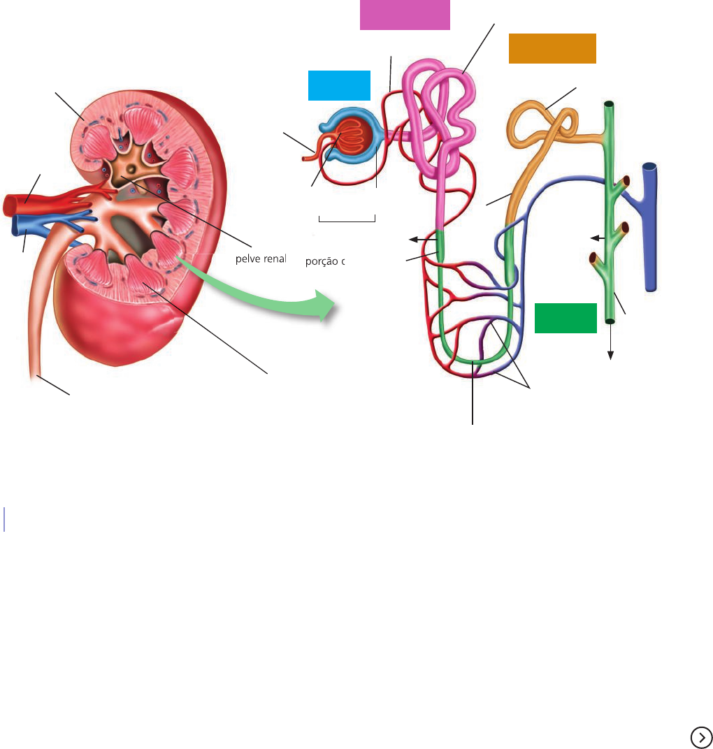 O sangue chega ao rim por meio da artéria renal e sai pela veia renal. A artéria renal rami� ca-se em capilares que formam estruturas enoveladas no córtex renal, os glomérulos. Cada glomérulo é envolvido por uma cáp- sula ligada a um túbulo que se estende até a medula renal. Ao passar pelo glomérulo, por causa da pressão sanguínea, compostos como água, sais minerais, ureia e glicose saem dos capilares e entram no túbulo. Ao longo dele, substâncias úteis para o organismo são reabsorvidas e lançadas de volta à corrente sanguínea. Já aquelas tóxicas ou em excesso seguem o trajeto até o � m do túbulo e formam a urina. A urina formada segue pelos ureteres, estruturas tubulares com cerca de 20 cm, até a bexiga. A bexiga é uma bolsa muscular que armazena a urina e tem grande capacidade elástica. Dela, a urina será conduzida ao ambiente externo por meio da uretra. A estrutura formada por glomérulo, cápsula renal e túbulo compõe a unidade funcional básica dos rins, cha- mada néfron (� gura 5.27). Cada rim contém cerca de 1 milhão de néfrons. córtex renal artéria renal veia renal pelve renal ureter medula renal arteríola eferente túbulo contorcido proximal eliminação ativa de excretas reabsorção de substâncias úteis � ltração glomerular túbulo contorcido distal glomérulo renal porção descendente porção ascendente alça néfrica capilares sanguíneos reabsorção de água H2OH2O ducto coletor cápsula renal pelve renal porção descendente arteríola aferente rim Elaborado com base em: TORTORA, Gerard J.; DERRICKSON, Bryan. Principles of anatomy & physiology. 13. ed. Estados Unidos: John Wiley & Sons, Inc., 2012. # Figura 5.27 – Representação esquemática do processo de formação da urina nos rins. O rim tem duas camadas: o córtex, mais externo, e a medula, mais interna. Os elementos não estão representados em proporção. Cores fantasia. Existe um controle hormonal na regulação da produção da urina. A glândula hipó� se produz o hormônio antidiurético (ADH), que é liberado em situações de desidratação ou queda na pressão arterial. Sua ação reduz o volume de água eliminado na urina e aumenta sua absorção no néfron. Em casos de de� ciência na produção de ADH, a urina torna-se muito diluída, o que pode levar ao desenvolvimento do diabetes insípido. Essa doença é diferente do diabetes tipo 1 e do tipo 2, relacionados à taxa glicêmica. Outro hormônio importante na regulação da excreção é a aldosterona, produzida pelas glândulas suprarre- nais (ou adrenais), localizadas acima de cada rim. Sua ação regula a excreção de sódio e de potássio do corpo e é ativada quando há alterações eletrolíticas no sangue. O s n i d e O liv e ir a /A rq u iv o d a e d it o ra urina para o ureter corpúsculo renal 125BioenergŽtica nutricional 110a129_V5_CIE_NAT_Mortimer_g21Sc_U2_Cap5_LA.indd 125110a129_V5_CIE_NAT_Mortimer_g21Sc_U2_Cap5_LA.indd 125 15/09/2020 13:5815/09/2020 13:58 ARTICULAÇÃO DE IDEIAS 1. Leia o texto a seguir e responda: Abaixo, encontra-se a descrição da rotina de Pedro, um estudante de 16 anos. Ele foi acompanhado ao longo de um dia e alguns parâmetros � siológicos foram medidos, como a variação de temperatura, a ingestão de alimentos e os líquidos corporais. Seu dia começa às 6 horas, horário em que acorda e se arruma para sair. Como sempre, Pedro decide � car mais uns minutinhos na cama e acaba se atrasando. Então, ele toma o café da manhã rapidinho, vai ao banheiro e parte para pegar o ônibus. Corre até o ponto para não perder o ônibus e entra ofegante, com o rosto avermelhado e suado. Chega à escola às 7 h 30 min. Na escola, ele faz um lanche durante o recreio, participa das aulas e conversa com os amigos. Vai ao banheiro uma vez para urinar e almoça entre 12 h 10 min e 13 h. Ao longo do dia, ele bebe água rapidamente no bebedouro perto de sua sala seis vezes e tem uma pausa para o lanche às 14 h 30 min. Depois, ele volta para casa. Quando chega, vai ao banheiro e, em seguida, joga videogame. Às 19 h, ele come um sanduíche e faz as tarefas escolares. Quando termina, � ca usando o celular até dormir, às 22 h. 2. Reproduza o quadro 5.3 no caderno e preencha-o com os eventos do dia de Pedro nos quais você reconheça o funcionamento dos seguintes sistemas. Sistema Eventos digestório respiratório cardiovascular urinário nervoso endócrino # Quadro 5.3 – Eventos relacionados aos sistemas de Pedro. As suprarrenais secretam ainda outros hormônios importantes. No córtex, produzem o cortisol, hormônio envolvido na resposta ao estresse e que regula o metabolismo da glicose e da gordura, e os hormônios sexuais, como a testosterona. Na medula, são produzidas a adrenalina e a noradrenalina, que regulam o sistema nervoso autônomo, como vimos no Capítulo 2 deste volume (� gura 5.28). L u is M o u ra /A rq u iv o d a e d it o ra glândula suprarrenal direita rim direito glândula suprarrenal esquerda rim esquerdo adrenalina ñ noradrenalina testosterona ñ aldosterona ñ cortisoltestosterona ñ aldosterona ñ cortisol córtex medula Elaborado com base em: TORTORA, Gerard J.; DERRICKSON, Bryan. Principles of anatomy & physiology. 13. ed. Estados Unidos: John Wiley & Sons, Inc., 2012. # Figura 5.28 – Representação esquemática da localização e da síntese hormonal pelas glândulas suprarrenais. Os elementos não estão representados em proporção. Cores fantasia. 126 Cap’tulo 5 110a129_V5_CIE_NAT_Mortimer_g21Sc_U2_Cap5_LA.indd 126110a129_V5_CIE_NAT_Mortimer_g21Sc_U2_Cap5_LA.indd 126 15/09/2020 13:5815/09/2020 13:58