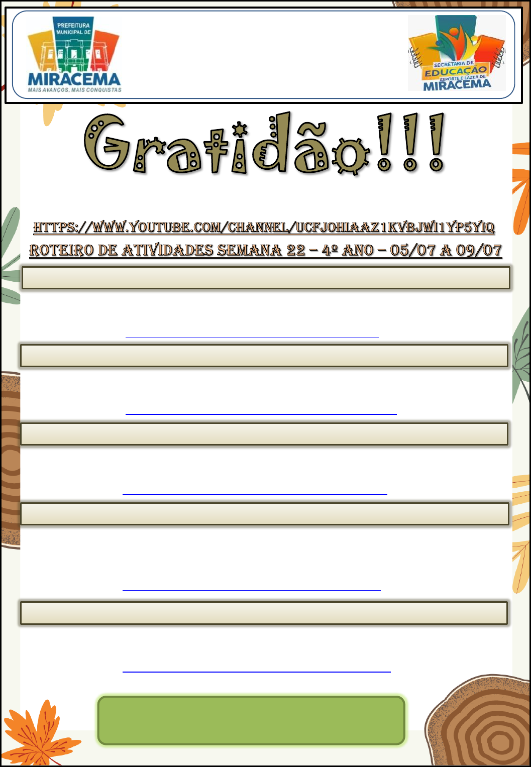 1 Aula ao vivo, todos os dias, das 16:00 às 17:00 Nome do canal: Educação de Miracema – 4º Ano – Ensino Remoto ou acesse Fazer a atividade 1 disponível na plataforma (Português 1 – Revisão) Realizar as atividades das páginas do livro de Português orientadas pelo professor. Assistir ao vídeo https://www.youtube.com/watch?v=jhvZ1aiDc8I Fazer a atividade 2 disponível na plataforma (Matemática 1 - Revisão); Realizar as atividades das páginas dos livros de Matemática orientadas pelo professor. Assistir ao vídeo https://www.youtube.com/watch?v=FC_utpMzMEA Fazer a atividade 3 disponível na plataforma (Ortografia - Revisão); Realizar as atividades das páginas do livro de Português orientadas pelo professor. Assisir ao vídeo https://www.youtube.com/watch?v=0wr2k5cKcPU Fazer a atividade 4 disponível na plataforma (Matemática 2 - Revisão); Realizar as atividades das páginas do livro de Matemática orientadas pelo professor. Aula de Inglês no canal do Youtube. Assisir ao vídeo https://www.youtube.com/watch?v=VIIdGmb1lvk Fazer a atividade 5 disponível na plataforma (Português 2 - Revisão); Realizar as atividades das páginas do livro de Português orientadas pelo professor. Assisir ao vídeo https://www.youtube.com/watch?v=yMaJnBX3kP0 06/07/2021 - TERÇA-FEIRA 07/07/2021 - QUARTA-FEIRA PREFEITURA MUNICIPAL DE MIRACEMA SECRETARIA MUNICIPAL DE EDUCAÇÃO ENSINO MUNICIPAL - 2021 08/07/2021 - QUINTA-FEIRA 09/07/2021 - SEXTA-FEIRA Em um coração aonde mora a gratidão, também sempre habitará a felicidade. 05/07/2021 - SEGUNDA-FEIRA https://www.youtube.com/watch?v=jhvZ1aiDc8I https://www.youtube.com/watch?v=FC_utpMzMEA https://www.youtube.com/watch?v=0wr2k5cKcPU https://www.youtube.com/watch?v=VIIdGmb1lvk https://www.youtube.com/watch?v=yMaJnBX3kP0 https://www.youtube.com/channel/UCFJOhiaAz1KVBJWI1YP5YiQ 2 =============================== ATIVIDADE 1 =============================== 1) Complete a tabela com substantivos derivados. Siga o exemplo. PRIMITIVO DERIVADO PRIMITIVO DERIVADO CHUVA CHUVEIRO FRUTA PEDRA MÁQUINA SAPATO TERRA TINTA PAPEL 2) Escreva os substantivos nos quadros correspondentes. 3) Junte as palavras e forme o maior número de substantivos compostos. Substantivos concretos Substantivos abstratos PREFEITURA MUNICIPAL DE MIRACEMA SECRETARIA MUNICIPAL DE EDUCAÇÃO ENSINO MUNICIPAL - 2021 Aluno (a):_________________________________________________________________________ Escola: __________________________________________________________________________ Data: ____/____/_____ 4º ano Professor (a): ________________________________ PORTUGUÊS 1 __________________________ __________________________ __________________________ __________________________ __________________________ __________________________ __________________________ __________________________ __________________________ 3 =============================== ATIVIDADE 2 =============================== 1) Complete as lacunas com quilograma ou grama. a) Um saco de batata pesa, aproximadamente 60 ________________ b) Um saco de farinha de trigo pesa, aproximadamente 50 _________ c) Um cacho de uvas pesa, aproximadamente 250 _______________ d) Um pacote de pipoca pesa, aproximadamente 80 ______________ 2) Escreva a unidade de massa que usamos para medir os objetos abaixo: a) um pacote de arroz:____ b) um comprimido:____ c) uma televisão:____ d) um caminhão:____ e) um trem:____ f) um limão:____ 3) Escreva o nome de três coisas que compramos por quilo (kg) e três coisas compradas por gramas (g). ______________________________________________________________________________ ______________________________________________________________________________ 4) Indique a unidade mais adequada (milímetro, centímetro, metro ou quilômetro). a) Para medir a altura de um bebê: _________________ b) Para medir altura de um prédio: _________________ c) A distância de Miracema à Santo Antônio de Pádua: ___________________ d) A espessura de um vidro: ____________________ 5) A régua é um instrumento de medida de comprimento. Observe e complete a medida de comprimento de cada objeto. PREFEITURA MUNICIPAL DE MIRACEMA SECRETARIA MUNICIPAL DE EDUCAÇÃO ENSINO MUNICIPAL - 2021 Aluno (a):_________________________________________________________________________ Escola: __________________________________________________________________________ Data: ____/____/_____ 4º ano Professor (a): ________________________________ MATEMÁTICA 1 Unidades de massas mais utilizadas: Grama (g). Quilograma (kg). Tonelada (t). a) Do alfinete: _____________ b) Do lápis: _______________ c) Da borracha: ____________ d) D pincel: _______________ 4 =============================== ATIVIDADE 3 ============================= 1) Complete com mas, más ou mais: a) Ele foi, _________ a tia ficou. b) Sou apaixonada por uma garoto, _______ ele não me dá bola. c) Estude ______ e passará no concurso. d) Ana é inteligente, _______ pouco humilde. e) Bruxas, na maioria das histórias, são sempre ______. f) Paulo passou mal, _________ mesmo assim viajou. 2) Complete as frases com mal ou mau. a) O pai do Pedro dirige muito _______. b) A advogada está de ______ humor. c) Carlos está _______ de saúde. d) O médico disse que ele estava muito ________. e) O lobo era muito ___________. 3) Complete com j ou g para completar as palavras: berin___ela tra___eto ma___estade sar____ento ___eca ho___e ___íria La___e ele___er ___esto 4) Complete com m ou n: ame___doi___ ba___bolê pi___tura de___te ci___to ru___ba ga___bá le___da ta___pa bo___bo___ PREFEITURA MUNICIPAL DE MIRACEMA SECRETARIA MUNICIPAL DE EDUCAÇÃO ENSINO MUNICIPAL - 2021 Aluno (a):_________________________________________________________________________ Escola: __________________________________________________________________________ Data: ____/____/_____ 4º ano Professor (a): ________________________________ ORTOGRAFIA Mas ou Mais Mas indica oposição Mais indica quantidade Exemplos: