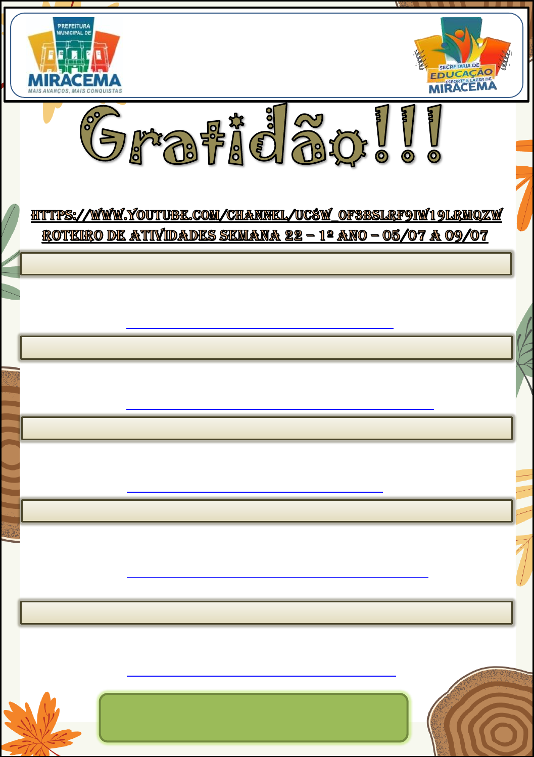 Aula ao vivo, todos os dias, das 08:00 às 09:00 Nome do canal: Educação de Miracema – 1º Ano – Ensino Remoto ou acesse Fazer a atividade 1 disponível na plataforma (Revisão – Alfabeto); Realizar as atividades da página do livro de Português orientadas pelo professor. Assistir ao vídeo https://www.youtube.com/watch?v=we3Tq2ciMnE Fazer a atividade 2 disponível na plataforma (Revisão – Fonema B); Realizar as atividades da página do livro de Português orientadas pelo professor. Assistir ao vídeo https://www.youtube.com/watch?v=X5m-WtQsEXI&t=45s Fazer a atividade 3 disponível na plataforma (Revisão – Fonema L); Realizar as atividades da página do livro de Português orientadas pelo professor. Assistir ao vídeo https://www.youtube.com/watch?v=5iFOalJIVz8 Fazer a atividade 4 disponível na plataforma (Revisão – Fonema P); Realizar as atividades da página do livro de Português orientadas pelo professor. Assistir ao vídeo https://www.youtube.com/watch?v=iA5X_L8LzE8&t=66s Aula de Ingês no canal do Youtube. Fazer a atividade 5 disponível na plataforma (Revisão – Matemática). Realizar as atividades da página do livro de Matemática orientadas pelo professor. Assistir ao vídeo https://www.youtube.com/watch?v=N6UoiTRSdvY 06/07/2021 - TERÇA-FEIRA PREFEITURA MUNICIPAL DE MIRACEMA SECRETARIA MUNICIPAL DE EDUCAÇÃO ENSINO MUNICIPAL - 2021 07/07/2021 - QUARTA-FEIRA 08/07/2021 - QUINTA-FEIRA 09/07/2021 - SEXTA-FEIRA 05/07/2021 - SEGUNDA-FEIRA Em um coração aonde mora a gratidão, também sempre habitará a felicidade. https://www.youtube.com/watch?v=we3Tq2ciMnE https://www.youtube.com/watch?v=X5m-WtQsEXI&t=45s https://www.youtube.com/watch?v=5iFOalJIVz8 https://www.youtube.com/watch?v=iA5X_L8LzE8&t=66s https://www.youtube.com/watch?v=N6UoiTRSdvY https://www.youtube.com/channel/UC8W_0f3bSLrf9Iw19lRMqzw =============================== ATIVIDADE 1 =============================== 1) LEIA O ALFABETO: A B C D E F G H I J K L M N O P Q R S T U V W X Y Z AGORA, COPIE O ALFABETO. ______________________________________________________________________________ ______________________________________________________________________________ ______________________________________________________________________________ ______________________________________________________________________________ DENTRO DO ALFABETO MORAM AS VOGAIS. COPIE-AS: ______________________________________________________________________________ PREFEITURA MUNICIPAL DE MIRACEMA SECRETARIA MUNICIPAL DE EDUCAÇÃO ENSINO MUNICIPAL - 2021 Aluno (a):__________________________________________________________________________ Escola: __________________________________________________________________________ Data: ____/____/_____ 1º ano Professor (a): ________________________________ 2) ESCREVA A LETRA INICIAL E FINAL DAS PALAVRAS. BOLA LETRA INICIAL LETRA FINAL PALAVRA TATU LETRA INICIAL LETRA FINAL PALAVRA CAMELO LETRA INICIAL LETRA FINAL PALAVRA PIPOCA LETRA INICIAL LETRA FINAL PALAVRA MEIA LETRA INICIAL LETRA FINAL PALAVRA =============================== ATIVIDADE 2 =============================== 1) PINTE SOMENTE AS FIGURAS QUE COMEÇAM COM A LETRA B. PREFEITURA MUNICIPAL DE MIRACEMA SECRETARIA MUNICIPAL DE EDUCAÇÃO ENSINO MUNICIPAL - 2021 Aluno (a):_________________________________________________________________________ Escola: __________________________________________________________________________ Data: ____/____/_____ 1º ano Professor (a): ________________________________ 2) COMPLETE COM: BA – BE – BI – BO – BU _______RATA _______GODE _______LE _______BÊ _______LA _______Ú _______TÃO _______LO _______CO =============================== ATIVIDADE 3 =============================== 1) PINTE AS FIGURAS QUE INICIAM COM: PREFEITURA MUNICIPAL DE MIRACEMA SECRETARIA MUNICIPAL DE EDUCAÇÃO ENSINO MUNICIPAL - 2021 Aluno (a):_________________________________________________________________________ Escola: __________________________________________________________________________ Data: ____/____/_____ 1º ano Professor (a): ________________________________ LA LE LI LO LU 2) JUNTE AS SÍLABAS E FORME PALAVRAS. LA TA LE ÃO LI MÃO LO BO LU A LA - LE - LI - LO - LU - LÃO =============================== ATIVIDADE 4 =============================== 1) LIGUE AS FIGURAS AOS SEUS NOMES: PREFEITURA MUNICIPAL DE MIRACEMA SECRETARIA MUNICIPAL DE EDUCAÇÃO ENSINO MUNICIPAL - 2021 Aluno (a):_________________________________________________________________________ Escola: __________________________________________________________________________ Data: ____/____/_____ 1º ano Professor (a): ________________________________ COPO PATO PANELA PIPOCA PIPA 2) ESCREVA AS SÍLABAS QUE COMPLETAM OS NOMES DAS FIGURAS E DEPOIS COPIE-AS: ____A __________ PI____CA __________ ____NELA __________ ____MADA __________ PI____ __________ TA____TE __________ ____ÃO __________ ____TECA __________ A____TO _________ _ ____VÃO __________ =============================== ATIVIDADE 5 =============================== VAMOS CONTAR! PREFEITURA MUNICIPAL DE MIRACEMA SECRETARIA MUNICIPAL DE EDUCAÇÃO ENSINO MUNICIPAL - 2021 Aluno (a):_________________________________________________________________________ Escola: __________________________________________________________________________ Data: ____/____/_____ 1º ano Professor (a): ________________________________ 1 – 2 – 3 – 4 – 5 – 6 – 7 – 8 – 9 1) DESENHE A QUANTIDADE INDICADA 2) COMPLETE AS CASINHAS COM OS NÚMEROS QUE ESTÃO FALTANDO: 3) AGORA, ESCREVA OS NÚMEROS DE 10 A 19. __________________________________________________________________ __________________________________________________________________ __________________________________________________________________ __________________________________________________________________ 10 - 11 – 12 – 13 – 14 – 15 – 16 – 17 – 18 – 19 12 BOLAS 15 CANETAS 18 BANANAS 11 BALAS D U D U D U D U D U D U D U