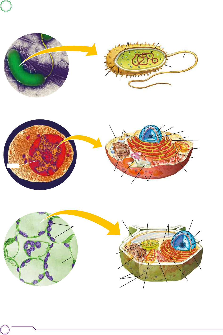 3 Células procariotas e eucariotas Compare o esquema de uma bactéria com o de uma célula animal ou vegetal na figura 6.8. É possível perceber que a bactéria é formada por uma célula bem mais simples que a animal e a vegetal. Il u s tr a ç õ e s : In g e b o rg A s b a ch /A rq u iv o d a e d it o ra Bactérias vistas ao microscópio eletrônico com aumento de 20 mil vezes (imagem colorizada por computador). K a ll is ta I m a g e s/ G e tt y Im ag es Célula humana ao microscópio eletrônico com aumento de cerca de 10 mil vezes (imagem colorizada por computador). D r. D o n a ld F a w c e tt /V is u a ls U n li m it ed /C orb is /L atin stock núcleo Células vegetais ao microscópio eletrônico com aumento de cerca de 4 500 vezes (imagem colorizada por computador). B io p h o to A s s o c ia te s /P h o to re se ar ch er s, In c. /L atin stock parede celular cloroplastos membrana plasmática envelope nuclear ribossomo mitocôndria retículo endoplasmático granuloso retículo endoplasmático não granulosocentríolo complexo golgiense vacúolo digestivo Célula animal (10 μm a 50 μm de diâmetro, em média) lisossomos núcleo nucléolo cromatina microtúbulo microfilamentos Bactéria (0,5 μm a 2 μm de diâmetro, em média) ribossomos DNA flagelo parede celular membrana plasmática cápsula Célula vegetal (10 μm a 100 μm de diâmetro, em média) nucléolo microfilamentos complexo golgiense membrana plasmática retículo endoplasmático granuloso retículo endoplasmático não granuloso vacúolo de suco celular ribossomos cromatina núcleo parede celular mitocôndria microtúbulos cloroplasto envelope nuclear Figura 6.8 Esquema geral e fotos de bactérias, células animais e célula vegetal (os elementos da ilustração não estão na mesma escala; cores fantasia). Capítulo 672 066_076_U03_C06_Bio_Hoje_vol_1_PNLD2018.indd 72 04/04/16 16:33 A célula da bactéria é uma célula procariota ou procariótica (do prefixo português pro- 5 anterior; e do grego karyon 5 núcleo; onthos 5 ser): o material genético (DNA) não está envolvido por uma mem- brana e não há um núcleo individualizado e separa- do do citoplasma; o DNA está mergulhado em uma espécie de gelatina, formada por água e várias subs- tâncias dissolvidas. No citoplasma encontramos tam- bém os ribossomos, organelas responsáveis pela síntese de proteínas. Todo esse conjunto é envolvido pela membrana plasmática, formada por lipídios e proteínas. Envol- vendo essa membrana, existe ainda um reforço externo, a parede celular, composta de cadeias de glicídios e aminoácidos. Os seres vivos formados por células procarióticas são chamados procariontes. Eles são organismos unicelulares, medindo, em geral, entre 1 µm e 10 µm de tamanho, e são representados pelas bactérias. Na classificação moderna, consideramos bactérias tam- bém as algas cianofíceas ou azuis, atualmente cha- madas cianobactérias. A célula eucariota ou eucariótica (do grego eu 5 bem, verdadeiro; karyon 5 núcleo), medindo entre 10 µm e 100 µm de tamanho, é bem maior e mais complexa que a procariótica. Seu material genético é constituído por DNA associado a pro- teínas – formando os cromossomos – e está en- volvido por uma membrana, o envelope nuclear (também chamado carioteca). Forma-se, assim, um núcleo individualizado. Os organismos uni ou pluricelulares formados por células eucarióticas são chamados eucariontes. No citoplasma dos eucariontes existe, além dos ribossomos, uma série de organelas, envolvidas por uma membrana, que estão ausentes nos procarion- tes: mitocôndrias, retículo endoplasmático, comple- xo golgiense (antes chamado complexo de Golgi), cloroplastos, lisossomos, etc., que serão estudados nos próximos capítulos. A evolução da estrutura da célula A célula eucariótica deve ter surgido da proca- riótica por dois processos: • invaginações da membrana formaram canais e vesículas e originaram várias estruturas, como o envelope nuclear, o retículo endoplasmático, o complexo golgiense e outras, que serão estudadas adiante; • bactérias invadiram as células primitivas e pas- saram a viver em seu interior, formando outras organelas, como a mitocôndria e o cloroplasto (figura 6.9). Surgiu, assim, uma célula dividida em com- partimentos. Cada um deles passou a desempe- nhar uma função definida. Essa divisão de traba- lho permitiu que cada função fosse realizada com eficiência, propiciando o aparecimento de células maiores e também de seres vivos maiores, pluri- celulares, que consomem mais alimento e energia e dependem de sistemas mais eficientes para essas funções. DNA ribossomo a membrana se invagina, originando o envelope nuclear e as organelas Procarionte fotossintético mitocôndria mitocôndria núcleo núcleo Procarionte anaeróbio Procarionte aeróbio Eucarionte heterotrófico Eucarionte autotrófico cloroplastos Figura 6.9 Esquema simplificado da hipótese sobre a origem da célula eucariótica. Esse processo deve ter ocorrido entre 1,6 bilhão e 2,1 bilhões de anos atrás (as células são microscópicas; cores fantasia). L u is M o u ra /A rq u iv o d a e d it o ra L u is M o u ra /A rq u iv o d a e d it o ra M a u ro N a k a ta /A rq u iv o d a e d it o ra M a u ro N a k a ta /A rq u iv o d a e d it o ra L u is M o u ra /A rq u iv o d a e d it o ra L u is M o u ra /A rq u iv o d a e d it o ra Uma visão geral da célula 73 066_076_U03_C06_Bio_Hoje_vol_1_PNLD2018.indd 73 04/04/16 16:33 4 O caso dos vírus Você certamente já teve alguma doença causada por vírus (do latim virus 5 veneno). Algumas viroses comuns são gripe, sarampo, herpes, hepatite, res- friado, dengue, catapora, caxumba, rubéola e febre amarela, entre outras. Entender os vírus que causam doenças é uma das razões pelas quais seu estudo é fundamental. Os vírus prejudicam pessoas, plantas e animais e devem ser estudados também por profissionais interessa- dos em combater 