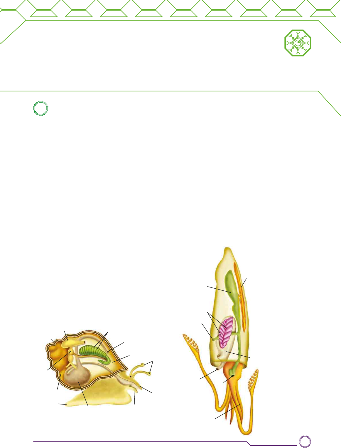 1 Moluscos O filo Mollusca (moluscos) é representado prin- cipalmente por seres marinhos, embora haja algu- mas espécies terrestres e outras de água doce. O corpo mole dá nome ao grupo (do latim mollis = mo- le). Várias espécies do mar são utilizadas como ali- mento pelo ser humano: polvo, lula, caracol, ostra, mexilhão, etc. Esses animais são popularmente co- nhecidos como “frutos do mar” junto com os crus- táceos, outro grupo que estudaremos mais adiante. Os moluscos apresentam simetria bilateral, são triblásticos e celomados: isso significa que no embrião se forma uma cavidade no interior da me- soderme. No adulto, o celoma origina a cavidade geral do corpo, situada entre a epiderme e o tubo digestório. Essa cavidade fornece espaço para o desenvolvimento de vários órgãos, além de facili- tar o transporte de substâncias e de funcionar, em certos casos, como um esqueleto hidrostático. O corpo dos moluscos é dividido em três par- tes: cabeça (ou região cefálica), pé e massa visce- ral. Ao longo da evolução, essas partes sofreram transformações e passaram a ser diferentes em cada grupo de moluscos (figura 11.1). ◆ Quais são os animais popularmente conhecidos como “frutos do mar”? ◆ Você já deve ter visto vários tipos de conchas. Como são os animais que produzem essas carapaças? ◆ Em que ambiente é comum encontrar minhocas? ◆ Que outros grupos de animais são classificados como anelídeos? Quais as principais características desses animais? Na cabeça estão os órgãos sensoriais e os gân- glios cerebrais. O pé apresenta-se musculoso e, em alguns animais, pode estar transformado em braços, como nos polvos. A massa visceral contém os principais órgãos internos do animal. Ela é revestida por uma dobra da epiderme (manto ou pálio), que delimita uma cavidade entre ela e a massa visceral, chamada ca- vidade palial ou cavidade do manto. Nessa cavidade estão as aberturas dos sistemas digestório e excre- tor e as brânquias (nas espécies aquáticas) ou os pulmões (nas espécies terrestres). Na epiderme do manto há glândulas que secretam uma concha calcária, estrutura rígida e resistente à decomposição. Na lesma e no polvo, a concha está ausente. Na lula, ela é interna e reduzida (figura 11.2). brân quias ânus órgão excre tor cora ção estô ma go con cha pé man to (no interior da concha) glândula digestória Caracol rádu la ten tá cu los cabe ça Figura 11.1 Representação do corpo dos moluscos (os elementos da ilustração não estão na mesma escala; cores fantasia). Il u s tr a ç õ e s : L u is M o u ra /A rq u iv o d a e d it o ra concha interna boca pé transformado em tentáculos cavidade do manto Lula brânquias ânus sifão tubo digestório Figura 11.2 Corpo das lulas (os elementos da ilustração não estão na mesma escala; cores fantasia). Moluscos e anelídeos 141 140_151_U04_C11_Bio_Hoje_vol_2_PNLD2018.indd 141 05/05/16 08:29 O tubo digestório é completo. A maioria dos mo- luscos apresenta na boca uma estrutura característi- ca do grupo, semelhante a uma língua com pequenos dentes de quitina, a rádula (do latim radula = peque- no raspador; figura 11.3). Com esse órgão, o animal raspa algas e outros alimentos presos nas pedras e nas conchas de outros moluscos e os envia para o tubo digestório. Detalhe da cabeça Figura 11.3 Os músculos da boca movimentam a rádula e permitem a trituração dos alimentos (os elementos da ilustração não estão na mesma escala; cores fantasia). A maioria dos moluscos tem respiração bran- quial. Localizadas em geral na cavidade do manto (reveja a figura 11.2), as brânquias retiram o oxigênio dissolvido na água, que é levado pelo sangue para todas as células do corpo. Em alguns caracóis (terrestres) e caramujos de água doce, a cavidade palial transforma-se em uma câmara cuja parede é irrigada de sangue. Essa câma- ra funciona como um pulmão, retirando oxigênio do ar atmosférico. Em algumas lesmas, as trocas gaso- sas ocorrem através da pele, que é permeável e deve estar sempre úmida. Na maioria dos moluscos, a circulação é aberta, ou seja, o sangue não fica restrito apenas aos vasos sanguíneos. O sangue oxigenado proveniente das brânquias passa pelo coração (órgão dorsal musculo- so e contrátil), que o impulsiona por um sistema ra- mificado de vasos e de lacunas chamados hemoceles. Os órgãos estão mergulhados nessas cavidades e são banhados por sangue (figura 11.4). O coração está si- tuado em uma cavidade cheia de líquido, a cavidade pericárdica (do grego peri = ao redor), que é o que restou do celoma no adulto. coração cavidade pericárdica rim brânquias veiahemocele pé artéria estômago Figura 11.4 Esquema geral da circulação aberta dos moluscos (os elementos da ilustração não estão na mesma escala; cores fantasia). íris lente (cristalino) retina nervo óptico córnea olho cérebro nervos rádula mús cu los No polvo e na lula a circulação é fechada: o san- gue circula sempre dentro de vasos, e as trocas de nutrientes e gases ocorrem entre os capilares e os tecidos. As excretas saem do sangue, caem na ca- vidade pericárdica e são retiradas por um rim for- mado por tubos, algumas vezes ciliados, os meta- nefrídios, que as lança na cavidade palial pelo poro renal. O sistema nervoso é formado por vários pares de gânglios unidos por cordões nervosos (figura 11.5). Figura 11.5 Sistema nervoso de moluscos e, no detalhe, ampliado, olho do polvo (um polvo pode medir de alguns centímetros a alguns metros de comprimento, conforme a espécie; cores fantasia). Na foto, os olhos do polvo-gigante-do-Pacífico (esse polvo atinge, em média, 4 m de comprimento). L u is M o u ra /A rq u iv o d a e d it o ra L u is M o u ra /A rq u iv o d a e d it o ra A le x a n d e r S e m e n o v /S P L In g e b o rg A s b a ch /A rq u iv o d a e d it o ra 142 Capítulo 11 140_151_U04_C11_Bio_Hoje_vol_2_PNLD2018.indd 142 05
