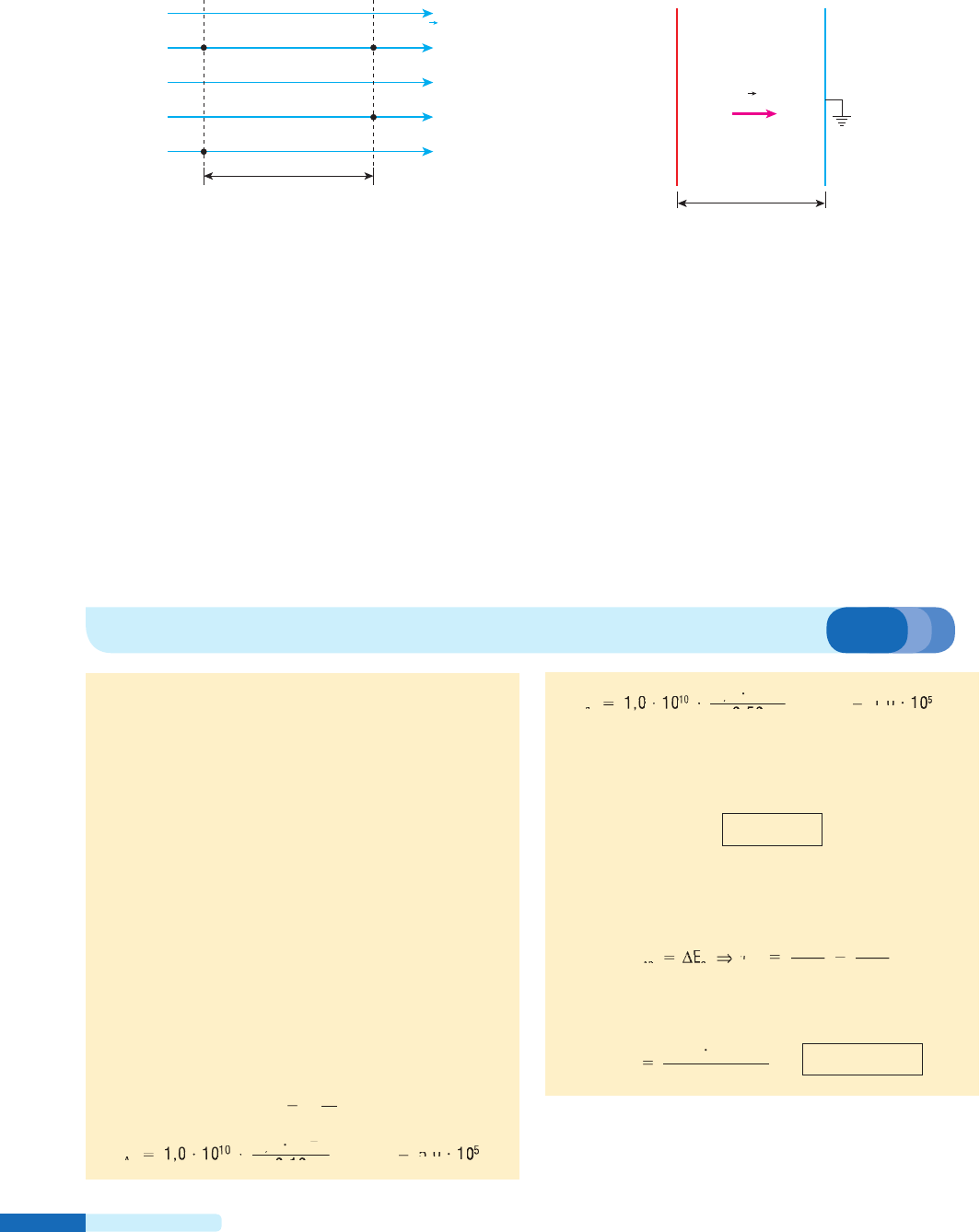 Parte I – Eletrostática78 28. (EN-RJ) Na configuração a seguir estão representadas as li- nhas de força e as superfícies equipotenciais de um campo elétri- co uniforme de intensidade igual a 2 ? 102 V/m: D B d A C 60 V 20 V E Considere as afirmativas abaixo: I. A separação d entre as superfícies equipotenciais vale 0,2 m. II. O trabalho realizado pela força elétrica para deslocar uma car- ga q 5 6 µC de A para C vale 24 ? 10–5 J. III. O trabalho realizado pela força elétrica para deslocar uma car- ga q 5 6 µC de A para B é maior que o realizado para deslocar a carga de A para C. IV. O trabalho realizado pela força elétrica para deslocar qualquer carga elétrica de D para A é nulo. V. A energia potencial elétrica de uma carga localizada no ponto C é maior que a da mesma carga localizada no ponto B. São verdadeiras: a) I, II, III e IV. d) I, II, III e V. b) I, II e IV. e) III e V. c) II, IV e V. 29. Entre duas placas condutoras, eletrizadas com cargas de mesmo módulo, mas de sinais opostos, existe um campo elétrico uniforme de intensidade 500 V/m. – – – – – – – – – + + + + + + + + + d A B E Sabendo que a distância entre as placas A e B vale d 5 5,0 cm e que B está ligada à terra, calcule o potencial elétrico da placa A. 30. (PUC-SP) Indique a afirmação falsa: a) Uma carga negativa, abandonada em repouso num campo eletrostático, fica sujeita a uma força que realiza sobre ela um trabalho negativo. b) Uma carga positiva, abandonada em repouso num campo eletrostático, fica sujeita a uma força que realiza sobre ela um trabalho positivo. c) Cargas negativas, abandonadas em repouso num campo ele- trostático, dirigem-se para pontos de potencial mais elevado. d) Cargas positivas, abandonadas em repouso num campo ele- trostático, dirigem-se para pontos de menor potencial. e) O trabalho realizado pelas forças eletrostáticas ao longo de uma curva fechada é nulo. 31. E.R. Uma partícula fixa, eletrizada com carga 1 5,0 µC, é responsável pelo campo elétrico existente em determinada região do espaço. Uma carga de prova de 1 2,0 µC e 0,25 g de massa é abandonada a 10 cm da carga-fonte, recebendo desta uma força de repulsão. Determine: a) o trabalho que o campo elétrico realiza para levar a carga de prova a 50 cm da carga-fonte; b) a velocidade escalar da carga de prova, submetida exclu- sivamente ao campo citado, quando ela estiver a 50 cm da carga-fonte. Dado: constante eletrostática do meio 5 1,0 ? 1010 N m2 C–2. Resolução: a) O trabalho realizado pelo campo elétrico é calculado pela relação: τAB 5 q (νA 2 νB) (I) em que νA é o potencial na posição inicial e νB, o potencial na posição final. Assim, vamos calcular νA e νB usando a expressão: ν K Q d 5 ν ⇒ν ⇒ νAν ⇒ν ⇒10ν ⇒ν ⇒ 6 A1,0ν ⇒ν ⇒1,0ν ⇒ν ⇒10ν ⇒ν ⇒5,0ν ⇒ν ⇒10 0,10 ν ⇒ν ⇒ 5,0 1ν ⇒ν ⇒ν ⇒ν ⇒ν ⇒ν ⇒? 5 ?5,0 2 0 V0050 V0 V ν ⇒ν ⇒ νBν ⇒ν ⇒10ν ⇒ν ⇒ 6 B1,0ν ⇒ν ⇒1,0ν ⇒ν ⇒10ν ⇒ν ⇒5,0ν ⇒ν ⇒10 0,50 ν ⇒ν ⇒ 1,0 1ν ⇒ν ⇒ν ⇒ν ⇒ν ⇒ν ⇒? 5 ?1,0 2 0 V0050 V0 V Voltando à relação (I), temos: τAB 5 2,0 ? 1026 ? (5,0 ? 105 2 1,0 ? 105) τAB 5 0,80 J b) Como a partícula está exclusivamente sob a ação do campo elétrico, a força elétrica é a força resultante. Vamos usar, então, o Teorema da Energia Cinética. τ τABτ ττ τC AB B 2 A 2 E mv 2 mv 2 5 5τ ττ τ 2∆ ⇒τ ττ τEτ ττ τ∆ ⇒τ ττ τCτ ττ ττ ττ ττ ττ ττ ττ τ Sendo m 5 0,25 ? 10–3 kg, vA 5 0 e tAB 5 0,80 J, temos: 5 ? 2 ⇒0,80 0,25 10 v 2 3 B 2 vB 5 80 m/s 32. A figura representa uma distribuição discreta de cargas elé- tricas Q1 5 15 nC, Q2 5 60 nC e Q3 5 2 45 nC no vácuo. Dado: K0 5 9,0 ?109 N m2/C2. Exercícios nível 2 TF3-065_110_P1T3.indd 78 20/08/12 10:31 Tópico 3 – Potencial elétrico 79 B Q 2 3 m 4 m Q 1 A 8 m 3 m 3 m Q 3 C a) Qual a diferença de potencial entre os pontos A e B? b) Qual o trabalho necessário para levar uma carga elétrica de 10 mC do ponto A para o ponto B? 33. (Mack-SP) Uma partícula de massa 1 g, eletrizada com car- ga elétrica positiva de 40 µC, é abandonada do repouso no pon- to A de um campo elétrico uniforme, no qual o potencial elétrico é 300 V. BA Anteparo Essa partícula adquire movimento e se choca em B, com um antepa- ro rígido. Sabendo-se que o potencial elétrico do ponto B é de 100 V, a velocidade dessa partícula ao se chocar com o obstáculo é de: a) 4 m/s. c) 6 m/s. e) 8 m/s. b) 5 m/s. d) 7 m/s. 34. Ao colocarmos duas cargas pontuais q1 5 5,0 µC e q2 5 2,0 µC a uma distância d 5 30,0 cm, realizamos trabalho. Determine a energia potencial eletrostática, em joules, deste sistema de car- gas pontuais. Dado: K 5 9 ? 109 N m2/C2. 35. Um próton penetra com energia cinética de 2,4 ? 10216 J em uma região extensa de campo elétrico uniforme de intensidade 3,0 ? 104 N/C. A trajetória descrita é retilínea, com a partícula inver- tendo o sentido de movimento após percorrer uma distância d. Qual é o valor de d, sabendo-se que o próton se moveu no vácuo? Dado: carga do próton 5 1,6 ? 10219 C. 36. Um próton é acelerado no vácuo por uma diferença de poten- cial de 1 MV. Qual o aumento da sua energia cinética? Dado: carga do próton 5 1,6 ? 10219 C. 37. Determinada região submete-se exclusivamente a um campo elétrico, estando algumas de suas linhas de força representadas por linhas cheias na figura a seguir. S P R a) O que as linhas tracejadas representam? b) O potencial do ponto R é maior, que o potencial do ponto S, menor que ele ou igual a ele? c) Se uma carga de prova positiva for abandonada no ponto P, em que sentido ela se moverá? O que ocorrerá com sua energia potencial? d) Repita o item c, empregando, agora, uma carga de prova negativa. 38. (UFBA) A figura apresenta as linhas de força de um campo elétrico uniforme, de intensidade igual a 100 N/C, gerado por du