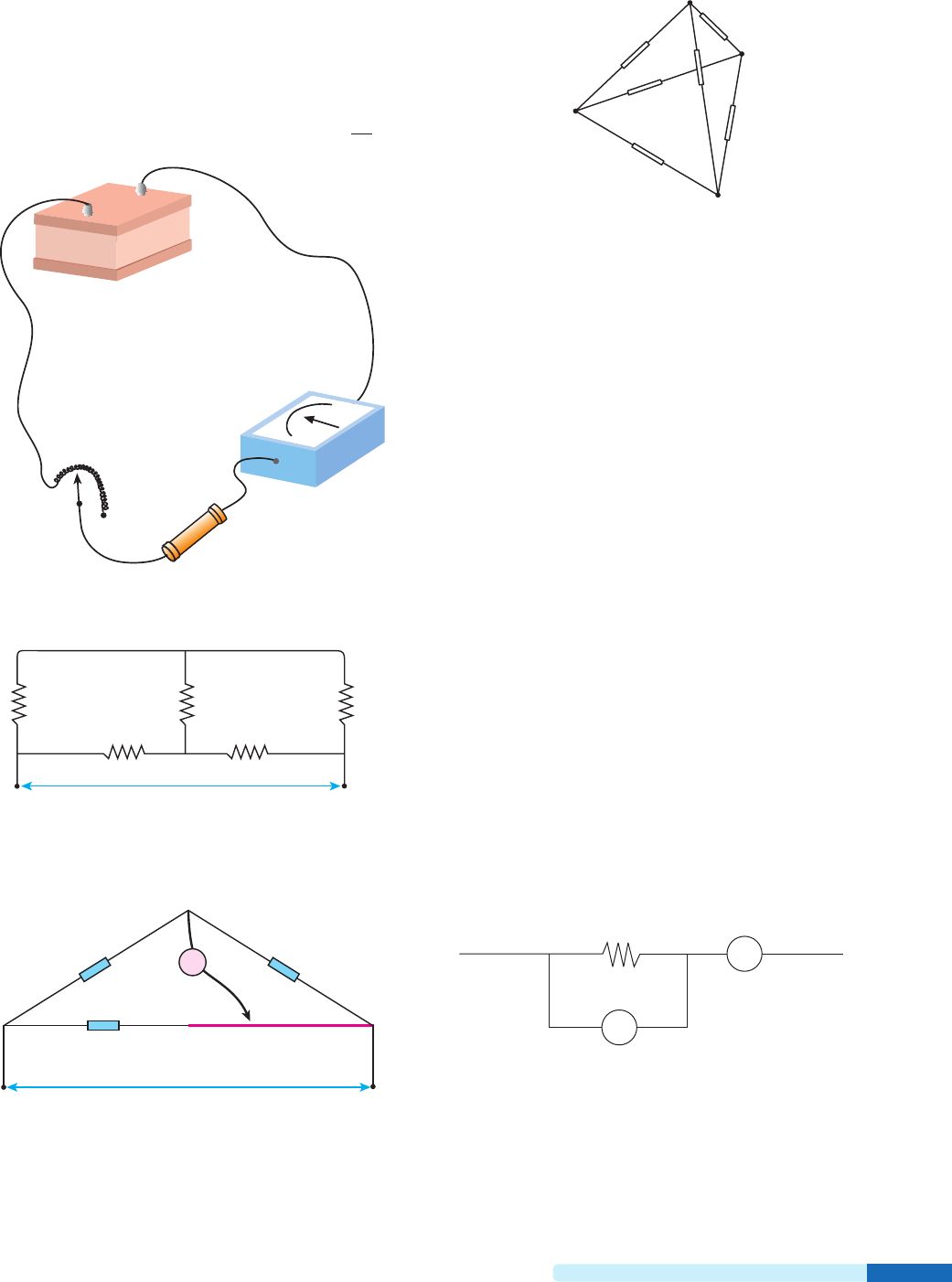Tópico 2 – Associação de resistores e medidas elétricas 165 64. (Cesgranrio-RJ) No circuito representado, a resistência do am- perímetro é desprezível e a diferença de potencial entre os terminais da bateria é 12 V. A resistência máxima do reostato é de 6,0 Ω. Quando o contato móvel encosta em M (reostato fora do cir- cuito), o amperímetro indica 1,0 A. A potência dissipada no resistor é, então, PM. Quando o contato móvel encosta em N (reostato todo no circuito), a potência dissipada no resistor é PN. Calcule P P M N . Amperímetro – + N M 12 V Reostato Resistor 65. No circuito representado a seguir, calcule R1 para que a po- tência dissipada no resistor de 10 Ω seja nula. R 1 2 Ω 10 Ω 15 Ω 30 Ω U A B 66. Na ponte esquematizada na figura, AB é um fio homogêneo de secção transversal uniforme. Seu comprimento é de 120 cm e sua resistência elétrica é de 60 Ω: G U A C 500 ΩR B 100 Ω O equilíbrio da ponte é conseguido quando o cursor C encontra- -se a 20 cm de A. Calcule a resistência R. 67. (ITA-SP) Considere um arranjo em forma de tetraedro construído com 6 resistências de 100 Ω, como mostrado na figura. C B A D Pode-se afirmar que as resistências equivalentes RAB e RCD entre os vértices A e B e C e D, respectivamente, são: a) RAB 5 RCD 5 33,3 Ω. b) RAB 5 RCD 5 50 Ω. c) RAB 5 RCD 5 66,7 Ω. d) RAB 5 RCD 5 83,3 Ω. e) RAB 5 66,7 Ω e RCD 5 83,3 Ω. 68. (Vunesp-SP) A corrente que corresponde à deflexão máxi- ma do ponteiro de um galvanômetro é de 1,0 mA e sua resistên- cia, de 0,5 Ω. Qual deve ser o valor da resistência que precisa ser colocada nesse aparelho para que ele se transforme em um voltímetro apto a medir até 10 V? Como deve ser colocada essa resistência: em série ou em paralelo com o galvanômetro? 69. A escala de um amperímetro apresenta 100 divisões e seu fundo de escala é de 5 A. Sendo de 1,8 Ω a resistência elétrica desse medidor, determine: a) o número de ampères por divisão; b) como deve ser associado um resistor e qual deve ser a sua resistência, para que o medidor possa medir correntes de até 20 A; c) o número de ampères por divisão na situação descrita no item b. 70. (Vunesp-SP) Um estudante utiliza-se das medidas de um voltí- metro V e de um amperímetro A para calcular a resistência elétrica de um resistor e a potência dissipada nele. As medidas de corrente e voltagem foram realizadas utilizando o circuito da figura a seguir. R A V O amperímetro indicou 3 mA e o voltímetro, 10 V. Cuidadoso, ele lembrou-se de que o voltímetro não é ideal e que é preciso consi- derar o valor da resistência interna do medidor para se calcular o valor da resistência R. Se a especificação para a resistência interna do aparelho é 10 kΩ, calcule: a) o valor da resistência R obtida pelo estudante; b) a potência dissipada no resistor. TF3-142_167_P2T2_5P.indd 165 20/08/12 10:35 Parte II – Eletrodinâmica166 71. No circuito apresentado a seguir, um dos resistores tem re- sistência R0. Determine R1 em função de R0, para que a resistên- cia vista pelos terminais A e B seja igual a R0: R 0 R 1 R 1 B A R 1 72. Determine a resistência equivalente entre A e B, no circuito a seguir: B A 100 Ω 100 Ω 400 Ω 300 Ω600 Ω 73. Na associação esquematizada a seguir, a ddp entre os pon- tos A e B é igual a 30 V: E B A C D 15 Ω 30 Ω 36 Ω 5 Ω 3 Ω 3 Ω Determine a intensidade de corrente no fio CD, de resistência desprezível. 74. No esquema a seguir, R 5 10 Ω e os fios de ligação têm re- sistência desprezível. O potencial da Terra é considerado nulo e o potencial no ponto A é de 10 V. R R A R(10 V) R R 0 V C D B Determine: a) a resistência equivalente ao sistema esquematizado; b) a intensidade de corrente em D; c) o potencial em B; d) a resistência equivalente ao sistema, se o circuito for aberto no ponto C; e) a potência dissipada no sistema, com o circuito aberto em C. 75. (UFJF-MG) Um disjuntor é um interruptor elétrico de pro- teção que desarma quando a corrente num circuito elétrico ul- trapassa um certo valor. A rede elétrica de 110 V de uma resi- dência é protegida por um disjuntor de 40 ampères, com tolerância de ± 5%. Se a residência dispõe de um chuveiro elé- trico de 3 960 watts, um ferro de passar roupas de 880 watts e algumas lâmpadas de 40 watts: a) Determine o maior valor da corrente que passa pelo disjuntor, abaixo do qual ele não desarma, com certeza (o limite inferior da faixa de tolerância). Determine também o menor valor da corrente, acima do qual o disjuntor desarma, com certeza (o limite superior da faixa de tolerância). b) O chuveiro e o ferro de passar roupas podem ser ligados juntos sem que o disjuntor desarme? Justifique por meio de cálculos. c) Quando o chuveiro está ligado, quantas lâmpadas podem ser ligadas sem que o disjuntor desarme com certeza? Justifique por meio de cálculos. 76. (ITA-SP) Na figura, AB re- presenta um resistor filiforme, de resistência r e comprimento L. As distâncias AP e QB são 2L 5 e L 5 , respectivamente. A resistência R vale 0,40 r. Quan- do a chave C está aberta, a cor- rente constante i0 5 6,00 A passa por r. Quando a chave C for fechada, a corrente que entrará em A será: a) 7,5 A. b) 12,0 A. c) 4,5 A. d) 9,0 A. e) indeterminada, pois o valor de r não foi fornecido. 77. (PUC-SP) No circuito indicado, não há passagem de cor- rente pelo galvanômetro. Determine as intensidades de corren- te i1 e i2. i 1 20 Ω + – 12 V R X 15 Ω – + 6 V G i 2 Bateria R P Q A B L C Exercícios nível 3 TF3-142_167_P2T2_5P.indd 166 20/08/12 10:35 Tópico 2 – Associação de resistores e medidas elétricas 167 78. (ITA-SP) O circuito da figura a seguir, conhecido como ponte de Wheatstone, está sendo utilizado para determinar a tempera- tura do óleo de um reservatório, no qual está inserido um resistor de fio de tungstênio RT. O resistor variável R é ajustado automati- camente de modo a manter a ponte sempre 
