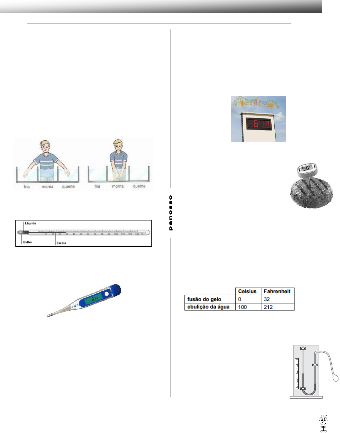 Temperatura – 9º ano (E.F. II) 1 Ciências / Física Instruções: Necessárias respostas completas e detalhadas. Havendo necessidade de cálculo, todas as contas devem estar indicadas na resolução. 1) As medidas de temperatura utilizando termômetro normalmente demoram algum tempo. É preciso colocar o termômetro em contato com o objeto a ser medido e esperar antes de fazer a leitura. Por que devemos esperar esse tempo? 2) O tato como termômetro. Diversas vezes usamos o tato para medir a temperatura de um objeto. Veja a sequência desenho abaixo. Um menino após sua alua de ciências resolve fazer uma experiência em casa. Mergulha uma de suas mãos em uma vasilha com água quente e a outra mão em uma vasilha com água fria, passados alguns minutos ele mergulha as duas mãos em uma vasilha com água morna, o que ele vai estar sentindo em cada mão? Será que apenas com o tato somos capazes de medir a temperatura de objetos? Explique sua resposta. 3) A figura abaixo representa um termômetro clínico, também chamado de termômetro de mercúrio. Explique seu funcionamento, descrevendo o que ocorre com o mercúrio quando a temperatura variar. 4) Existem vários tipos de termômetros, dentre eles, os termôme- tros digitais vem se tornando cada vez mais populares. Faça uma pesquisa (na internet, indicando a fonte) e explique o funcionamen- to desse tipo de termômetro digital, descrevendo que grandeza física vária com a temperatura. 5) Uma zelosa mamãe ao preparar a mamadeira de seu filho, resolve pingar algumas gotas de leite nas costas de sua mão. Com isso ela pretende avaliar a temperatura do leite para poder servir ao seu filho. Esse teste para verificar a temperatura é bom? Explique sua resposta baseado no conceito de medida de temperatura. 6) Desejando-se medir a temperatura de um pequeno inseto, colocou-se um grande número deles em um recipiente. Introduzindo-se entre os insetos um termômetro, verificou-se que, depois de um certo tempo, o termômetro indicava 30oC. Para determinar a temperatura de cada inseto seria necessário conhecer o número deles no recipiente? Explique sua resposta baseando no conceito de equilíbrio térmico. Qual era a temperatura de um dos insetos? 7) Num site de notícias, lê-se no jornal que a temperatura em certa cidade da Rússia atingiu, no inverno, o valor de 14o F. Curioso, um estudante resolveu converter para a escala Celsius para ter noção do frio. Qual o valor dessa temperatura na escala Celsius encontrado pelo estudante? 8) Um turista brasileiro ao desembarcar em Londres no mês de julho, verificou que um termômetro de rua indicava 67 graus. Ele ficou intrigado com aquele valor, pois estava sentindo frio. Depois de algum tempo descobriu que aquela temperatura era na escala Fahrenheit. Se o termômetro de rua pudesse indicar a temperatura em Celsius, qual seria esse valor? 9) Um famoso chef de cozinha internacional estava de passagem pelo Brasil e deu uma aula rápida sobre preparo de carnes. Victor estava nessa aula e percebeu que o chef usada um termômetro digital para verificar o ponto ideal de preparo da carne (foto). Victor notou que a temperatura ideal era de 160 ºF. Quando foi repetir o procedimento em casa notou que seu termômetro era em Celsius. Qual deve ser a temperatura que Victor deve usar para verificar se a carne está pronta com o seu termômetro. 10) Um termômetro digital, localizado em uma praça da Inglaterra, marca a temperatura de 10,4 F. Essa temperatura, na escala Celsius, corresponde a a) –5 °C b) –10 °C c) –12 °C d) –27 °C e) –39 °C 11) Um turista estrangeiro leu em um manual de turismo que a temperatura média do estado do Amazonas é de 87,8 graus, medido na escala Fahrenheit. Não tendo noção do que esse valor significa em termos climáticos, o turista consultou um livro de Física, encontrando a seguinte tabela de conversão entre escalas termométricas: Com base nessa tabela, o turista fez a conversão da temperatura fornecida pelo manual para a escala Celsius e obteve o resultado: a) 25. b) 31. c) 21. d) 36. e) 16. 12) Um termoscópio é um dispositivo experimental, como o mostrado na figura, capaz de indicar a temperatura a partir da variação da altura da coluna de um líquido que existe dentro dele. Um aluno verificou que, quando a temperatura na qual o termoscópio estava submetido era de 15°C, ele indicava uma altura de 5mm. Percebeu ainda que, quando a altura havia aumentado para 25mm, a temperatura era de 35°C. Quando a temperatura for de 20°C, qual a altura da coluna de líquido? http://www.professorpanosso.com.br/ Temperatura – 9º ano (E.F. II) 2 Ciências / Física 13) Um profissional, necessitando efetuar uma medida de temperatura, utilizou um termômetro cujas escalas termométricas inicialmente impressas ao lado da coluna de mercúrio estavam ilegíveis. Para atingir seu objetivo, colocou o termômetro inicialmente numa vasilha com gelo fundente, sob pressão normal, e verificou que no equilíbrio térmico a coluna de mercúrio atingiu 8 cm. Ao colocar o termômetro em contato com água fervente, também sob pressão normal, o equilíbrio térmico se deu com a coluna de mercúrio atingindo 20 cm de altura. Se ao medir uma amostra de água com esse termômetro a temperatura encontra for de 11 cm, que valor seria encontrado caso a leitura estivesse em Celsius? 14) Um cientista russo cria uma nova escala de temperatura e dá a ela nome de seu filho Yuri. Nesta escala, a temperatura de fusão do gelo vale 20°Y e a temperatura de ebulição da água vale 120°Y. Utilizando um termômetro graduado nesta escala para medir a temperatura corporal de seu filho, o cientista encontra o valor de 55°Y. O menino está com febre? Justifique sua resposta calculando o valor da temperatura indicada na escala Celsius. 15) Largamente utilizados na medicina, os termômetros clínicos de mercúrio relacionam o comprimento da coluna de mercúrio com a temperatura. Sabendo-se que