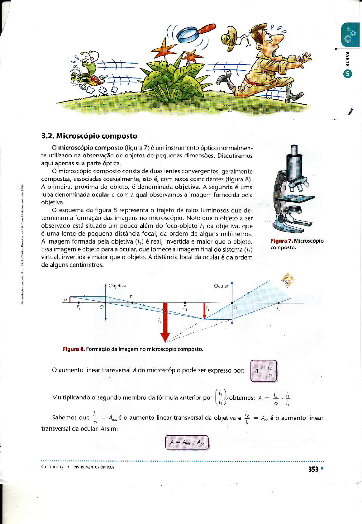 3.2. Microscópio composto O microscópio composto (figura 7) é um ìnstrumento óptico normalmen- te utilizado na observação de obietos de pequenas dÌmensões. Dìscutiremos aqui apenas sua pãte óptica. O microscópio composto consta de duas lentes convergentes, geralmente compostas, associadas coaxialmente, isto é, com eixos coincidentes (figura 8). A primeira, pÍóxima do objeto, é denominada objetìva. A segunda é uma lupa denominada ocular e com a qual obselvamos a ìmagem íornecida pelâ obj€tiva. O esquema da f igura 8 representa o trajeto de raios luminosos que de- teÍrninam a formação das imagens no micfoscópio. Note que o obieto a ser observado está situado um pouco além do foco-objeto Fì da objetiva, que é uma lente d€ pequena distância focal, da ordem de alguns milímetros. A imagem formada pela objetiva ( i) é real, invert ida e maior que o obieto. Essa imagem é objeto para a ocular, quefornece a imagem finaldo sistema (L) virtual, invertìda e maior oue o obieto. A distáncia focal da oculaÍ é da ordem de alguns centimetros. f iguÍà 7, l\4icroscópio O aumento lineaÍ transveÍsal ,4 clo microscópio OoO" ,"r" ""Or"so Oor, F aTÌ Multiplicandb, o segundo membro da Íórmula ant"rior. nor" l1),oft"ror, ,t = Sabemo) que / 4.e o aumento l inea' tran5versdl da objet iva e i - Á- ê o aumento l inedÍ o" ' i l transversal da oculaf. Assim: 2.: ! FiguÌa a, Formação da imagem no m icros(ópio composto. CÀPrÌuLo 15 . lN$RuMENros óPÌ .os 353 . o aumento l in€ar transversal À do microscópio composto é dado pelo produ- to dos aumentos lineares transversãìs da objetiva e da oculat Os microscópios compostos pÍoduzem aumentos entre 300 e 2,000 vezes, aproximadaÍnente. Os Ínicroscópios eletrônÌcos, por sua vezl peÍmitem auÍnentos muito rnaioÍes que os obtidos nos microscópios ópticos. Ness€s aparelhos, em vez de luz, ut i l izam-se feixes de elétÍons que são desviados poÍ campos magnéticos que funcionam como verdadeiras "lentes magnéticâs". A imagem formada não é obseÍvada diretamente; obtêm-se "ÍotograÍìaí 'delâ ou imagens na tela de um oscìloscópio, A maior pâfte dos micÍoscópios el€trônicos produz aumentos supe- rloÍes a cem milvezes. a : a j evoruru com o pâssaÌ microscópiodo século XVllle (2) micrôscópio de 1876 - âté os mais modêmos (foto 3, na quãlhá uma(âmerã fotográfica a(opl.da .354 Os FUNDAMTNÌo5DÁ Fltc^ ffitr ffi u..i".o""Opio composto é constituído por duas lentes convergentes com distânciâs locais de 5 mm (objef va) e 4,8 cm (ocular). De um objeto a 5,1 mh da objetlva, o instrumento fornece uma imagem viÌtual a 24 cm dâ ôculâr. Determlóe: a) ô âunenro I'ned trâìsversal daobjettvâ e dâ oculari b) o âumenro linee trdsvêrsãl do microscópiol c) a distânciâ d entre as duõ lent$. Solüção: a) Esquematizando â Íormaçáo daimâgem, temos: d -', A abscissa da imagem ij na objetiva em quepÌ = 5,1 nn e f, = 5 mm é caÌcülada pela equação de Gauss: t l l l Ì l t l t rn,pìpi \ppSt, l l5, l 510,1 í ,s.s pi- E.s = P O ãumento lineâr úânsversaÌ dâ objetiva vãlei o t e ! & E E E & 3 ^: i : -*-4":- f f=[ , ,* : :aì Pâra a oculâ! lÌ é objeto e suã âbscissãp? ê cãlculadâ pelâ equação d€ Caussl Sendop, = 24 cm (imagen ürtuaÌ) e f, = 4,8 cm, vem: 1 1 I 1 1 f 1ì 1 p t - p; p 4.8 \ .24) p- O aumenÌo lined trasversal da ocular vaÌe: ^=ì= * -^= l+ l -@ b) O aunento llneâr transveÍsâlá do microscóplo é dado pelo produto dos aumentos da objetiva ê dâ Á=.4.1 . , { - +,4=( sol .e = Gl :oôl À imâgèm formada é vlrtuâÌ, lnvertldâ (âum€nto negativo) e 300 vezes mâlor que oobjeto. c) Obseúe que â distância d entre as lentes é 'guaÌ àsoma: d = p', + p, Comôp'Ì : 255 mm = 25,5 cm e p, = 4 cm, resultã: d: 2E,s + 4 è G= ,ri ;-ì Respostas: a),4,,b = 50 e Á"" : 6i b),4 : 300t c) d = 29,5 cm t : f, =9 24 5+1 1 24 p, 11 CÀPÌuLo15 . lNÍNuMËNÌosoa(o5 355 .
