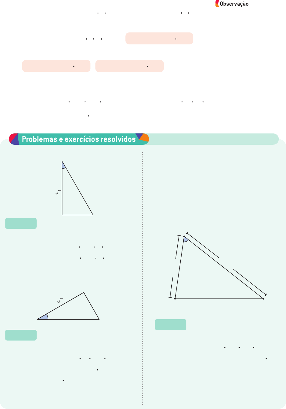 4 3 x 8 30 o 10 ª 55 3 A C B x 960 km 60 6 0 0 k m o 42 R13. Determine o valor de x no triângulo. R14. Determine a medida α no triângulo. R15. Uma das rotas de uma companhia aérea parte da cidade A, faz escala na cidade B e, finalmente, chega à cidade C. A companhia aérea pretende criar uma nova rota, que parta da cidade A e che- gue à cidade C, sem que haja escalas. Utilizando o esquema abaixo, que apresenta a distância em linha reta entre as cidades A e B e entre as cidades B e C, determine a distância em linha reta entre as cidades A e C. Substituindo II em I: a 2 5 b 2 2 m 2 ⏟ h 2 1 c 2 2 2 ?? c ?? m 1 m 2 ä a 2 5 b 2 1 c 2 2 2 ?? c ?? m De III, segue que: a 2 5 b 2 1 c 2 2 2 ?? c ?? b ?? cos ̂ A ⏟ m ä a 2 5 b 2 1 c 2 2 2bc ?? cos ̂ A De maneira análoga, podemos demonstrar que em um triângulo acutângulo valem as relações b 2 5 a 2 1 c 2 2 2ac ?? cos ̂ B e c 2 5 a 2 1 b 2 2 2ab ?? cos ̂ C . Utilizando a lei dos cossenos, vamos determinar o comprimento do túnel apresentado na página anterior, isto é, a distância entre os pontos A e B. Resolução Utilizando a lei dos cossenos, segue que: 5 2 5 10 2 1 ( 5 √ ― 3 ) 2 2 2 ?? 10 ?? 5 √ ― 3 ?? cos α ä ä 25 5 100 1 75 2 100 √ ― 3 ?? cos α ä ä 100 √ ― 3 ? ? cos α 5 175 2 25 ä ä cos α 5 150 ― 100 √ ― 3 ä cos α 5 √ ― 3 ― 2 ä α 5 308 Resolução Aplicando a lei dos cossenos, obtemos: x 2 5 ( 4 √ ― 3 ) 2 1 8 2 2 2 ?? 4 √ ― 3 ?? 8 ?? cos 30 o ä ä x 2 5 48 1 64 2 2 ?? 4 √ ― 3 ?? 8 ?? √ ― 3 ― 2 ä ä x 2 5 112 2 96 ä x 2 5 16 ä x 5 √ ― 16 5 4 Resolução Utilizando a lei dos cossenos, temos: x 2 5 600 2 1 960 2 2 2 ?? 600 ?? 960 ?? cos 60 o ä ä x 2 5 360 000 1 921 600 2 1 152 000 ?? 1 ― 2 ä ä x 2 5 1 281 600 2 576 000 ä ä x 2 5 705 600 ä x 5 √ ― 705 600 5 840 Portanto, a distância em linha reta entre as ci- dades A e C é 840 km. Vimos a demonstração para um triângulo acutângulo; porém, a lei dos cossenos também é válida para os triângulos retângulos e obtusângulos. ( AB ) 2 5 ( AC ) 2 1 ( BC ) 2 2 2 ?? ( AC ) ?? ( BC ) ?? cos ̂ C ä ( AB ) 2 5 70 2 1 80 2 2 2 ?? 70 ?? 80 ?? 2 cos ( 180 + 2 120 + ) cos 120 + ä ä ( AB ) 2 5 4 900 1 6 400 2 11 200 ?? ( 2 1 ― 2 ) ä AB 5 √ ― 16 900 ä AB 5 130 é 130 m Se achar conveniente, peça aos alunos que, em duplas, realizem a demonstração da lei dos cossenos para triângulos obtusângulos e retângulos. Veja na Assessoria pedagógica essas demonstrações. R a fa e l L . G a io n R a fa e l L . G a io n R a fa e l L . G a io n g21_scp_lt_2mat_c1_p034a045.indd 42g21_scp_lt_2mat_c1_p034a045.indd 42 9/20/20 10:14 AM9/20/20 10:14 AM Não escreva no livro. 45 o 6 x 3 2 r r 8 ª O 60 x 2x 120 o o 4 7 cm A D B C x x 10 6 60o 60 o F E D C A B α C B E F AD 60 o 43 51. Determine o valor do seno e do cosseno dos ângulos de: a ) 150o . b ) 135o . c ) 110o . d ) 126o . e ) 152o . f ) 137 o. 52. Determine o valor de x no triângulo a seguir. 55. Determine o perímetro do paralelogramo. 56. De um ponto A partem, em um mesmo instan- te, dois móveis, M 1 em direção a B , a uma velo- cidade de 3 m/s, e M 2 em direção a C , a uma velocidade de 5 m/s. Sabendo que o ângulo for- mado entre os segmentos ‾AB e ‾AC mede 30o, determine a distância aproximada entre os mó- veis após 12 segundos. 57. Qual é o perímetro do quadrado ABCD na figura? 58. (UFPE) Na ilus tração abaixo, ABCD e ABEF são retângulos, e o ângulo DÂF mede 60o. Se ‾AB mede 2√ ― 30, _ BE mede 6 e ‾BC me de 10, qual a distân cia entre os vértices C e F? 53. Determine o comprimento do raio r da circunfe- rência de centro O, sabendo que cos α 5 7― 25 . 59. Na figura, AB 5 4 cm , BC 5 5 cm e AC 5 6 cm . Determine o comprimento de ‾BD . 54. Desenhe um triângulo ABC em que estejam indicados os comprimentos de ‾AB , ‾BC e ‾AC , e peça a um colega que calcule cos B ̂. Em segui- da, verifique se a resposta obtida está correta. aproximadamente 34 m Veja a resposta na Resolução dos problemas e exercícios na Assessoria pedagógica. x 5 3 √ ― 2 20― 3 Resposta pessoal. Possível resposta: uma possibilidade é que se desenhe um triângulo tal que AB 5 3 cm , AC 5 5 cm e BC 5 5,8 cm e solicite que se calcule o cos B ̂ . 1― 2 cm 24 cm 56 u.c. CF 5 14 Na tarefa 58, por se tratar de uma questão de vestibular, embora estejamos usando “comprimento do lado”, por exemplo, aparece a palavra “mede” para se referir ao comprimento do lado do retângulo. R a fa el L . G a io n R a fa el L . G a io n R a fa el L . G a io n R a fa el L . G a io n R a fa el L . G a io n R a fa el L . G a io n g21_scp_lt_2mat_c1_p034a045.indd 43g21_scp_lt_2mat_c1_p034a045.indd 43 9/20/20 10:14 AM9/20/20 10:14 AM