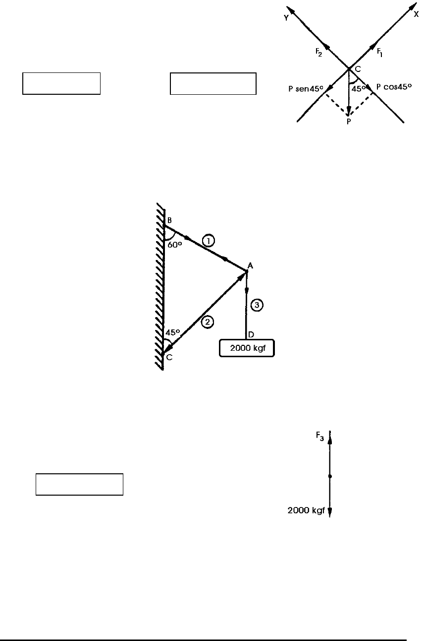 SENAI/SC Resistência dos Materiais 15 Novamente como no exemplo anterior, o nó C é o mais conveniente. Porém, neste exemplo, temos a oportunidade de apresentar mais um artifício, que poderá ser utilizado sempre que for necessário. Este artifício (mudança de plano) torna-se conviniente, sempre que duas ou mais forças estiverem colineares ou defasadas 90º. Os cabos 1, 2, 3 estão tracionados, portanto teremos o nó C com o sistema de forças a seguir. Exemplo 1 Uma carga de 2000 kgf está suspensa conforme mostra 1, 2 e 3 a figura ao lado. Determinar as forças normais atuantes nas barras Solução: Iniciamos os cálculos pelo nó D. A carga de 2000 kgf traciona a barra 3, portanto teremos o sistema de forças abaixo. ΣFy = 0 F3 = 2000kgf ΣFy = 0 F2 = P cos45° F2= 0,707 ΣFx = 0 F1= P sen F1 = 0,707 P