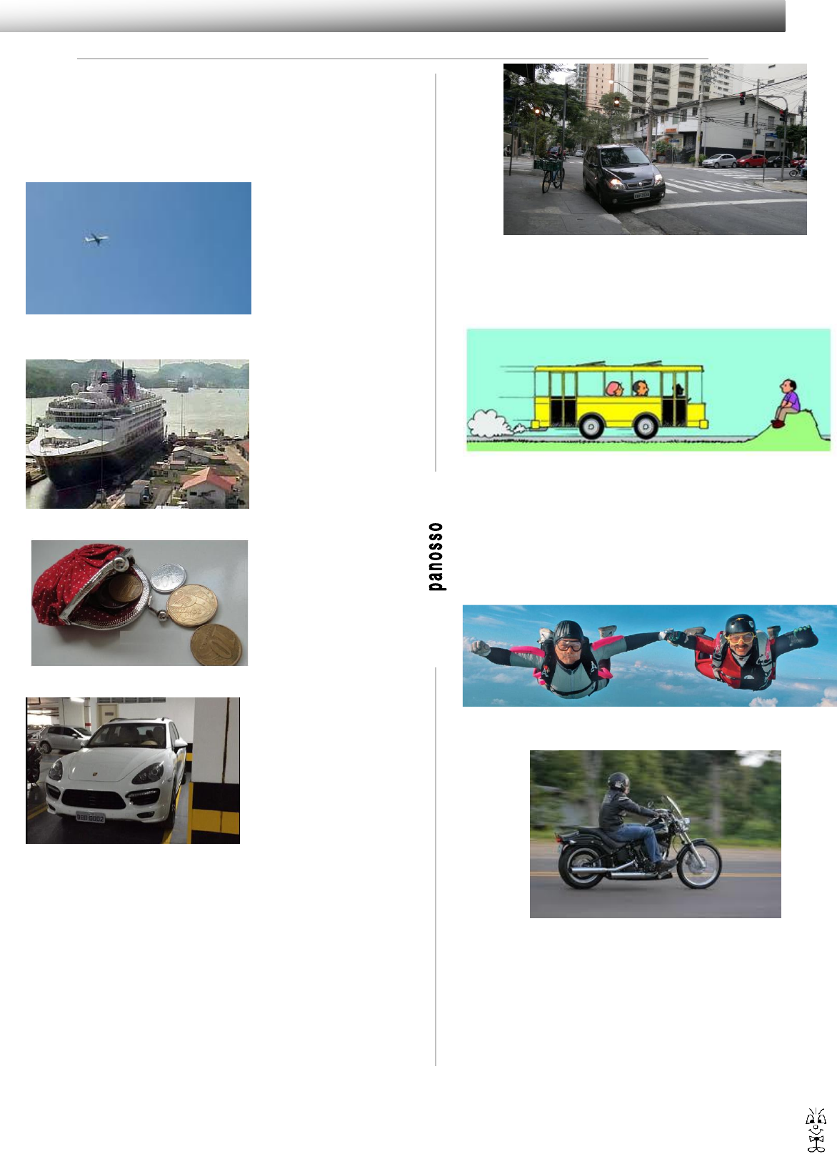 Introdução à Cinemática – 9º ano (E.F.II) 1 Exercícios de Física Instruções: Para a realização dessa tarefa, são necessárias respostas completas e detalhadas. Havendo necessidade de cálculo, todas as contas devem estar indicadas na resolução. 1) Observe cada uma das imagens abaixo, faça a classificação em relação ao tipo de corpo (ponto material e corpo extenso), descrevendo o referencial adotado para a classificação. a) b) c) d) 2) Retomando as imagens do exercício 1, escolha um referencial para o qual a classificação do corpo será contrária a feita incialmente, escrevendo uma frase. 3) um menino está andando de bicicleta em um parque público, como a bicicleta pode ser classificada, ponto material ou corpo extenso? Justifique sua resposta. 4) Observe a imagem a seguir, ela retrata uma cena comum em uma cidade. Um carro estacionado em uma rua movimentada. a) O que é necessário para descrever sua posição? b) Faça uma descrição da sua posição. c) Existe outra descrição possível? Explique. 5) Heloísa, sentada na poltrona de um ônibus, afirma que o passageiro sentado à sua frente não se move, ou seja, está em repouso. Ao mesmo tempo, Abelardo, sentado à margem da rodovia, vê o ônibus passar e afirma que o referido passageiro está em movimento. a) De acordo com os conceitos de movimento e repouso usados em Mecânica, explique de que maneira devemos interpretar as afirmações de Heloísa e Abelardo para dizer que ambas estão corretas. b) O ônibus está em repouso ou movimento? Explique sua resposta. 6) Dois paraquedistas foram fotografados durante um salto. Classifique o fotografo em relação aos paraquedistas. Justifique a sua resposta. 7) O motoqueiro da figura a seguir está em repouso ou em movimento? Explique. 8) Dizemos que os conceitos de movimento e repouso relativos, pois dependem do sistema de referido. Com base nisso é correto afirmar que: I – um corpo parado em relação a um referencial pode estar em movimento em relação a outro referencial. II – um livro colocado sobre uma mesa está em repouso absoluto, pois, para qualquer referencial adotado, sua posição não varia com o tempo. III – em relação a um edifício, o elevador estacionado no terceiro andar está em repouso. Porém, em relação ao Sol, o mesmo elevador encontra-se em movimento. http://www.professorpanosso.com.br/ Introdução à Cinemática – 9º ano (E.F.II) 2 Exercícios de Física a) somente a I está correta b) somente a II está correta c) somente a III está correta d) somente a I e III estão corretas e) somente a II e III estão corretas 9) Leia com atenção a tira da Turma da Mônica mostrada abaixo e analise as afirmativas que se seguem, considerando os princípios da Mecânica Clássica. I. Cascão encontra-se em movimento em relação ao skate e também em relação ao amigo Cebolinha. II. Cascão encontra-se em repouso em relação ao skate, mas em movimento em relação ao amigo Cebolinha. III. Em relação a um referencial fixo fora da Terra, Cascão jamais pode estar em repouso. Estão corretas a) apenas I b) I e II c) I e III d) II e III e) I, II e III 10) De acordo com as afirmativas abaixo, coloque V para a verdadeira e F para a Falsa e assinale a proposição correta: I) ( ) A Terra não é um corpo em repouso. II) ( ) Uma pulga é um ponto material em relação a uma casa III) ( ) Uma pulga é um corpo extenso em relação a um piolho. IV)( ) Os conceitos de repouso e movimento dependem do referencial adotado. V) ( ) Um corpo pode estar em movimento em relação a um referencial e em repouso em relação a outro. 11) A respeito dos conceitos de movimento e repouso a alternativa FALSA é: a) O Sol está em movimento em relação à Terra. b) É possível que um móvel esteja em movimento em relação a um referencial e em repouso em relação a outro referencial c) Se um móvel está em movimento em relação a um sistema de referência, então ele estará em movimento em relação a qualquer outro referencial. d) Se um corpo A está em repouso em relação a outro B, então o corpo B estará em repouso em relação a A. e) É possível um corpo A está em movimento em relação a outros dois corpos B e C e termos o corpo B em repouso em relação a C. 12) – Analise as proposições abaixo e marque cada uma delas com V (verdadeiro) ou F (falso): ( ) O estudo da trajetória de uma partícula independe do referencial adotado. ( ) Uma partícula que está em movimento em relação a um referencial pode estar em repouso em relação a outro. ( ) Se dois móveis se deslocam por uma estrada retilínea com velocidades constantes e iguais, e no mesmo sentido, um está em repouso em relação ao outro. A sequência correta obtida é: a) F – V – F b) F – F – V c) V – F – V d) V – V – F e) F – V – V 13) – Um avião voando em linha reta, com velocidade constante em relação ao solo, abandona uma bomba. Se a resistência do ar sobre ela puder ser desprezada, a trajetória dessa bomba será em forma de uma: a) Parábola para um observador que estiver no avião; b) Linha reta vertical para um observador que estiver na Terra; c) Linha reta horizontal para um observador que estiver no avião; d) Linha reta vertical para um observador que estiver no avião; e) Mesma figura para qualquer observador, pois independe do referencial. 14) Júlia está andando de bicicleta, com velocidade constante, quando deixa cair uma moeda. Tomás está parado na rua e vê a moeda cair. Considere desprezível a resistência do ar. Assinale a alternativa em que melhor estão representadas as trajetórias da moeda, como observadas por Júlia e por Tomás: 15) Um trem se move com velocidade horizontal constante. Dentro dele estão o observador A e um garoto, ambos parados em relação ao trem. Na estação, sobre a plataforma, está o observador B parado em relação a ela. Quando o trem passa pela plataforma, o garoto joga uma bola vertical