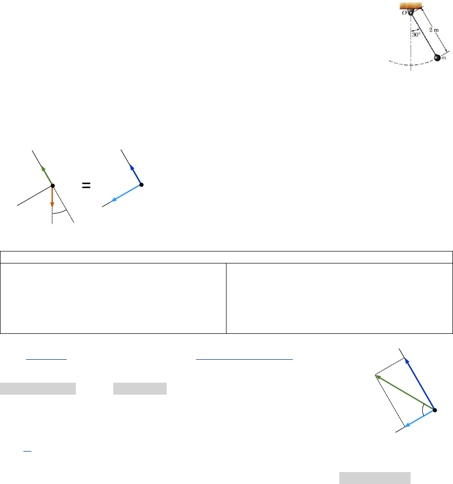 Prof.: Carlos Arthur Cavalcante 120 3.5.10 Exemplo-Ilustrativo 30 Problema-Resolvido 12.4 (Beer, Johnston; 9ª Edição, pág. 706) A extremidade de um pêndulo de 2 𝑚𝑒𝑡𝑟𝑜𝑠 descreve um arco de circunferência em um plano vertical. Se a tração na corda é 2,5 vezes o peso do pêndulo para a posição mostrada na figura, encontre a velocidade e a aceleração do pêndulo nessa posição. SOLUÇÃO: Trata-se de um movimento oscilatório harmônico simples (MHS), e a questão é determinar a velocidade e a aceleração do pêndulo para posição mostrada. Neste caso, escolhemos expressar as equações de movimento em termos de suas componentes tangencial e normal, conforme indicado no DCL. Não conhecemos a direção da aceleração resultante, mas podemos expressá-la em termos de suas componentes tangencial 𝑎𝑡 e normal 𝑎𝑛. Notar que assumimos que o pêndulo está “voltando” de uma posição mais alta, conforme o sentido positivo assumido para a direção tangencial no instante mostrado. Notar também que não foi indicado um sistema de coordenadas para descrever a posição do pêndulo, uma vez que o interesse é apenas na velocidade e na aceleração. Equações de Movimento (para a posição mostrada) +↙ ∑𝐹𝑡 = 𝑚𝑎𝑡 𝑚𝑔 sin 30° = 𝑚𝑎𝑡 𝑎𝑡 = 𝑔 sin 30° 𝑎𝑡 = 9,81(0,5) 𝑎𝑡 = 4,9050 𝑚/𝑠2 +↖ ∑𝐹𝑛 = 𝑚𝑎𝑛 𝑇 − 𝑚𝑔 cos 30° = 𝑚𝑎𝑛 2,5𝑚𝑔 −𝑚𝑔 cos 30° = 𝑚𝑎𝑛 𝑎𝑛 = 9,81(2,5 − cos 30°) 𝑎𝑛 = 16,029 𝑚/𝑠2 𝑎 = √𝑎𝑡 2 + 𝑎𝑛 2 𝑎 = √(4,9050)2 + (16,029)2 𝑎 = 16,764 𝑚 𝑠2⁄ 𝜑 = 72,986° Determinação da velocidade para a posição mostrada. 𝑎𝑛 = 𝑣2 𝜌 𝑣2 = 𝜌𝑎𝑛 𝑣2 = (2)(16,029) 𝑣2 = 32,059 𝑣 = 5,6620 𝑚/𝑠 DCL do Pêndulo 𝑡 30° �⃗⃗⃗⃗� �⃗⃗� 𝑚�⃗�𝑛 𝑛 𝑡 𝑛 𝑚�⃗�𝑡 𝜑 �⃗�𝑛 𝑡 𝑛 �⃗�𝑡