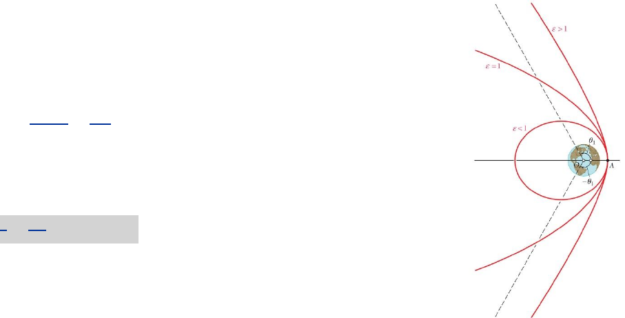 Prof.: Carlos Arthur Cavalcante 228 A equação Eq. 13 é a equação de uma seção cônica (elipse, parábola ou hipérbole) em coordenadas polares 𝑟 e 𝜃. A origem 𝑂 do sistema de coordenadas polares (centro do planeta) é um foco dessa seção cônica e o eixo polar um dos seus eixos de simetria. A razão entre a constante 𝐶 e a constante 𝐺𝑀 h2⁄ é definida como a excentricidade 𝜀 da seção cônica. 𝜖 = 𝐶 𝐺𝑀 ℎ2⁄ = 𝐶ℎ2 𝐺𝑀 Assim, podemos utilizar também uma equação alternativa à equação Eq. 13, equação esta que é dada por, 1 𝑟 = 𝐺𝑀 ℎ2 (1 + 𝜀 cos 𝜃) Eq. 14 De acordo com o valor de 𝜖 (que por sua vez depende das condições iniciais), a equação Eq. 14 representa quatro trajetórias possíveis: 1) Hipérbole. Quando 𝜖 > 1 ou 𝐶 > 𝐺𝑀 ℎ2⁄ . Existirão dois valores para ângulo polar 𝜃, identificados por 𝜃1 e por −𝜃1, para os quais o lado direito da equação Eq. 14 se torna zero e, consequentemente, o raio vetor 𝑟 se torna infinito. O valor de 𝜃1 é definido por cos 𝜃1 = 𝐺𝑀 𝐶ℎ2⁄ . 2) Parábola. Quando 𝜖 = 1 ou 𝐶 = 𝐺𝑀 ℎ2⁄ . Existirá um único valor para ângulo polar 𝜃 para o qual o lado direito da equação Eq. 14 se torna zero e, consequentemente, o raio vetor 𝑟 se torna infinito. O raio vetor 𝑟 se torna infinito para 𝜃 = 180°. 3) Elipse. Quando 𝜖 < 1 ou 𝐶 < 𝐺𝑀 ℎ2⁄ . O raio vetor 𝑟 permanece finito para todo valor de 𝜃. 4) Círculo. Quando 𝜖 = 0 ou 𝐶 = 0. É um caso particular da elipse. O raio vetor 𝑟 permanece finito, porém constante, para todo valor de 𝜃.