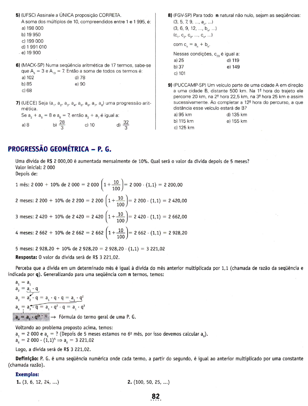 5) (UFSC) Assinale a ÚNICA proposição CORRETA. A soma dos múltiplos de 10, compreendidos entre 1 e 1 995, é: a) 198000 b) 19950 c) 199000 d) 1 991 010 .e)19900 6) (MACK-SP) Numa seqüência aritmética de 17 termos, sabe-se que A5 = 3 e A'3 = 7 Então a soma de todos os termos é: a) 102 d)78 b)85 e)90 c) 68 7) (UECE) Seja (a" a2, a3, a4, a5, a6 , a7, as) uma progressão arit- mética. Se a2 + a5 = 8 e as = 7. então a3+ a7 é igual a: a) 8 b) 28 c) 10 d) 32 3 3 PROGRESSÃO GEOMÉTRICA - P. G. 8) (FGV-SP) Para todo n natural não nulo, sejam as seqüências: (3, 5, 7. 9, ..., a n , ... ) (3, 6, 9, 12, ..., bn, ... ) (c" c2' c3' ..., c., ...) Nessas condições, c20 é igual a: a)25 d) 119 b)37 e) 149 c) 101 9) (PUCCAMP-SP) Um veículo parte de uma cidade A em direção a uma cidade B, distante 500 km. Na 1!! hora do trajeto ele percorre 20 km, na 2!! hora 22,5 km, na 3!! hora 25 km e assim sucessivamente. Ao completar a 12!! hora do percurso, a que distãncia esse veículo estará de B? a) 95 km d) 135 km b)115km e)155km c) 125 km Uma dívida de R$ 2 000,00 é aumentada mensalmente de 10%. Qual será o valor da dívida depois de 5 meses? Valor inicial: 2 000 Depois de: 1 mês: 2000 + 10% de 2000 = 2000 (1 +~)= 2000· (1,1) = 2200,00 100 2 meses: 2200 + 10% de 2 200 = 2200 (1 +~)= 2200· (1,1) = 2420,00 100 3 meses: 2420 + 10% de 2420 = 2420 (1 +~)= 2420· (1,1) = 2662,00 100 4 meses: 2662 + 10% de 2662 = 2662 (1 +~)= 2662· (1,1) = 2928,20 100 5 meses: 2928,20 + 10% de 2928,20 = 2928,20· (1,1) = 3221,02 Resposta: O valor da dívida será de R$ 3 221,02. Perceba que a dívida em um determinado mês é igual à dívida do mês anterior multiplicada por 1,1 (chamada de razão da seqüência e indicada por q). Generalizando para uma seqüência com n termos, temos: aI = aI a = a . q 2 ~ '"a = a . q = a . q . q = a . q2 3 2 1 ~ a =a~q=a .q2.q=a .q3 4. 3 1 1 Voltando ao problema proposto acima, temos: aI = 2000 e a6 = ? (Depois de 5 meses estamos no 62 mês, por isso devemos calcular a6). a6 = 2000· (1,1)5 ~ a6 = 3221,02 Logo, a dívida será de R$ 3 221,02. Definição: P. G. é uma seqüência numérica onde cada termo, a partir do segundo, é igual ao anterior multiplicado por uma constante (chamada razão). Exemplos: 1. (3, 6, 12, 24, ... ) 2. (100, 50, 25, ... ) 82 EXERCíCIOS . 30. Das seqüências seguintes, assinale as três que são P.G.: a) (3, 5, 7. ...) d) (2,4, 16, ...) g) (2, -2,2, ...) b) (3, 6, 12, ) e) (30, 20, 10, ...) h) (2, 8, 4, ) c) (5, 10, 15, ) f) (1, 5, 25, ...) i) (1, 2, 3, ) 31. Determine a razão q em cada uma das progressões geométricas: a) (5, 10, 20, ) b)(1, -3, 9, ) c) (-8, 16, -32, ...) d) (20, 10, 5, ...) e) (5,5,5, ...) ( 15 45 ) f) 5'2'4' ... 32.Determine os três primeiros termos de uma P.G. de razão -3 e primeiro termo igual a 5. 33.Calcule os três primeiros termos de uma P. G. de razão -1 e 7primeiro termo igual a 2. 34.Dada a P.G. (a" a2,a3,a, ...)assinale as duas afirmações corretas: ~ +ac) a 2 = _"4 __ 3 2 Sugestão: monte uma P.G. com números. 35.(FAM) Sabendo que x, x + 9, x + 45 estão em P.G. determinar o valor de x. 36.Assinale as duas falsas: 1a) Na P.G. (3, x, 12). x = 6. e) Na P.G. (20, -10,5). q="2 . b) a2 = a, . q f) a7 = a,; q6 c) as = a4 • q g) as = a7 • q d) a = a . q3 h) a22= a . a3 , , 3 37. Sendo y o 2~ termo de uma P.G. de razão q, represente os três primeiros termos usando y e q. 38. Usando a fórmula an = a, . qn-', encontre a expressão do termo genérico da P.G. (3, 6, 12,24, ...). 39. Determine a expressão do termo genérico da P.G. (1, 3, 9, 27. ...) 40. Dada a P.G. (1, 2,4, ...), calcule o décimo termo. 41. Qual é o 5º termo da P.G. (243, 81, 27. ...)7 42. Qual é o 1º termo da P.G. onde o último é a7 = 16 e a razão é q = 27 43. Calcule o primeiro e o quarto termos de uma P.G. onde a8 = 2~ 1 eq="3' 44. Quantos termos possui a P.G. onde a, = 6, an = 384 e q = 27 45. (MACK-SP) Se o oitavo termo de uma progressão geométrica é ~ e a razão é ~, o primeiro termo dessa progressão é: a) 2-1 b) 2 c) 26 d) 28 e) ff 46. (MACK-SP) O número de termos da progressão (1, 3, 9, ...) com- preendidos entre 100 e 1 000 é: a)2 d)8 b) 4 e) maior que 8 c)6 83 47. Determine a razão q numa P. G. de seis termos onde o último termo vale 972 e o primeiro 4. 48. Interpole 4 meios geométricos entre 486 e 2. 49. O terceiro termo de uma P.G. é 2 e o sétimo é 512. Calcule o nono termo. 50. Se x - 2, x + 1 e x + 13 são termos consecutivos de uma P.G., determine esses termos e calcule a soma dos seis primeiros ter- a ·q-a mos dessa P G. Dado: S = n , (soma dos n primeiros n q-1 termos de uma P G.). 51. Calcule a soma dos 10 primeiros termos da P G. (5, 10, 20, ...). 52. Numa P G., a, = -i e q = 1. Calcule a soma dos 40 primeiros termos dessa P G. Dado: Sn = n· a, (pois q = 1) 53. Calcule a soma dos termos da P G. infinita (1. ~, ~, .. .)- a Dado: S = -1-'- (pois Iql < 1) ~ soma dos infinitos termos de n _q uma P G. 54. (FEI-SP) Dada a progressão geométrica 1, 3, 9, 27. ... se a sua soma é 3 280, então ela apresenta: a) 9 termos. b) 8 termos. c) 7 termos. d) 6 termos. e) 5 termos. 55. Calcular o produto dos 7 primeiros termos da progressão geomé- nln-1) trica (2, 6, 18, ...). Dado: Pn= a~.q-2-( produto dos n primeiros termos de uma P G.). 56. Numa P G., a, = 10 e q=i. Calcule o produto dos 15 primeiros termos dessa P G. 57. Assinale a alternativa correta: 1) (PUC-SP) O terceiro e o sétimo termos de uma progressão geométrica valem, respetivamente, 10 e 18. O quinto termo dessa progressão é: a) 14 b).J30 c) 2.fi d) 6..J5 e) 30 84