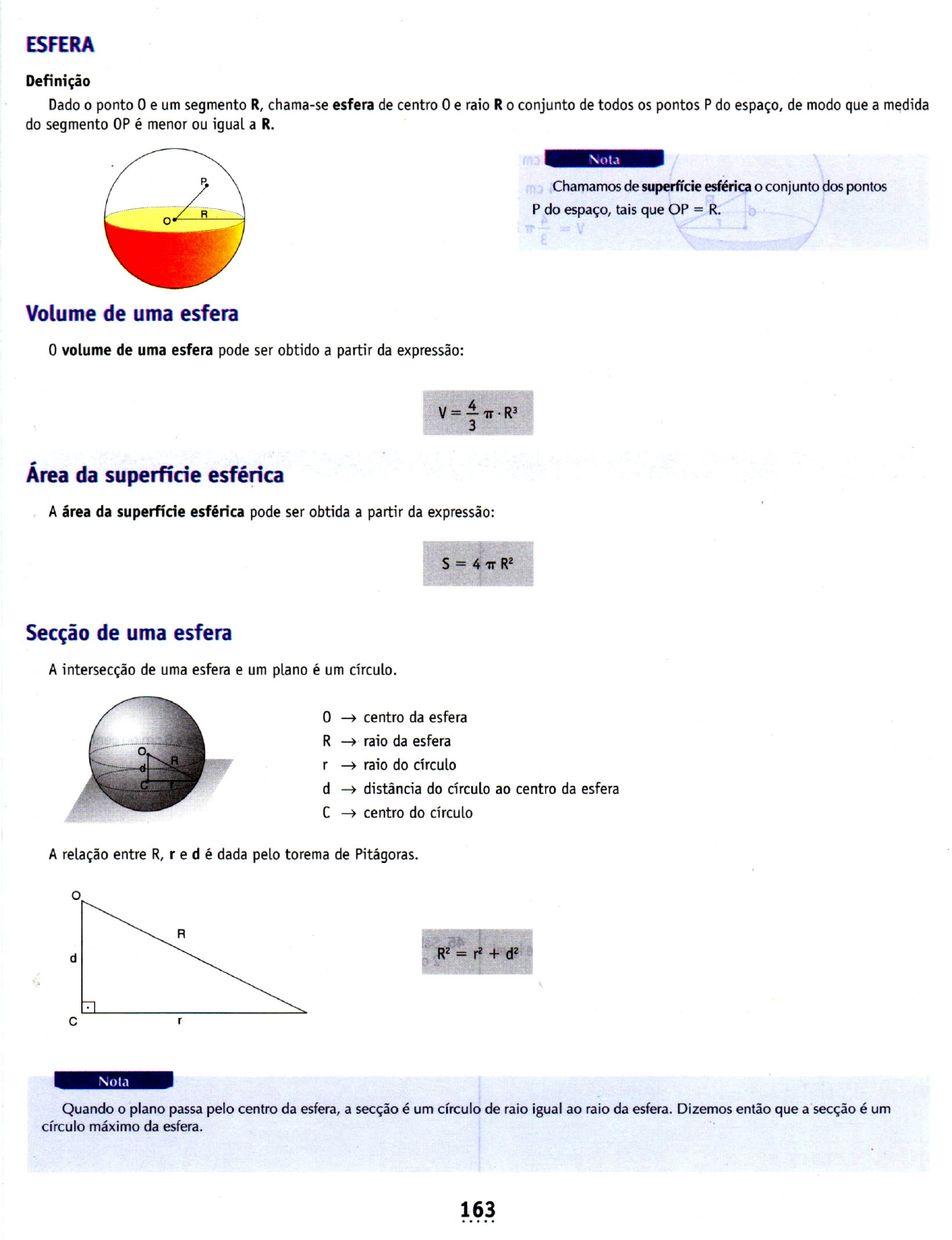 ESFERA Definição Dado o ponto a e um segmento R, chama-se esfera de centro a e raio R o conjunto de todos os pontos P do espaço, de modo que a medida do segmento ap é menor ou igual a R. Chamamos de superfície esférica o conjunto dos pontos P do espaço, tais que OP = R. Volume de uma esfera a volume de uma esfera pode ser obtido a partir da expressão: Área da superfide esférica A área da superficie esférica pode ser obtida a partir da expressão: S = 411" RZ Secção de uma esfera A intersecção de uma esfera e um plano é um círculo. a ~ centro da esfera R ~. raio da esfera r ~ raio do círculo d ~ distância do círculo ao centro da esfera C ~ centro do círculo A relação entre R, r e d é dada pelo torema de Pitágoras. o R d " c Quando o plano passa pelo centro da esfera, a secção é um círculo de raio igual ao raio da esfera. Dizemos então que asecção é um círculo máximo da esfera. 163 Exemplos: 1. Uma secção plana feita a 3 cm do centro de uma esfera tem área igual a 16'TTem'. Calcule o volume da esfera e a área da superfície esférica. S . = 'TTr2 ~ 16'TT= 'TTr2~ r2 = 16 ~ r = 4 émCirculo d = 3 cm} R2= r2+ d2 r = 4 cm => R2= 42 + 32~ R = 5 cm v = ~ 'TTR3 ~ V = ~. 'TT'53 ~ V = 500 'TTcm3 333 S = 4'TTR2~ S = 4 . 'TT. 52 ~ S = 100'TT crn' 2. Calcule o volume e a superfície de uma esfera cujo círculo máximo tem área igual a 100'TT crn-. Seirculo = 'TTr2~ 100'TT = 'TTr2~ r2 = 100 ~ r = 10 cm O raio do círculo máximo é igual ao raio da esfera (r = R). V = ~ 'TTR3 ~ V = ~. 'TT.103 ~ V = 4000 'TTem' 333 S = 4'TTR2 ~ S = 4 . 'TT. 102 ~ S = 400'TT em' EXERCíCIOS 40. Calcule o volume e a superfície de uma esfera de raio igual a 2cm. 41. A área de uma superfície esférica mede 144'IT em". Determine o volume dessa esfera. 42. Determine a área da superfície de uma esfera cujo volume é igual a 36'IT crn-. 43. A área do círculo máximo de uma esfera é igual a 25'IT em". Deter- mine o volume dessa esfera. 44. Calcule a área de uma secção plana feita a 8 cm do centro de uma esfera de raio 10 cm. 45. Sabendo-se que o raio de um círculo de uma secção plana feita a 2 cm do centro de uma esfera é igual a 4 cm, determine o diâme- tro da esfera. 164 46. A área de uma secção plana feita a 5 m do centro de uma esfera é igual a 144'ITm2• Calcule a área da superfície dessa esfera. 47. Assinale a altemativa correta: 1) (UECE) Um prisma reto tem por base um triângulo retângulo cujos catetos medem 3 m e 4 m. Se a altura deste prisma é igual à hipotenusa do triângulo da base, então seu volume, em m3, é igual a: a)60 b)30 c) 24 d) 12 2) (FEI-SP) De uma viga de madeira de secção quadrada de lado e = 10 cm, extrai-se uma cunha de altura h = 15 cm, conforme a figura. O volume da cunha é: a) 250 em? c) 750 em- e) 1250 em" b) 500 em- d) 1000 em- 254 3) (ITA-SP) Dado um prisma hexagonal regular, sabe-se que sua altu- ra mede 3 cm e que sua área lateral é o dobro da área de sua base. O volume deste prisma, em em". é: a) 27./3 c) 12 e) 17.J5 b)13.J2 d)54./3 4) (VUNESP) Uma piscina retangular de 10,0 m x 15,0 m e fundo horizontal está com água até a altura de 1,5 m. Um produto quími- co em pó deve ser misturado à água à razão de um pacote para cada 4500 litros. O número de pacotes a serem usados é: a) 45 c) 55 e) 75 b)50 d)60 5) (FUVEST-SP) O volume de um paralelepípedo reto-retângulo é de 240 em". As áreas de duas de suas faces são 30 em- e 48 crn-. A área total do parelelepípedo, em crn-. é: a) 96 c) 236 e) 472 ~~ b)118 d)240 6) (UNIRIO-RJ) 258 Na fabricação da peça acima, feita de um único material que cus- ta R$ 5,00 o cm-, deve-se gastar a quantia de: a) R$ 400,00 c) R$ 360,00 e) R$ 320,00 b) R$ 380,00 d) R$ 340,00 7) (PUC-MG) Na maquete de uma casa, feita na escala 1:500, uma sala tem 8 mm de largura, 10 mm de comprimento e 8 mm de altura. A capacidade, em litros, dessa sala é: a) 640 c) 800 e) 80000 b) 6400 d) 8000 8) (FATEC-SP) A diagonal da base de um paralelepípedo reto-retân- gulo mede 8 cm e forma um ângulo de 60° com o lado menor da base. Se o volume deste paralelepípedo é 144 crn-, então a sua altura mede, em centímetros: a) 5./3 b) 4./3 c) 3./3 d) 2./3 e) ./3 260 9) (VUNESP) A área da superfície daTerra é estimada em 510000000 km2 Por outro lado, estima-se que se todo vapor de água da at- mosfera terrestre fosse condensado, o volume de líquido resul- tante seriade 13000 krn''. Imaginando que toda essa água fosse colocada no interior de um paralelepípedo retângulo, cuja área da base fosse a mesma da superfície da Terra, a medida que mais se aproxima da altura que o níyel da água alcançaria é: a) 2,54 mm c) 25,4 cm e) 0,254 km b) 2,54 cm d) 2,54 m 10) (UFMG) A base de uma caixa retangular tem dimensões 2cm e 3 cm. Colocam-se 21,6 gramas de um certo líquido nessa caixa. Se cada 0,9 grama desse líquido ocupa 1 em", o nível do líquido na caixa é: a) 3,5 cm b)4cm c) 4,5 cm d) 5 em 11) (PUCCAMP-SP) Deseja-se construir um recipiente fechado com volume de 0,5 rn", Seu formato deverá ser o de um paralelepípe- do retângulo, com altura de y metros e base quadrada de aresta x metros. O material para a confecção das faces laterais custa R$ 1,50 o metro quadrado e o material para a tampa e a base custa R$ 2,50 o metro quadrado. Se P é o custo de todo o mate- rial usado, em reais, deve-se ter: a) P = 3x2 + 5/x c) P = 5x2 + 3x e) P = 8x2 b) P = 5x2 + 3/x d) P = 3x2 + 5x 12) (PUCCAMP-SP) Um bloco maciço de ferro tem a forma de um paralelepípedo retângulo com dimensões de 15 cm de compri- mento, 7,5 cm de largura e 4 cm de altura. Quantos gramas tem esse bloco, se a densidade do ferro é 7,8 g/cm3? a) 35,1 c) 351 e) 3510 b)234 d)2340 13) (ITA-SP)As dimensões x, y, z de um paralelepípedo retângulo es- tão em progressão aritmética. Sabendo que a soma dessas medi- das é igual a 33 cm e que a área total do paralelepípedo é igual a 694 crn-, então o volume deste paralelepípedo, em 