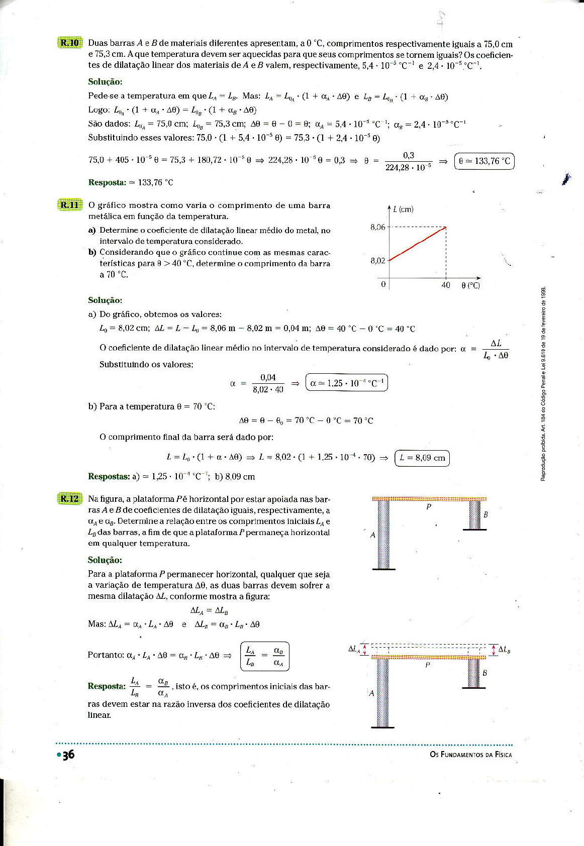 iEfÊ Duas ba..as ,a e B de materiais diÍerentes apresentam, a 0 "C, comprimentos respecuvamente ìsuais a 7b,0 cm e 75,3 cm.Áque tempeÍâtüra deven ser aquecidas pa.aqueseus cohprimenros se romem iguais? Os coeficien- tes de dilatãção lineâr dos materiais de,4 e B valem, .espectivamenre, 5,4. 10 5 "C ' e 2,4. l0 I .C ' Soluçáo: Pedese a Ìemperatufa em que Ij : ,,. Mãs: 4 = 4i (1 + q . 40) e L, = lar . (1 + ds . ^0)Logo: ZL,À. (1 + úì .^0) = I," (1 + o, ^0) Ì i o, : 2,4 10 ; 'c 'São dados: , i : 75,0 cmi 4s:75,3cmt ^€=€ 0 = 0i c! = 5,4.10 5 'C Subst i tu indo esses vaìores: 75,0 (1+5,4 10s0)=75,3.(1 + 2,4. t0 5 O) 75,0 + 405.10 sO = 75,3 + 180,72.10 'O .e 224.28.10 5 0:0,3 + 0= Respostâ: - 133,76'C ffF O sráÍico mosÌra como vãriã o comprimento de ümã bârrâ metálica em tunção da temperatura. â) Dete.nine o coeficìente de dilaiãção ìinear nédio do netal no intervãlo de teúpe.atura considerado. b) Considerddo que o gráfrco coniìnue com as mesmas carac- terísticas parâ I > 40 "C, deternineo conprimento da barra a70'c. Soluçáo: r.=r0 (1 + d.ao) ì r. = 8,02. O + 1,25.10 .. zol = Flsj]e.;] ffi .36 a) Do gránco, obtenos G vaÌores: Lr= I ,02.út AL : L - L\ t : 8,06 m - 8,02 m : 0,04 m; ^0 = 40'C 0"C=40'C O.oeic 'enrêdêdi lâ lãcdol inearmÁdiunornÌervdlodÊlÊmpqdturdconsidüJdôêdãdopor: o = ( l= 1,25 10 ""C ' ^0:0 €o:70.c 0.c:70.c Ocomprineúto final da barÌa será dado por: zu,za. ro.L ' ao- tilJce 4, ^o Í AL i Substituindo os valoÍes: 0.04 8,02 . 40 b) Pâraatemperâtürã 0 = 70'C: ResÌoÊlâÉ: ã) = 1,25. 10 'C 't b) 8,09 cm Na figura, a platalornã P é horizontal por estâí apoiâda nâs bar- .ãs Á eAde coencientes de dilataçâo iguals, .àspectivaúente, a crr e (l,, Determine a relaçào entre os comprimentos iniciais l,r e ,, das barrõ, a frm de que a plãtalorma P perúãneça horizontal em qualquer temperatura. SoÌuçio: Pa"â â pi lãÍurnd P permanF.êr hor izonral . quãlquFr quê rêjd ã veiãçãô de têmperatura Á0, as duas barrõ devem solrer ã mesmã dilâtâção ^l,. conloÌme mostra a ngura: Mr=Âta Mas: Âl,r = dr .Ij . ^0 e ^I, = ir,. r, Ae Portâôtor 0r.Lj .^O : oÁ.r, o, = [ t= t r , nop""tu, 1 94. i,roa. o".o.p"rentos i.ic,ã,s dâs bar-.LB Es devem estãÍ nê râzão inversados coeficìentes de dilataçâô Os FuNoÁMrNÌos DÁ Fk.Á *xgïíüffi8 '".Ug I Uma bara de ouÍo tem ê 0 C ̂ Lomprimentode i00cm. Determine o.omprimento da bârra quãndo suâ t€m perarurà passa a ser 50 c o côêfrcjênte de dilatâção ìineaÌ médio do ou.o para o inteNaìo de temperãtura considerâdovale 15. 10 "C . i$,;!ljii aom o auiìio de ufta badâ de ferro querse determinar a temperatura de ún Iorno. Paratâ|, à bãrà, inicl;l mente a 20 "C, é introduzida no forno. Veriflca-se que, após o equilibrio térmico, o alongmento da bara é um centésimo do comprimento inicial. Sendo 12 . l0 i C o coeficiente de dilatação lineü medio do ferrc, determine â temperaturâ do iomo. Duas baüâs, unâ de colr-e e outra de_lg!Ão, têm o mesmo comprimento d l0 oC e, â I10 C. os-seus com- pdmentos dilereú el1 mm. Os coencientes de dilâtação linear são: parâ o cobrè : 16 10 6 "C lì para o latáo = 20. l0 "'C '. Determine o comDdmento, a Ì0 'C, de cada bârâ. !:#-.,U#i OFBA) Duãs lâninas, umã de aço e outra de bfonze, têm comprimentos de 20 cm a uma temperatura de Ì5 'C. Sabendo que os coencientes de diÌatação lineâr vâlem, respectivamente! 12.10 6"C Ì e 18.10 6'C Ì, câlcüle â diferençâ de comprimento quando âs Eminâs atingem uma temperatura de 5 'C. t - ,.È:Àii,: Ë l:Pil7':l 0 ë .:iìriiii'i Nâfigufaestá representado o gráfico do compíimentoZ de duâs barrâs, á e a, eÒ lünção dã temperatura. Sejam respectivamente ür e or os coeficientes de dilatação ììnear do materialdas bârras Á e B. Determine: a) ôs vâìores dos coencientes ür e ix,l b) ãtemperatura em que a dilefençã entre os conprimenlos das dua beÍãs Nanguradada, a plêtaroÍna P é horizontal porestar apoiadâ nas coìunâs Á (de aìuminio) e B (de fe.rc). O desniveÌ entre os apoios é de 30 cm. CaÌcule quais devem ser os comprimentos das barÍas a 0 "C para que a plataio.fta P permâneça horizontal em qualque. tempe.atura. Sáo dados os coe6cientes de dilatação ìinear do alumítio (2,4 10 s "C Ì) e do lerro (1,2. l0 " 'C ' ) . (UFRJ) Duâs bârras metáÌicâs sáo tais que a difereúça entre seus comprimentos, em qualquer tempeÍaturã, é iguâl â3 cm. Sendo os coencientes de di latação l ineú médios 15 10 6"Cre20.10 6 "C ì , dete,mine os conpriúentos das bãrrâs a0 "C. dia-a-dia Ouando ocorre um impedinrento à ivre diataÇão ou contÍação de um coÍpo, suígem foÍças nternas de tensão que podem levá-lo a se fompeÍ ou ê se deïotmar. Por sso, há muitâs situêções do cotid ano em que a di lataçáo {ou a aonlraçáo) télmicâ é "fêc l Ìadê" paÉ ev taÍ pÍob ernâs desse t po. Nas feÍrovlas, as baÍas de tr i lho devem ser assentadas com um espaço entre e as, paÍa pe|m t Í a ivÍe d latêção quando a tempeÍatuÍa vara. Se isso não fosse Íe to, os tr ihos poderiam se enÌoÍtar, devdo à tensão a que f lcar lam submet dos E-r po,ì ies. . ddLÌos e ordr dêc.onc -Lroes. en_oregè'Í cF âc chamadas iuntas de di latação (Íoto 1). E as ev tam que var aÇôes dês d mensões devidas a mudanÇas de tempeíêtura venham a danfcar ê estrutuÍa do concÍeto. Às vezes, a junta de diataçáo cons ste ern role Ìes sobre os quals a esÌÍutura pode des izêr, compensando os eíeitos da diataçáo. r00 0 fc) Capiruol . D uÌaçÀo ÌtRMrÁ DE 5óLoos E Lrqu Dos t7. Nos ca çamentos, separam-se as p âcas de c Tr]ento por ripês de madeira ou varas de plást co líoto 2), que "absoívern'eventuais d ataÇoes das pacas, mped ndo que e as se Íachem Os Íios insta ados entre os postes nas ruas, ou entre as Ìorres dâs nhas de alla tensáo não sáo e