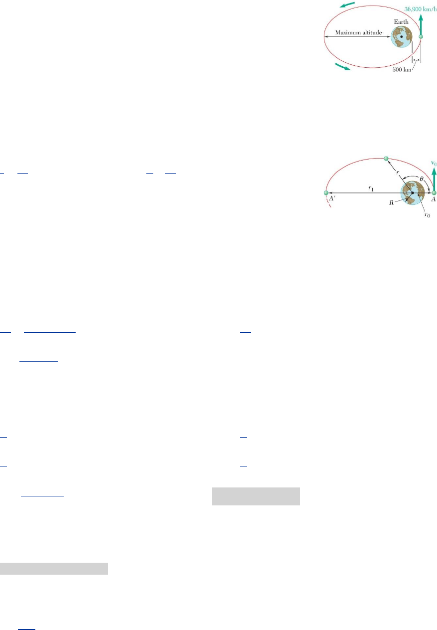 Prof.: Carlos Arthur Cavalcante 235 A.3.4.1. Exemplo Ilustrativo B-02 Problema-Resolvido 12.8 (Beer, Johnston; 9ª Edição) Um satélite é lançado em uma direção paralela à superfície da Terra com uma velocidade de 36.900 𝑘𝑚/ℎ e a uma altitude de 500 𝑘𝑚. Determinar: (a) a altitude máxima atingida pelo satélite, e, (b) o período do satélite. SOLUÇÃO: Imediatamente após o lançamento o satélite inicia voo livre e está sujeito apenas à atração gravitacional da Terra, caracterizando o movimento de uma partícula sob a ação de uma força central gravitacional. Adotamos o eixo polar tal que 𝑟 = 𝑟0 para 𝜃 = 0 e constatamos que a velocidade inicial é paralela à superfície da Terra (𝜙0 = 90° de modo que 𝑣0 é perpendicular ao eixo polar). A trajetória do satélite é uma trajetória elíptica – não há necessidade de comparar o valor de 𝑣0 com o valor de 𝑣escape. 1 𝑟 = 𝐺𝑀 ℎ2 + 𝐶 cos 𝜃 𝐶 = 1 𝑟0 − 𝐺𝑀 ℎ2 ℎ = 𝑟0𝑣0 Condições iniciais e constantes do problema, 𝑟0 = 6371 𝑘𝑚 + 500 𝑘𝑚 𝑟0 = 6,8710 × 106 𝑚 𝑣0 = 36.900 𝑘𝑚/ℎ 𝑣0 = 10,250 × 103 𝑚/𝑠 ℎ = 𝑟0𝑣0 = (6,8710 × 106)(10,250 × 103) ℎ = 7,0428 × 1010 𝑚2/𝑠 𝐺𝑀 = 𝑔𝑅2 = (9,81)(6,3710 × 106)2 𝐺𝑀 = 𝑔𝑅2 = 3,9818 × 1014 𝑚3/𝑠2 𝐺𝑀 ℎ2 = 3,9818×1014 (7,0428×1010)2 𝐺𝑀 ℎ2 = 8,0278 × 10−8 𝑚−1 𝐶 = 1 6,8710×106 − 8,0278 × 10−8 𝐶 = 6,5261 × 10−8 𝑚−1 A altitude máxima ocorre no Apogeu, idendificado na figura como o ponto 𝐴′, correspondente ao raio vetor 𝑟1 quando 𝜃 = 𝜃1 = 180° = 𝜋. Assim, podemos escrever, 1 𝑟1 = 8,0278 × 10−8 + 6,5261 × 10−8 cos 𝜃1 1 𝑟1 = 8,0278 × 10−8 + 6,5261 × 10−8 cos 𝜋 1 𝑟1 = 8,0278 × 10−8 − 6,5261 × 10−8 1 𝑟1 = 1,5017 × 10−8 𝑟1 = 1 1,5017×10−8 𝑟1 = 6,6592 × 10 7 𝑚 A altitude máxima é, 𝐴𝑙𝑡𝑚á𝑥 = 𝑟1 − 𝑅 𝐴𝑙𝑡𝑚á𝑥 = 6,6592 × 107 − 6,3710 × 106 𝐴𝑙𝑡𝑚á𝑥 = 6,0221 × 10 7 𝑚 O período do satélite é dado por, 𝜏 = 2𝜋𝑎𝑏 ℎ