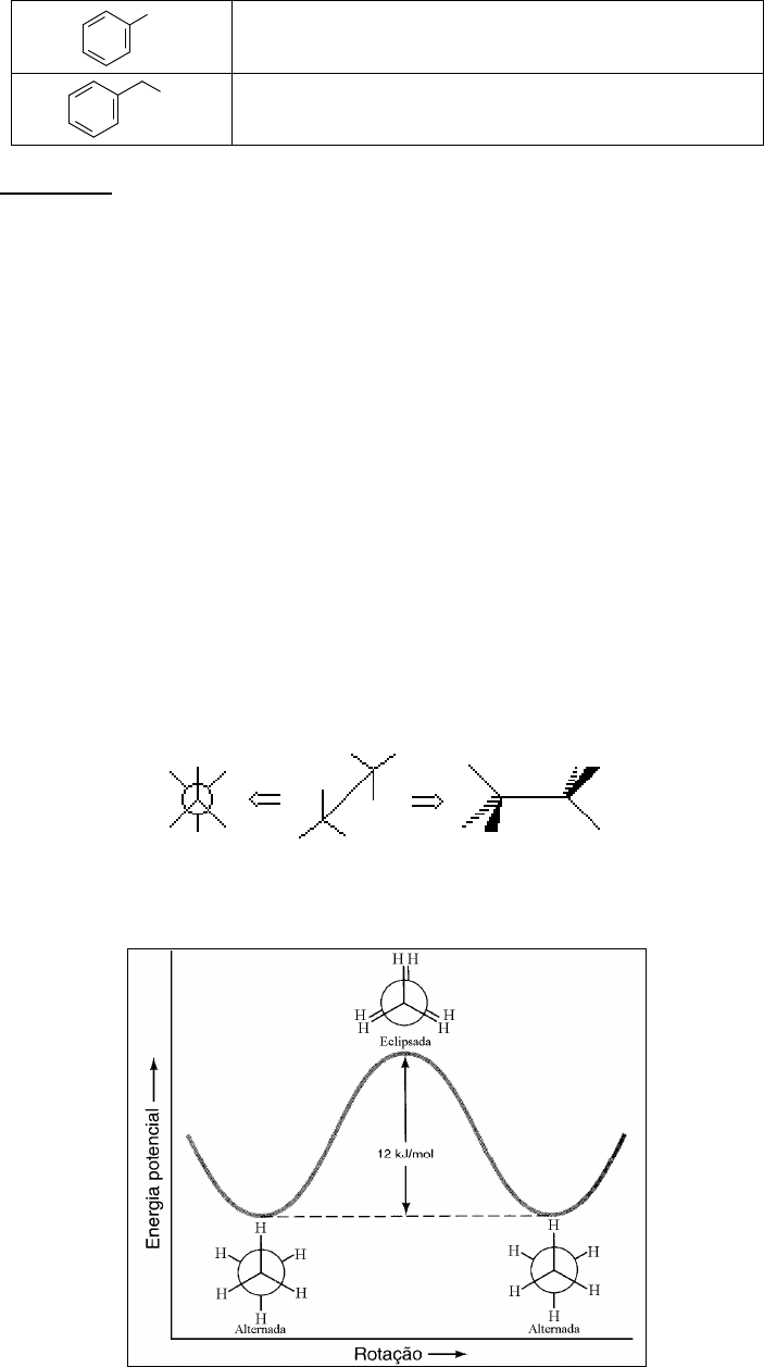 19 Haletos de arila A Convalutamina é um exemplo de um haleto de arila natural. A presença desses compostos está cada vez maior, na medida em que as técnicas de análise se aprimoram e o homem vai cada vez mais fundo nos oceanos e com maior assiduidade. Geralmente, a nomenclatura desses compostos segue a dos hidrocarbonetos aromáticos com a numeração no anel para posicionar os grupamentos substituintes. Cl Clorobenzeno ou Cloreto de fenila Cl Clorometilbenzeno ou Cloreto de benzila VIII – ISOMERIA Isomeria é o nome dado ao fenômeno que envolve substâncias com a mesma fórmula mínima porém, devido a diferenças estruturais, apresentam diferentes propriedades físicas e químicas. São conhecidos os seguintes tipos de isomeria: a – isomeria conformacional – que envolve diferentes conformações da molécula levando em conta o giro livre entre as ligações carbono-carbono e o posicionamento aleatório de cada grupamento dentro da sequência da cadeia. b – isomeria estrutural (envolve a isomeria de cadeia e a de posição) – onde compostos lineares, ramificados ou cíclicos apresentam a mesma fórmula mínima. c – isomeria configuracional (ou geométrica) – está relacionada a compostos que, devido a um impedimento rotacional entre uma ligação carbono-carbono, exibem diferentes estruturas devido ao diferente posicionamento dos substituintes nesses átomos de carbono. d – isomeria funcional – exibem-na os compostos que, possuindo a mesma fórmula mínima, pertencem a funções químicas diferentes. e – isomeria ótica (ou espacial) – os compostos que exibem esse tipo de isomeria possuem ao menos um átomo de carbono com quatro substituintes diferentes, de modo que a mudança no posicionamento dos substituintes pode gerar estruturas diferentes. Isomeria conformacional Fenômeno associado ao giro livre que os átomos de carbono possuem ao longo das ligações simples que os unem. Para estudar-se as conformações que uma molécula pode assumir, deve-se ter uma visão espacial dela. No caso do etano, a estrutura pode ser vista como no caso abaixo. O giro que cada CH3 possui em relação ao outro, gera um sem número de conformações para uma mesma molécula que, em termos de níveis de energia, pode ser ilustrada na Figura VIII.1. Figura VIII.1. Níveis energéticos dos confôrmeros do etano 20 Exemplificando para o n-Butano, os máximos e mínimos relativos aos níveis energéticos das conformações nos fornecem sete estruturas, como pode ser visto na Figura VIII.2. Estas conformações vão se tornando mais complexas e variadas na medida em que o número de átomos de carbono na cadeia aumenta. Um caso já visto é o do Ciclohexano. Moléculas pequenas não costumam ser influenciadas pela conformação de suas cadeias, mas, no caso de moléculas gigantes, como os polímeros, onde é possível encontrar-se mais de 10.000 átomos de carbono na cadeia principal, a forma que a molécula assume pode afetar grandemente suas propriedades físicas, como a transparência, cristalinidade e mecânicas como as resistências ao impacto e à tração. Na Figura VIII.3 estão representados os dois extremos conformacionais de uma cadeia de polietileno. A completamente estendida (linear) e a completamente enovelada. Entre elas, um sem número de conformações são possíveis, passando por estruturas tipo bastão, elipsóide prolato (tipo charuto), elipsóide oblato (tipo lentilha), oval, esfera, etc, como pode ser visto na Figura VIII.4. Figura VIII.2. Níveis energéticos dos confôrmeros do n-Butano Figura VIII.3. Conformações do polietileno Isomeria estrutural Situação já vista, onde substâncias diferentes, possuindo a mesma função química, apresentam a mesma fórmula mínima. Pode ser exemplificado com o n-Butano e o Metilpropano (isomeria de cadeia), que possuem a fórmula C4H10, ou entre o 2-Metilpentano e 3-Metilpentano (isomeria de posição), que se diferenciam pela posição do grupamento metila na molécula. No caso, o posicionamento deferente pode ser também de um grupamento funcional (1-Butanol e 2-Butanol) ou de uma ligação dupla (1-Buteno e 2-Buteno).