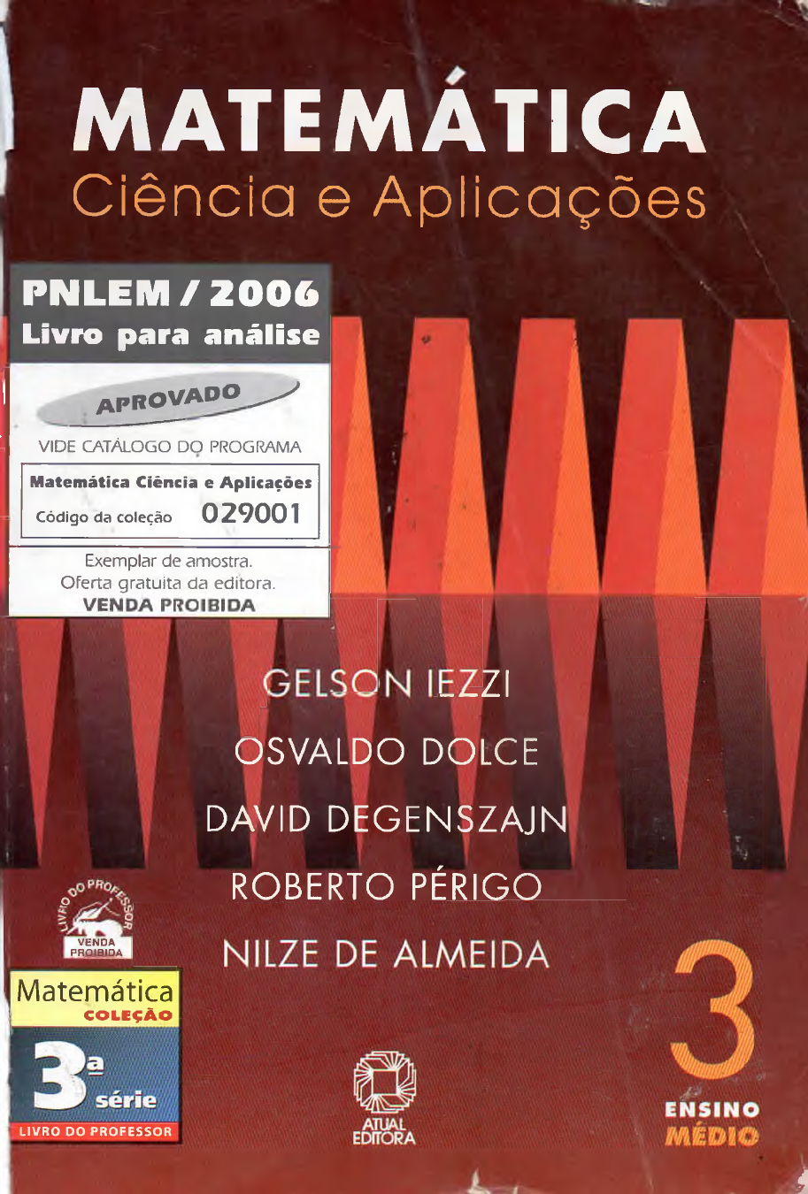 VENDA PROIBIDA Matemática C O L E Ç Ã O LIVRO DO PROFESSOR M A T EM A T IC A Ciência e Aplicações P N L E M / 2 0 0 6 Livro para análise a p r o v a b o ^ VIDE CATÁLOGO DO PROGRAMA Matemática Ciência e Aplicações Código da coleção 029001 Exemplar de amostra. Oferta gratuita da editora. p Oar _.JL\ OSVALDO DOLCE D AVI D DEGENSZAJN ROBERTO PÉRIGO i POR QUE ESCOLHER ESTA COLEÇÃO? C onheça a resenha com pleta desta obra consu ltando o Catálogo do Program a N acional do Livro para o Ensino Médio. V e ja abaixo trechos por nós selecionados: "Os conteúdos selecionados na obra abrangem os que são usualmente tratados no ensino médio, além de uma revisão de assuntos das séries anteriores. Destaca-se, ainda, um capitulo com um bom tratamento da matemática financeira A contextualização está presente nos problemas que envolvem a aplicação da Matemática. Nesse aspecto, o capítulo dedicado á estatística privilegia temas sociais. Merecem destaque as bem elaboradas referências à História da Matemática, que permeiam toda a obra. i Há grande diversidade de representações na apresentação de noções e fatos matemáticos. As linguagens materna e simbólica, acompanhadas de desenhos, ilustrações, gráficos e tabelas são instrumentos de ensino-aprendizagem presentes nos trés volumes da coleção. Em vários momentos do texto, especialmente na introdução de conceitos com base em situaçôes-problema. busca-se uma articulação do conhecimento em foco com os previamente abordados, assim como outros campos da Matemática. (...) A contextualização está presente nos exercícios que envolvem aplicações da Matemática, com ricos exemplos de articulação com outras áreas do conhecimento, com as necessidades culturais e sociais e com o mundo físico. (... | I A linguagem utilizada no livro é adequada ao aluno a que se destina e a linguagem simbólica é utilizada sem exageros. Temas relevantes para a construção da cidadania são apresentados no decorrer do texto, em seções como as dedicadas á História da Matemática, à matemática financeira, á probabilidade e á estatística." 31? QUE ESCOLHER A ATUAL EDITORA ? Com um a com pleta estrutura de atendim ento , a Atual Ed itora oferece total apoio ao trabalho do professor. Estrutura disponível o ano todo: Visite nosso site C - www.atualeditora.com.br Envie seu e-mail____________ atendprof@atualeditora.com.br ATUAL EDÍTORA Visite nossas Salas dos Professores Disponíveis nas principais cidades Ligue grátis__________________ 0 8 0 0 - 1 1 7 8 7 5 http://www.atualeditora.com.br mailto:atendprof@atualeditora.com.br Coleção MATEMATICA Ciência e Aplicações 3 ' Gelson lezzi Engenheiro metalúrgico pela Escola Politécnica da USP Professor licenciado pelo Instituto de Matemática e Estatística da USP Osvaldo Dolce Engenheiro civil pela Escola Politécnica da USP Professor efetivo da rede pública estadual de São Paulo David Degenszajn Licenciado em Matemática pelo Instituto de Matemática e Estatística da USP Professor efetivo da rede particular de ensino em São Paulo Roberto Périgo Licenciado em Matemática pela PUC-SP Professor da rede particular e de cursos pré-vestibulares em São Paulo Nilze de Almeida Mestra em Ensino de Matemática pela PUC-SP Licenciada em Matemática pelo Instituto de Matemática e Estatística da USP Professora efetiva da rede pública estadual de São Paulo Ilustradores: Izomar/Artur Kenji Ogawa 2? edição - 2004 São Paulo ATUAL EDITORA
