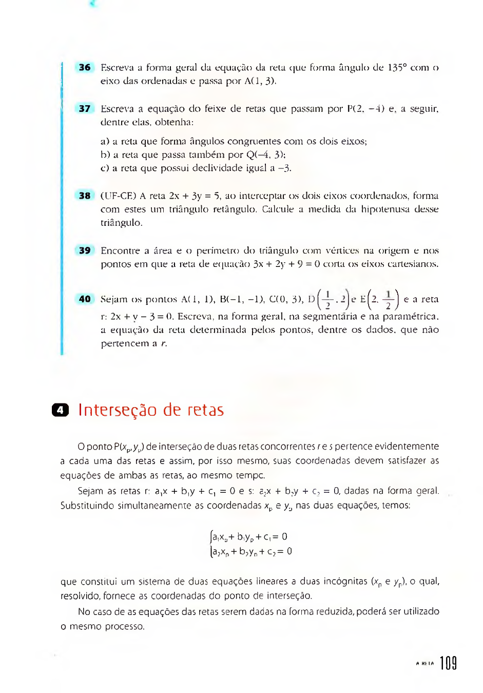 36 Escreva a forma geral da equação da rela que forma ângulo de 135° com o eixo da.s ordenadas e passa por A (l, 3). 37 Escreva a equação do feixe de retas que passam por P(2. -3 ) e. a seguir, dentre elas, obtenha:a) a reta que forma ângulos congruentes com os dois eixos;b) a reta que passa também por Q (M , 3);c) a reta que possui declividade igual a -3 . 38 (UF-CE) A reta 2x + 3y = 5, ao interceptar os dois eixos coordenados, forma com estes um triângulo retângulo. Calcule a medida da hipotenusa desse triângulo. 39 Encontre a área e o perímetro do triângulo com vértices na origem e nos pontos em que a reta de equação 3x + 2y + 9 = 0 corta os eixos cartesianos. 40 Sejam os pontos A(i , i), B ( - l , -1), C(0, 3), D ^ - . 2 j e E^2. - y ) e a retar: 2x + v - 3 = 0. Escreva, na forma geral, na segmentaria e na paramétrica. a equação da reta determinada pelos pontos, dentre os dados, que não pertencem a r. O Interseção de retas O ponto P(xp,yp) de interseção de duas retas concorrentes re 5 pertence evidentemente a cada uma das retas e assim, por isso mesmo, suas coordenadas devem satisfazer as equações de ambas as retas, ao mesmo tempc. Sejam as retas r: a,x + b,y + c, = 0 e s: a2x + b2y + c, = 0, dadas na forma geral. Substituindo simultaneamente as coordenadas xp e ya nas duas equações, temos: |a,xB+ b-,yp + c,= 0 [a?xp+ b 7yn+ c 3= 0 que constitui um sistema de duas equações lineares a duas incógnitas (xp e yp), o qual, resolvido, fornece as coordenadas do ponto de interseção. No caso de as equações das retas serem dadas na forma reduzida, poderá ser utilizado o mesmo processo. A KM A 109 -lÜicamplã 1 Para achar o ponto I de interseção das retas r:2x + 5 y - 3 = 0 e s: x - y + 2 = 0,devemos simplesmente resolver o sistema + 5y - 3 - 0 [x - y + 2 = 0 Isolando x na equação de s e substituindo esse valor na equação de r, temos: 2(y - 2) + 5y - 3 = 0 => y = 1 e então x = - 1 Assim, o ponto de interseção entre r e s é l(-1, 1). exemplo 2 Sejam as retas r e s, dadas na forma reduzida r: y = 2x — 3 e s: y = 3x - 5. Para interceptá-las, basta igualarmos os valores de y das duas equações. Assim: 2 x - 3 = 3 x - 5 = > x = 2 A seguir, substituímos x = 2 em qualquer uma das equações: y = 2 - 2 — 3 => y = 1 e (2, 1) é o ponto de interseção entre r e s. r «emplo 9 Na figura abaixo, a reta que passa por A(1, —2) e B(—2, 4) intercepta em P a reta s,que, além de passar por C(4, 0), forma com os eixos coordenados um triângulo retângulo isósceles. Vamos determinar as coordenadas de P: Inicialmente chamemos de r a reta que passa por A e B e determinemos sua equação (y = mx + n) através do sistema I -2 = m + n 14 = -2m + h, que fornece m = - 2 e n = 0 . Assim, r é dada pela equação y = - 2x. Por outro lado, como forma com os eixos um triângulo isósceles no 4<?quadrante, s corta o eixo y no ponto de orde nada -4 , a qual nos fornece o valor de n: n = -4 . Para determinarmos m, basta aplicarmos à equação y = mx + n as coordenadas do ponto C: 3 = 4m + n => 0 = 4m - 4 => m = 1. Temos, então: J' ̂ ^ [s: y = x - 4 Resolvendo o sistema obtido, temos x. 4 8 J 4= T ‘ p = " T M A IPM ÁIICA : C lfN Ç IA E APUCAÇfiES G 41 42 43 44 45 46 47 48 49 50 51 52 53 O G G Q O G O O BObtenha o ponto de interseção das retas 3x - y + 5 = 0 e 2x + 3y -2 = 0. As relas de equações 3x - y - 4 = 0 e y = 2x + k interceptam-se no ponto (k + 4, 11). Determine o valor de k. Ache o ponto de encontro das retas de equações 3 — 2x = 3y + 2 e x yEncontre as coordenadas do ponto P incii- 3cado no gráfico ao lado. 0 • P-1 1 3 X Verifique se as retas 4x - y - 3 = 0. 3x - y - 1 = 0 e y = 5x - 5 interceptam- se no mesmo ponto. Em caso afirmat.vo, qual seria esse ponto? Ache os vértices do triângulo cujos lados estão sobre as relas de equações y = 2x + 1. y = x + 4 e y = - x + 3. A seguir, verifique se o triângulo é retângulo. (Fuvest-SP) As retas de equações x + v - 1 = 0, kx + y — 2 = 0 e x + ky — 3 = 0. concorrem num mesmo ponto. Nessas condições, calcule o valor de k. (PUC-RS) Um triângulo ABC tem como vértices os pontos A(2, 1), B(0, 3) e Cf—1, 1). Determine as coordenadas do baricentro (ponto de encontro das medianas) desse triângulo. Determine o ponto de interseção das retas r-. íx = 1 + t, íx = 9 — 2 t,i 1 e i'.q *. \y = 7 - 3 I, ly =-2 + uOs pontos A(2, -3), B(-2, 3), Cf l , l )e D (-4, - D são vértices de um quadrilátero. Determine as coordenadas do ponto de encontro das diagonais desse quadrilátero. Qual é a condição sobre k para que as retas de equações x + y + 1 = 0, x + ky - 3 = 0 e 2x + 4y - 1 = 0 formem um triângulo? Determine o valor de p de modo que as relas de equações y = 2x + p e px - y + 3 = 0 sejam paralelas. Qual é a condição sobre p para que as retas de equações y = px + 4 e 6x -2y + H = 0 tenham mais de um ponto comum? A K- IA