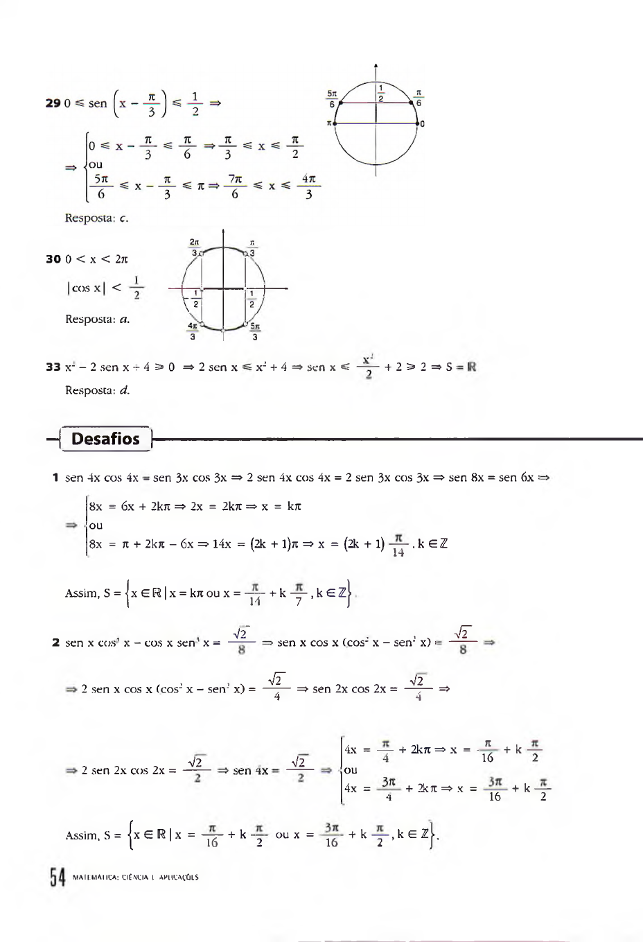 30 0 < x < 271cos x <Resposta: a. 2* 3 a K X3 1 1 1 ) \ 2 2 4rc ■ 5it 3 333 x' — 2 sen x -r 4 3= 0 => 2 sen x xJ + 4 => sen x =S - 1-— t 2 5 2 =» S :Resposta: d. —| Desafios 1 sen 4x cos 4x - sen 3x cos 3x => 2 sen 4x cos 4x = 2 sen 3x cos 3x => sen 8x = sen 6x :8x = 6x + 2k7t => 2x = 2k7t => x = kit ou8x = k + 2krc - 6x =? I4x = (2k + 1)ti => x = (2k + l) -y y -. k G Z Assim, S = jx G IR | x = krc ou x = -yy- + k - y - , k G z j V2" 2 sen x cos1 x - cos x sen x = sen x cos x (cosJ x - senJ x) > ■ ã , , -JT V22 sen x cos x (cos- x - sen- x) = — :— => sen 2x cos 2x = — ;— =>4 h 2 sen 2x cos 2x = V2 V2 4x = — + 2k7t => x = - .n, + k ~ou 4x = 16+ 2k7t = > X = + k — •t 16 2 Assim, S = íx G IR | x = - 77- + k ou x = + k , k G Z[ 16 2 16 2 M AlüM ÀI ICA: C lf NUA L AVllCA^CltS 3 a) x * 0. -1 « X~,+ 4 € 1 4xx" + 4 __ _ i ^ x 2 + 4x + 44x 4 X (x + 2)' = 0 = 3* 0 => 4 X x = - 2 oux > 0 ex = 2 ou x < 0 x + 4 4xComo -1 =£ cos y *= 1, também ocorre -1 ^ - cos y =s i ; assim:? J£ 1 ± Í sg l => — (* - 2Í 4X «0=> = » X = ±2 b) x* + 4x cos y + 4 = 0 = > x 2 + 4 = - 4 x cos y =>"- cos y = -1 =s x + 4 =s 1 => x = 4 2 4 X1?) x = 2 => -co s y = 1 => cos y = — 1 => y = (2k + 1 )7t, k E 2 2?) x = -2 => -co s v = -1 => cos y = 1 => v = 2 krc. k E Z. - ( i ) ........— * 'a) 2 ' í 21 => —cos 2x s I =} cos 2x & —1 (ocorre sempre)b) 2 > 2‘ => -cos 2x > 1 => cos 2x < -1 (nunca ocorre)c) 2~:rj’ ~' =s 2” => -co s 2x 0 => cos 2x s= 0n 2 3* 25 \ 3 sen x - COS x ^ 1 => (V3 sen x - cos x) < * v3 1=> —-— ■ sen x — — cos x J _ _ 2 O ^ x - - K Kcos — ■ sen x - sen —— 6 6 CCi*i V $ ~)K _ K _ ^ ____ “ TC—— « X ----— « 2 jt= > JtS x S 2 n -r ----6 6 6 ( n ) . \ l 6 ) 1 Assim. S = jx E IR | 0 =£ x -- ̂ ou rt =s x 27t| / _ \ / _ \ 6 cos2 + - - - J + cos- |^x----— J = 1 ( K => ̂COS X cos — sen x sen r j , ( K ,+ | cos x c o s ------ 1- sen x senV 3 f h 1 => B1 V3— cos x ------ -— sen x + — cos x + v -— sen x | = 1 =»l 2 2 ) I V3 3 , 1 . v3 3— cos- x ------ -— sen x cos x + —r- sen- x + — cos- x -t----- -— sen x cos x + — sen- x = 1-i 2 4 -i 2 -icos- x + -y- sen2 x = 1 =* cos2 x + 3 sen2 x = 2 => cos2 x + sen2 x + 2 sen2 x = 22 sen2 x = 1 => sen- x = - sen x = ± \2 x = - - + k — , k £ Z4 2 UANl AL OC) 1'kLlf h SSRR 55 RETOMANDO AS FUNÇÕES TRIGQNQMÉTRICAS_ _ _ _ _ _ _ _ _ _ _ _ _ —| Exercícios ]-------------------------------------------------------------- 2k12 período: p = it = —g— => b = 2Imagem: Im = [—4, 2] =* 2 - ( - 4) = |a| [l - (-1)] =» |a| = 3 =* a = -3 => f'(x) - a • sen (bx + c) leria como imagem o conjunro 1-3. 31.Como Im, = [-4. 2], vem d = -1 . 19 f(x) = sen íx + -y - J cos í x --— J = cos x • sen x; f(x) = 0 quando x = ̂ ? K , k £ Z 27 período: p = = —K => Ibj = 4 => b = ±4 2 b 1Imagem: Im = [-2, 6J => 6 — (-2) = a| - [1 — (-1)] => |a| = 4 W a = 4 => f'(x) = a cos (bx + c) teria como imagem o conjunto [-4, 4]. Como Im, = [-2, 6), vem: -d = 2 e d = -2 . 32 f: A — IR I fCx) = 1 + 2 tg - - - ; A = 0 =S x « =* 0 * - f - « - J - ^ O í l g y S U => 0 « 2 Ig y - « 2 ^ 1 S 1 + 2 Ig y ~ S 3 =>=> 1 « f(x) « 3 =» lm, = [1. 31 39 f(x) = sen x cos x = — • 2 sen x cos x = —E- sen 2x O valor máximo de f(x) é —y \ para esse valor ser obtido, é necessário que sen 2x = 1 => => 2x = + 2kit => x = - - - + kit, k G Z .2 4 40 f(x) = lor sen x • , - 7 , . 7 ,K3) = k • 3‘ • sen 3 = -2 =» k = ——=— - => í(x) = — - —-—— ■ x- sen x9 sen 3 9 sen 3f(-3) = - „ 2 , • (-3)- • sen (-3) = 2 9 sen 3Assim, 2f(3) + 5f(-3) = -4 + 10 = 6. MAfFMAIICA: CIÊNCIA F AP! ICAÇflFS