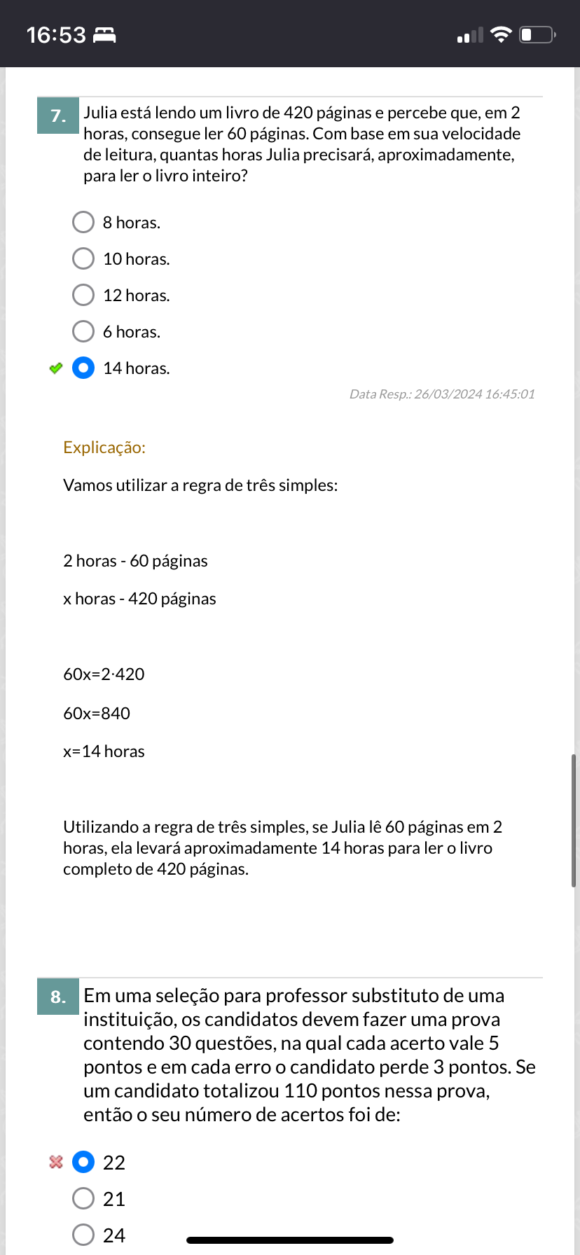 7. Julia está lendo um livro de 420 páginas e percebe que, em 2 horas, consegue ler 60 páginas. Com base em sua velocidade de leitura, quantas horas Julia precisará, aproximadamente, para ler o livro inteiro? 8 horas. 10 horas. 12 horas. 6 horas. 14 horas. Data Resp.: 26/03/2024 16:45:01 Explicação: Vamos utilizar a regra de três simples: 2 horas - 60 páginas X horas - 420 páginas 60x=2.420 60x=840 x=14 horas Utilizando a regra de três simples, se Julia lê 60 páginas em 2 horas, ela levará aproximadamente 14 horas para ler o livro completo de 420 páginas. 8. Em uma seleção para professor substituto de uma instituição, os candidatos devem fazer uma prova contendo 30 questões, na qual cada acerto vale 5 pontos e em cada erro o candidato perde 3 pontos. Se um candidato totalizou 110 pontos nessa prova, então o seu número de acertos foi de: 22 21 24