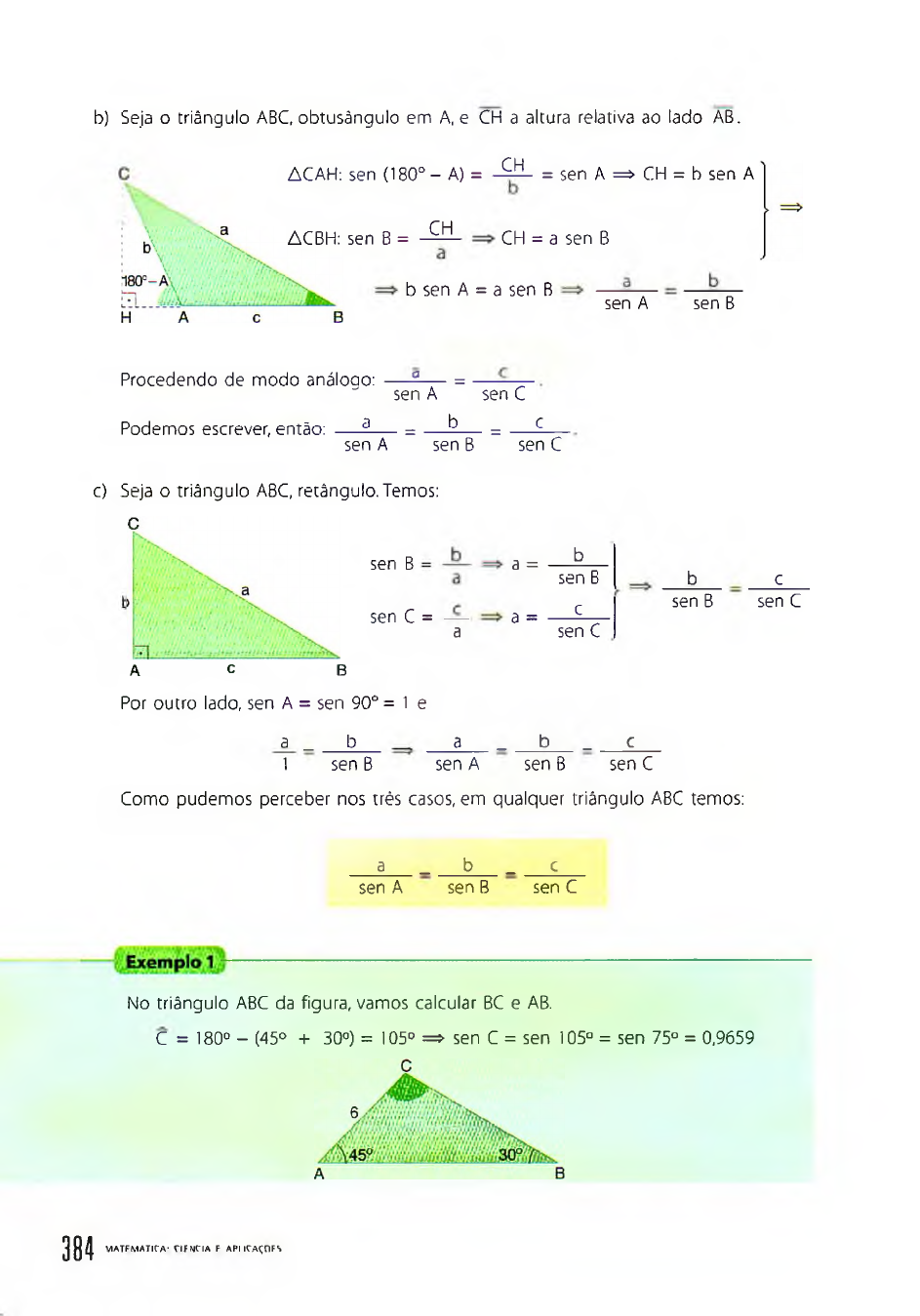 b) Seja o triângulo ABC, obtusângulo em A, e CH a altura relativa ao lado AB. ACAH: sen (180o- A) = CH = sen A => C.H = b sen A ACBH: sen B = CH CH = a sen B b sen A = a sen B sen A sen B Procedendo de modo análogo: — 2— = —sen A sen C Podemos escrever, então: — —̂ = — Í2— = — Ç— sen A sen B sen C c) Seja o triângulo ABC, retângulo.Temos: sen B sen C = — a a c b Por outro lado, sen A = sen 90° = 1 e a = a = b sen B c sen C b sen B a _ b a _ b _ c 1 sen B sen A sen B sen C Como pudemos perceber nos três casos, em qualquer triângulo ABC temos: a _ b _ c sen A sen B sen C No triângulo ABC da figura, vamos calcular BC e AB. C = 180° - (45° + 30°) = 105° => sen C = sen 105° = sen 75° = 0,9659 384 MATFMATICA- nFN C IA F APIICAÇnFS C sen C Escrevemos: 6 __ BC = AB => _ 6 _ = BC = AB => sen 30° sen 45° sen 105° 0,5 0,7071 0,9659 => BC = 8,4852 e AB = 11,5908 E x e m p lo 2 Na figura, sendo x a medida do lado ÊF do triângulo, D podemos determinar os outros dois lados em função de x; basta utilizar a lei dos senos. Assim: x X DE DF _ 50°sen 60° sen 50° ' sen 70° Jl O m II X sen 50° sen 60°. - e DF = x • sen 60 , F FDE = 180°- (70' 0,3845 I.0S50 G O G Q G O O O O Q Consulte a tabela quando necessário.1 Num triângulo ABC são dados B = 60°, C = 45° e AB = 8 cm. Determine o comprimento de A C . 2 3 4 Resolva o triângulo ABC, retângulo em A, com hipotenusa de medida 5 cm e ângulo B de 35o- Determine a medida do ângulo x. av2 x a 45'/No triângulo ABC da figura, determine as medidas de AB e BC.B A , 14° 140' 12 C ktSCUUÇÃÜ 0£ TRlAKCiUinS 5 Encontre os ângulos B e C de um triângulo ARC em que A = 15°, '3 2sen B - — e sen C = v~ . Em seguida, determine a medida do ladoAB, sendo AC = 3 cm. 6 Calcule o perímetro do quadrilátero ABCD abaixo. D 7 (Mauá-SP) Num triângulo ABC, temos AC = 3 m, BC = 4 m e a = BAC.a) Se AB = 3 m. calcule cos a.b) Noutra hipótese, sendo 3 = 6ü", calcule sen u. C 3 m 4 m O Lei dos eossenos ou teorema dos eossenos Em todo triângulo, o quadrado de qualquer um dos lados é igual à soma dos quadrados dos outros dois, diminuída do dobro do pro duto desses lados pelo cosseno do ângulo por eles formado. Demonstração: a) Seja o triângulo ABC, acutângulo, e CH = h a altura relativa ao lado AB. Mas m = b cos A. Assim: a2 = b + c2 - 2bc cos A Analogamente, podemos escrever: b = a; + c2 - 2ac cos B A BCH: a2 = h2 + (c - m)2l => A ACH: h2 = b2 - nv J => a2 = b2 - rrv + c2 - 2cm + nv => => a2 = b2 + c2 - 2cm e c2 = a2 + b ' - 2ab cos C M M tM A U C A : l'IFN D A E APU C a ÇÚLS